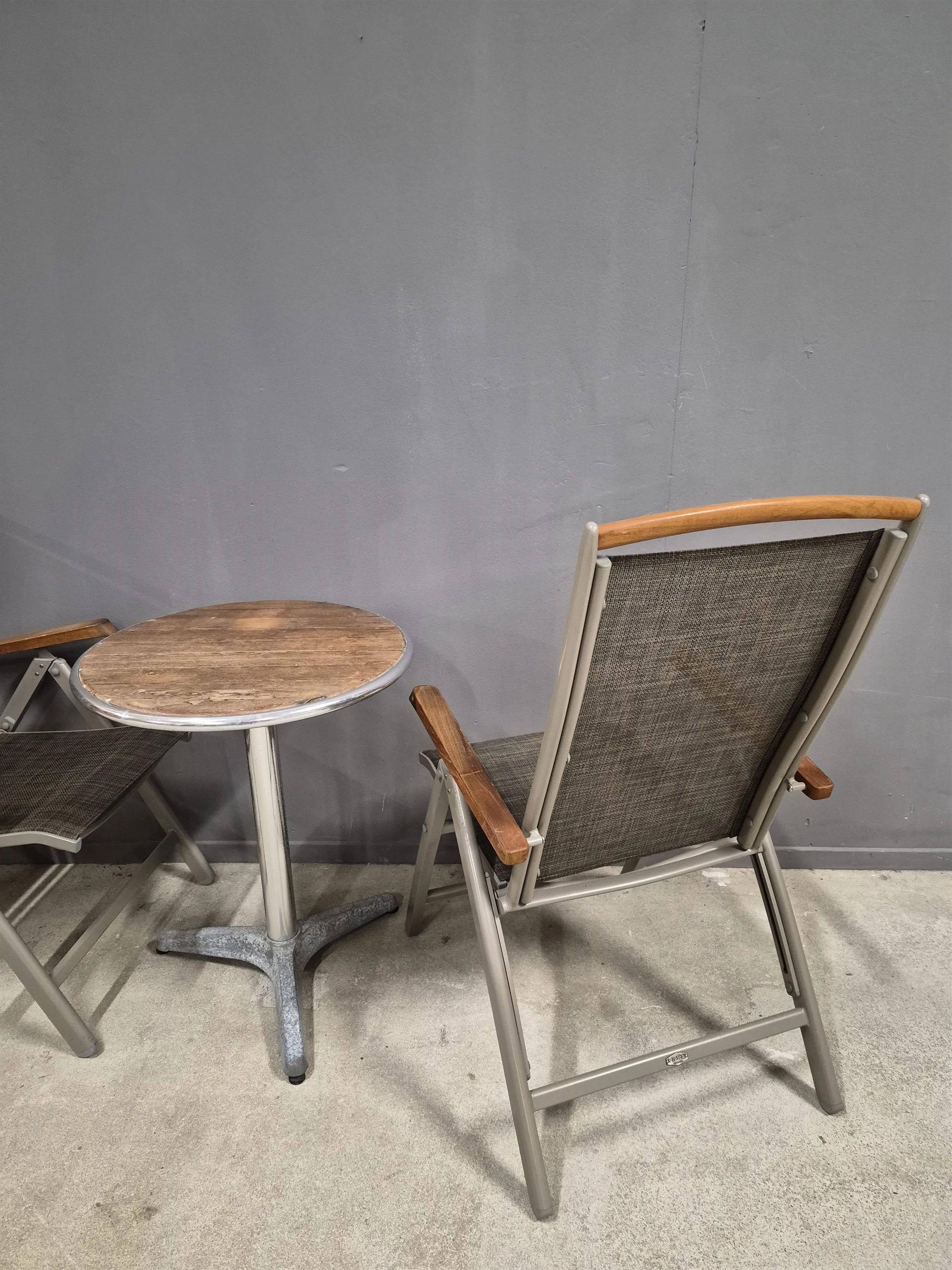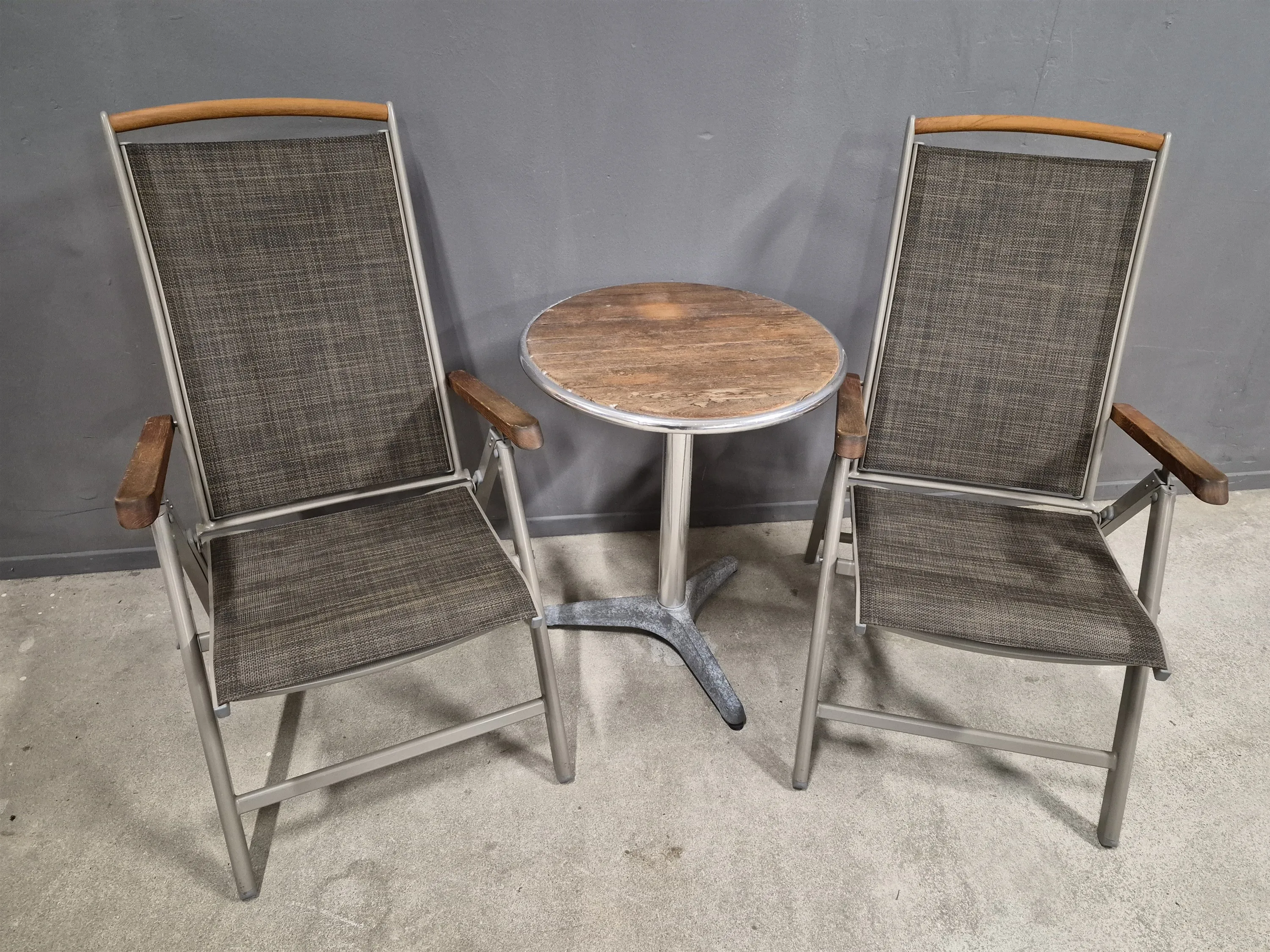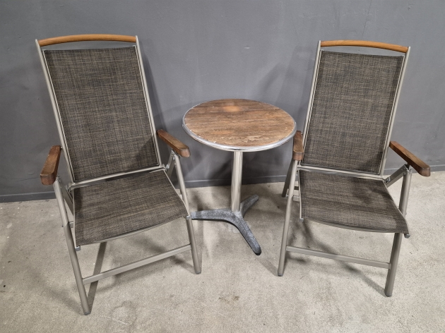 18346. Solstolar 1 par, lättmetall Brafab & bord höjd stolar 110 cm fällbara