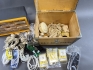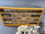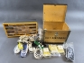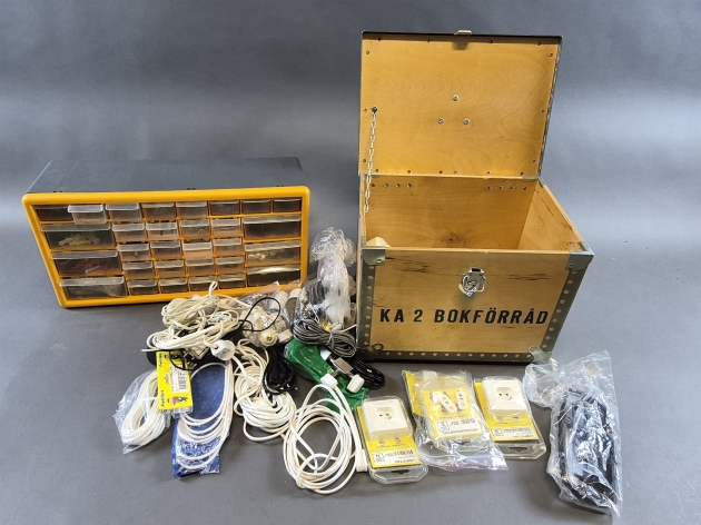 20588. Sortimentslåda med innehåll, elföremål & plyfalåda KA 2 Bokförråd höjd 28 cm
