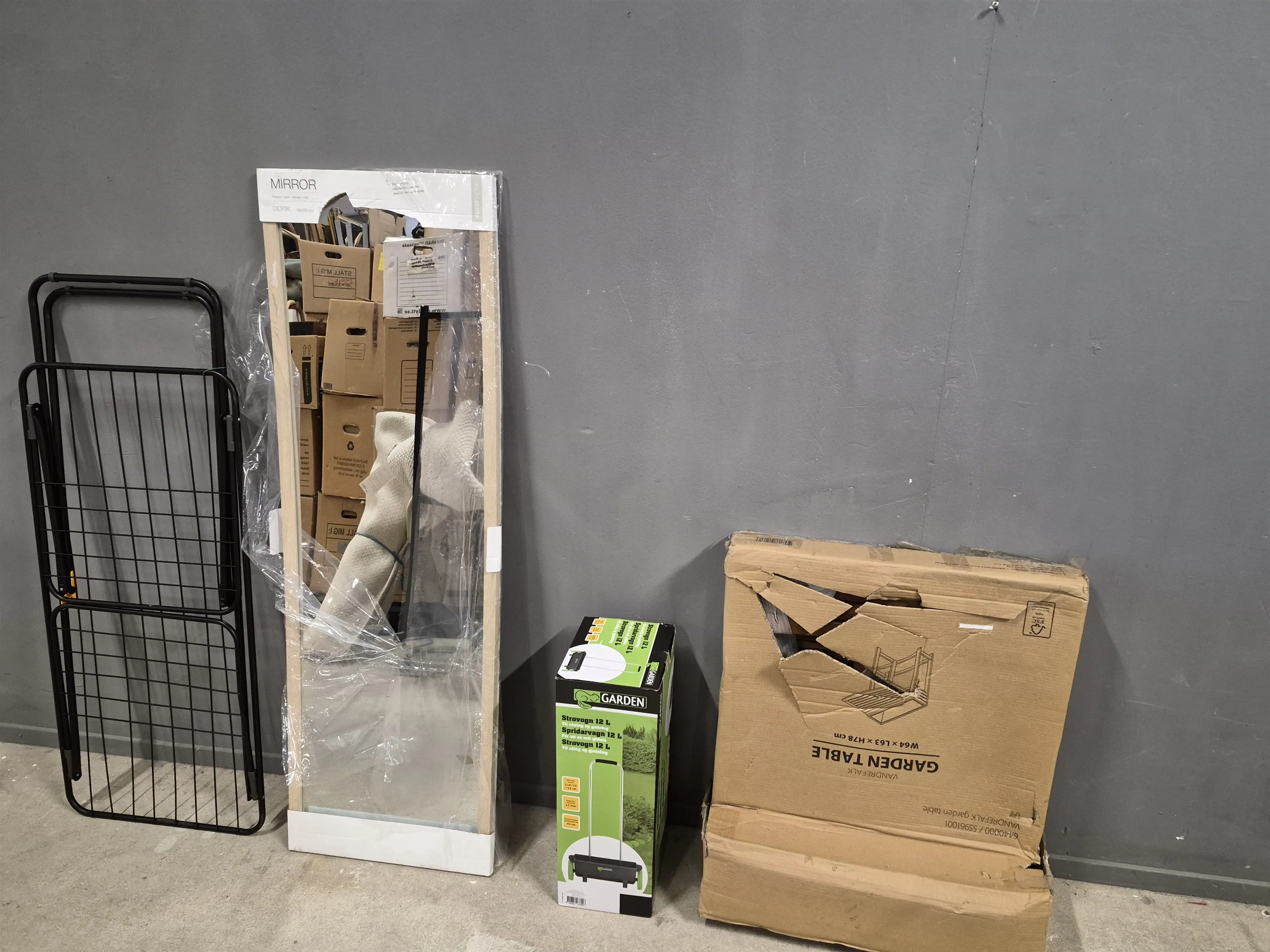 20800. Spegel med bläckkladd, trädgårdsbord & spridarvagn, tvättställning högsta 150 cm