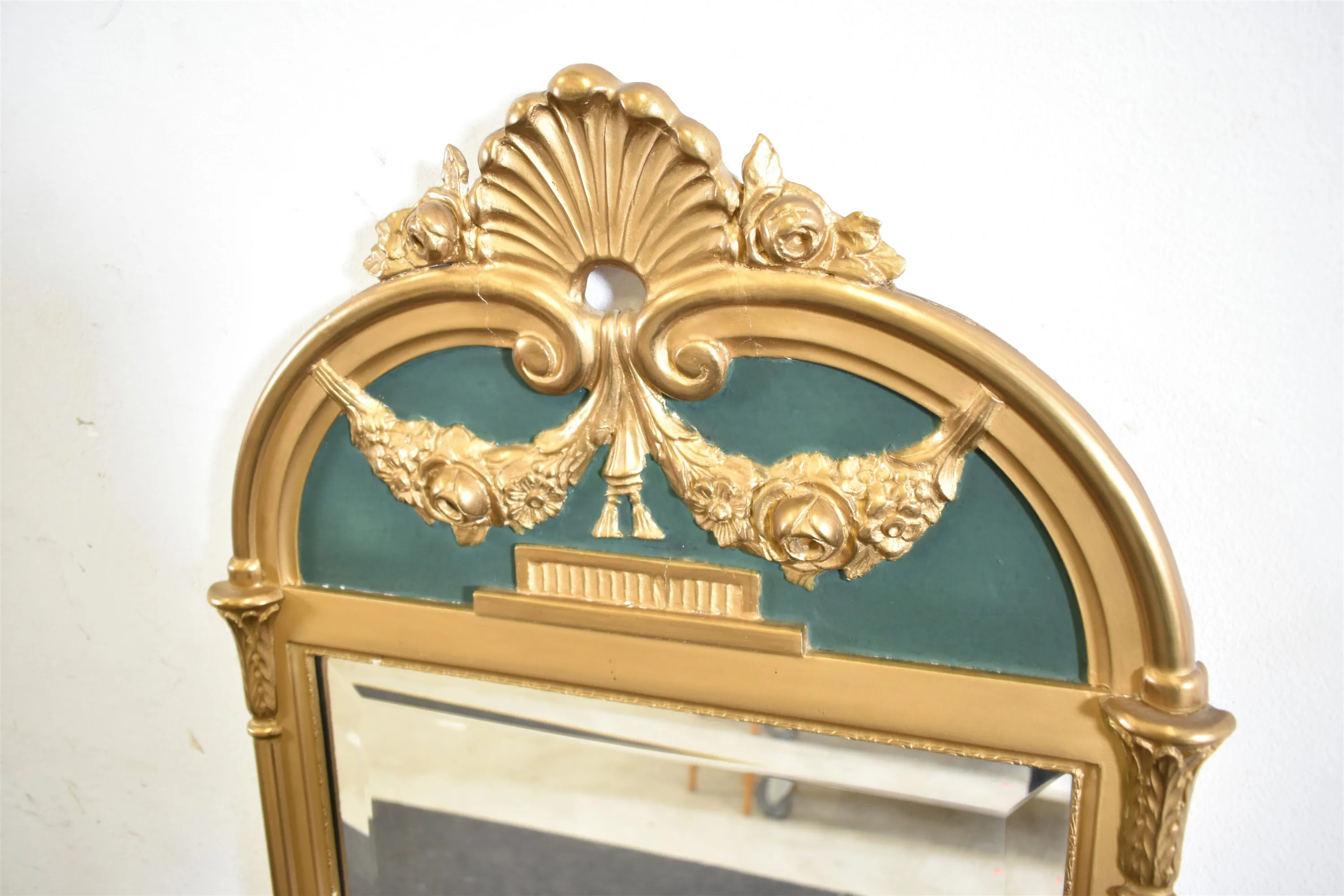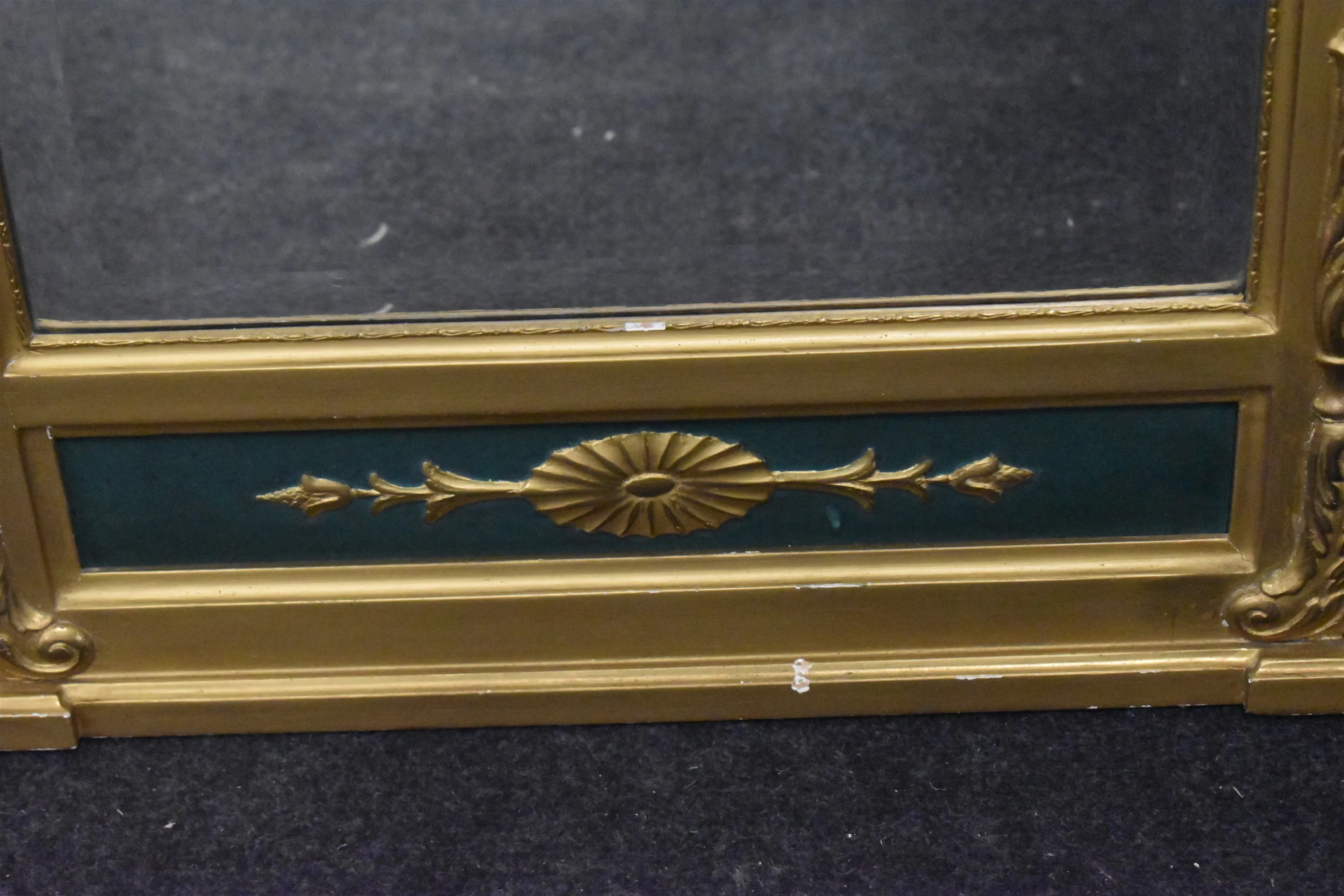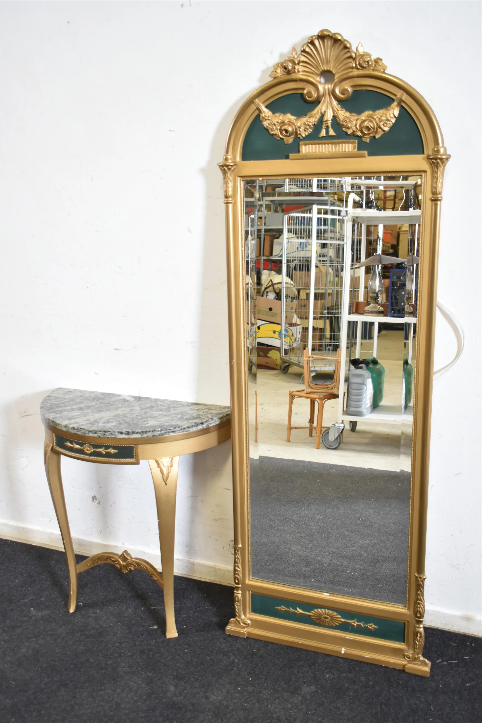 15150. Spegel med underbord och marmorskiva, förgylld, höjd på spegel 150 cm, bredd 49 cm