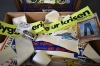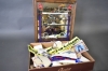 7723. Spegeltavla och låda med klistermärken, mått på tavla 61x50 cm