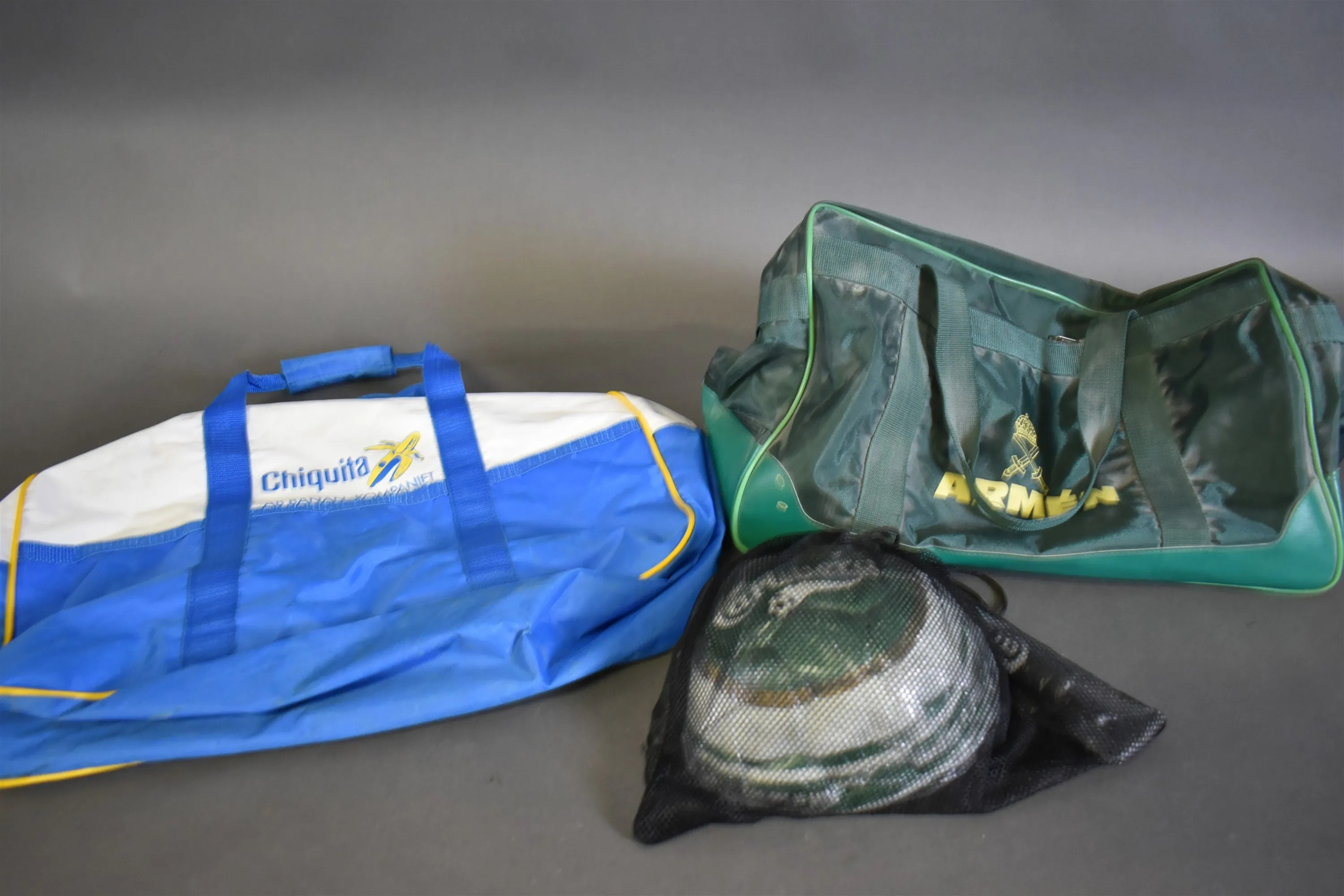 16338. Sportbagar 2 st och fotboll med tryck, Carlsberg, Chiquita och Armen, längsta mått 64 cm