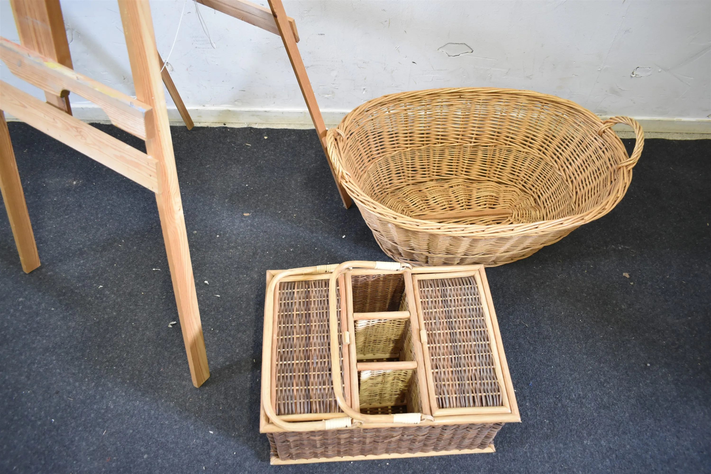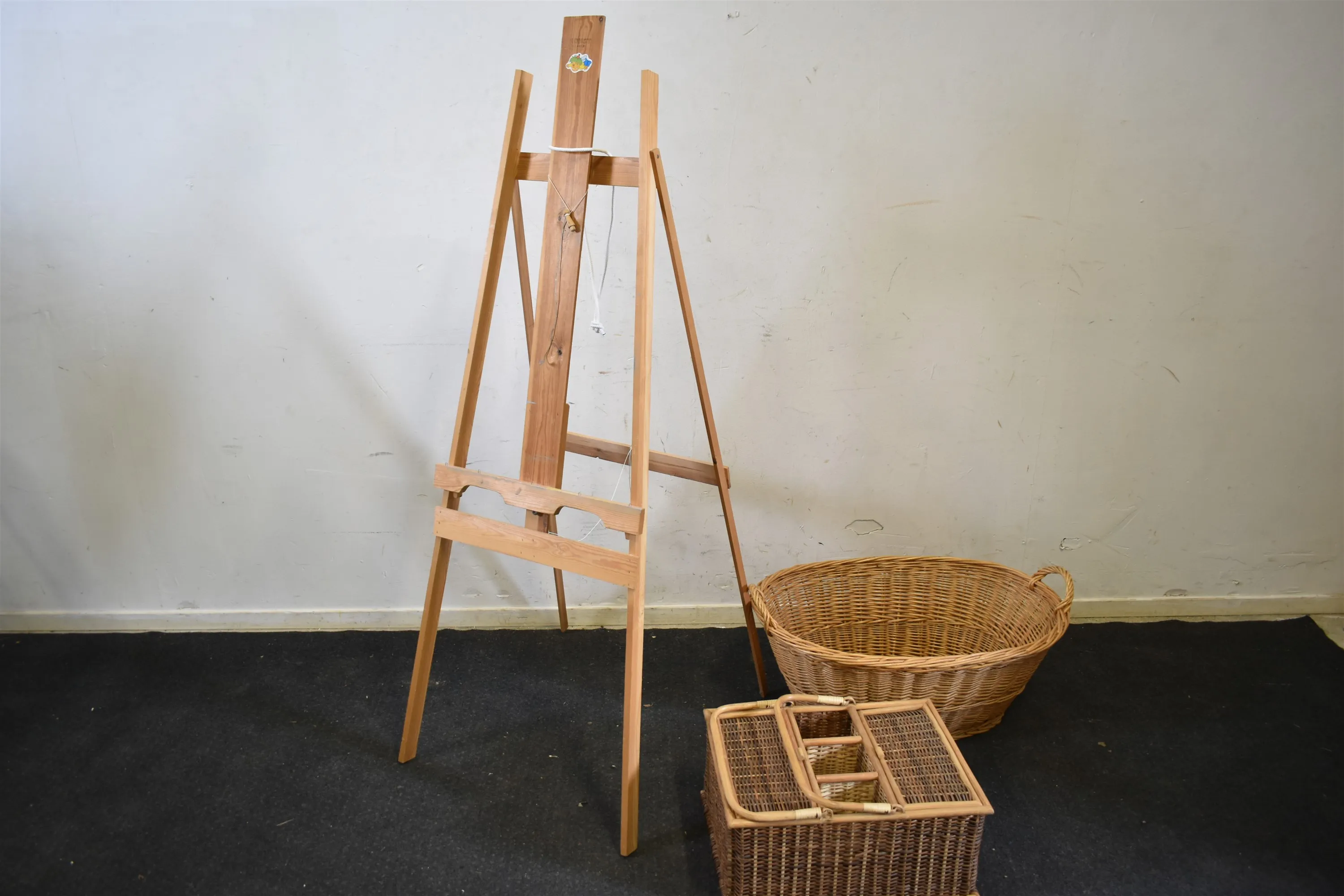 4495. Staffli och korgar, bl.a picknickkorg, högsta höjd 170 cm