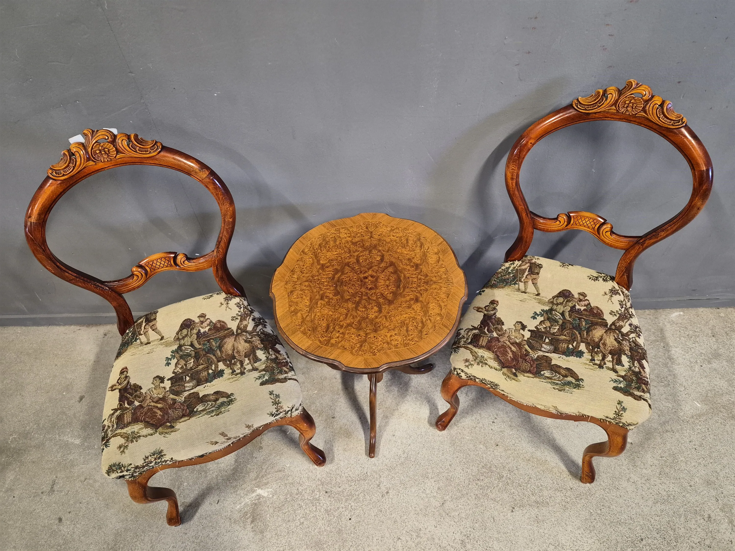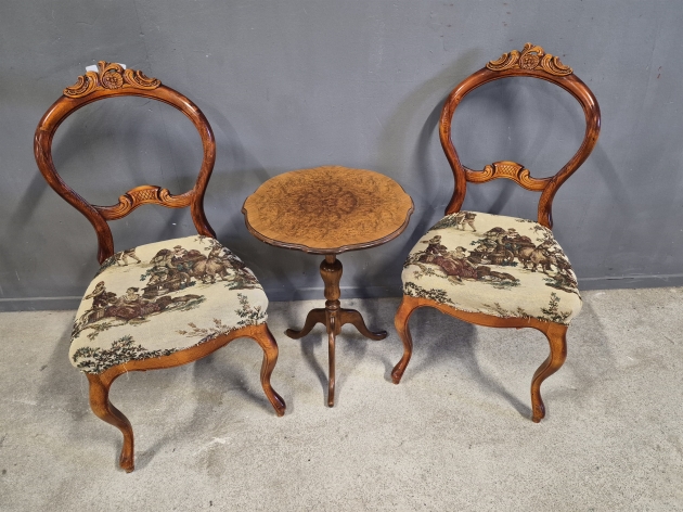 19641. Stolar 1 par rokokostil & pelarbord rotfaner, högsta 94 cm