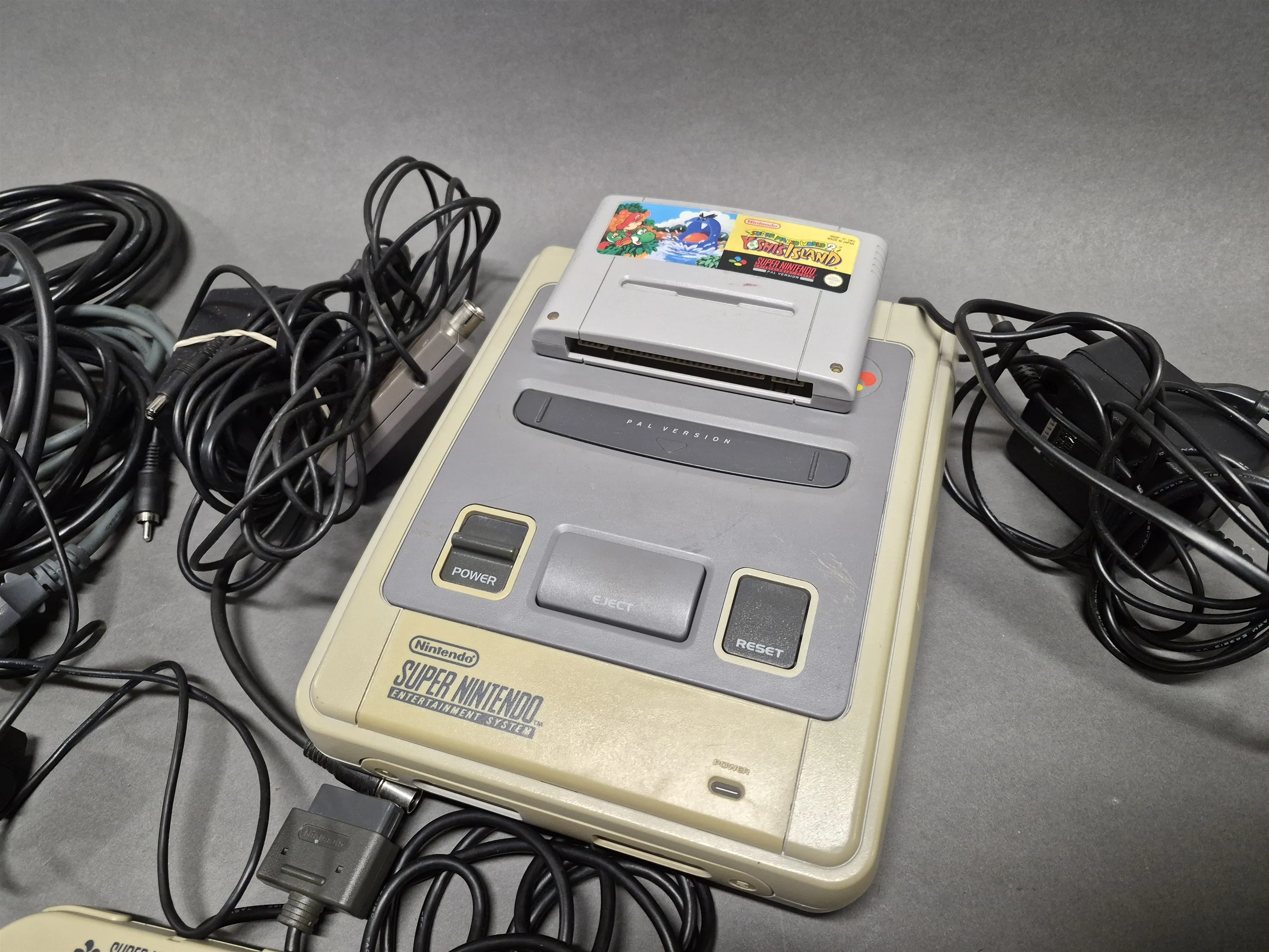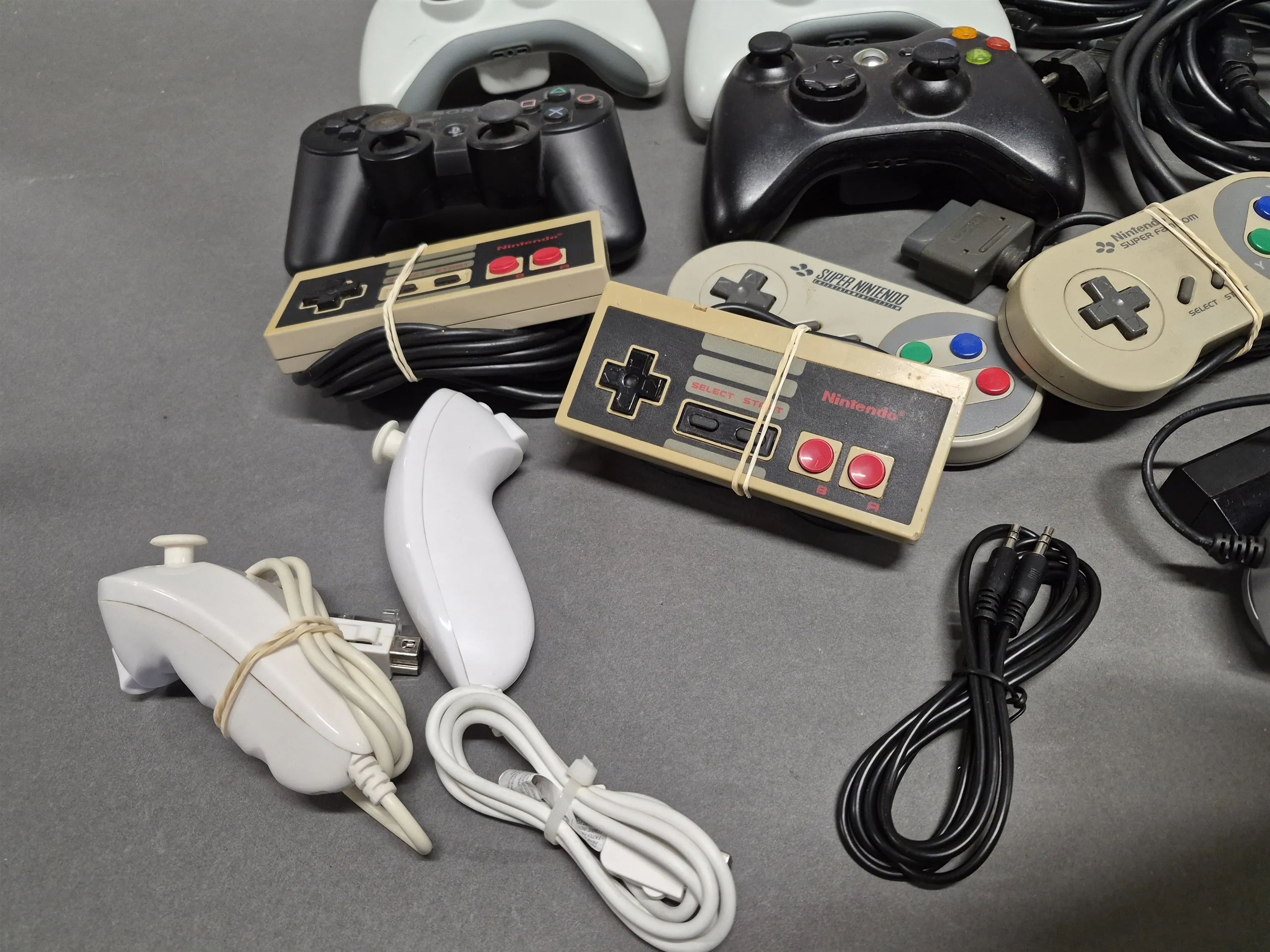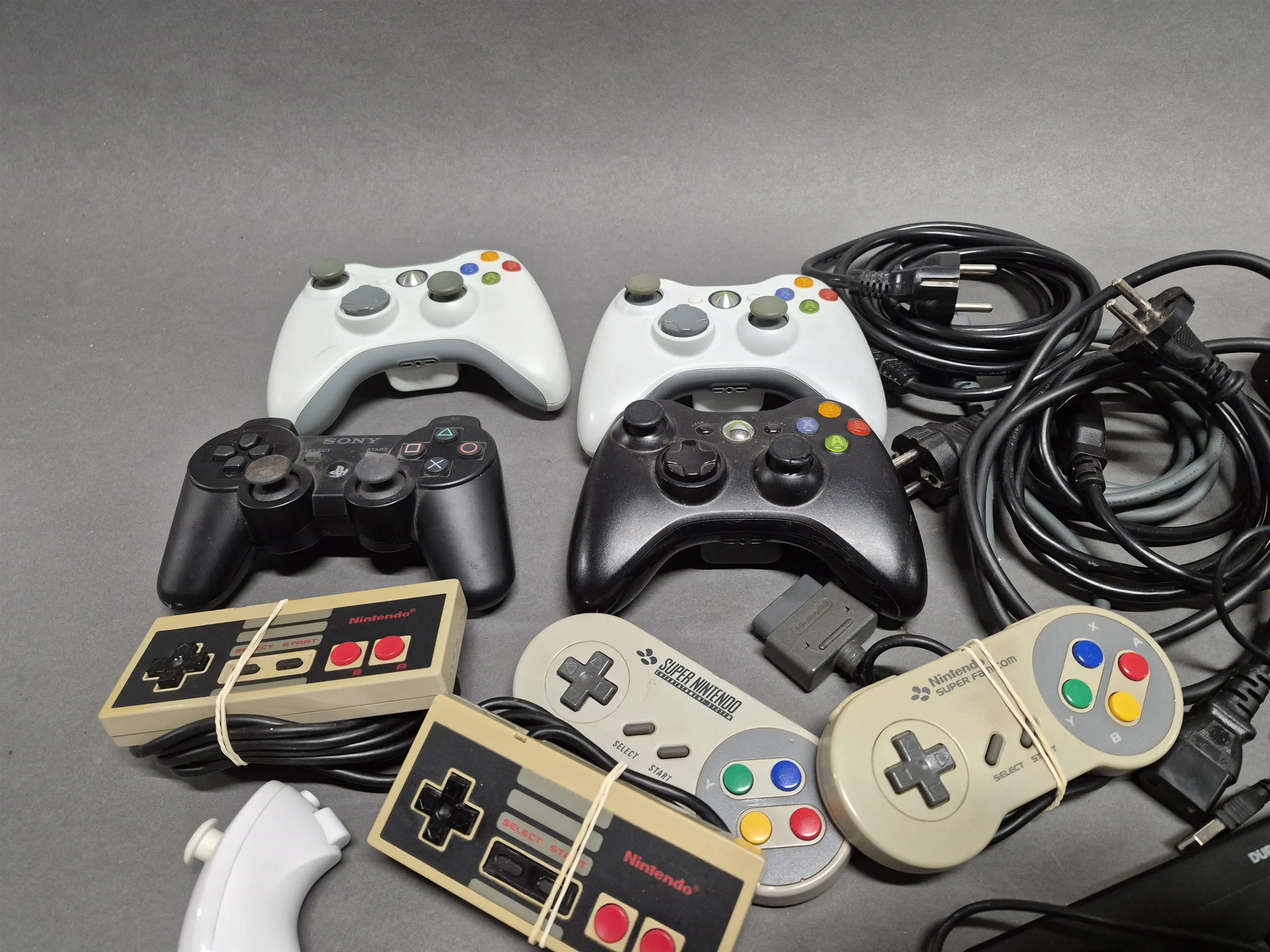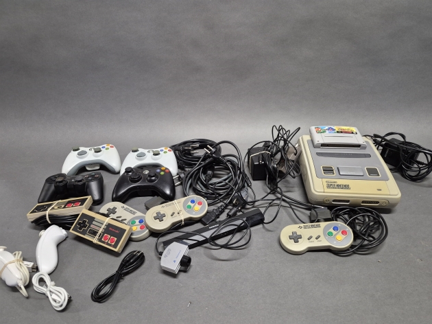 17659. Super Nintendo SNES konsol och kontroller bla Xbox, ej testat eller genomngånget