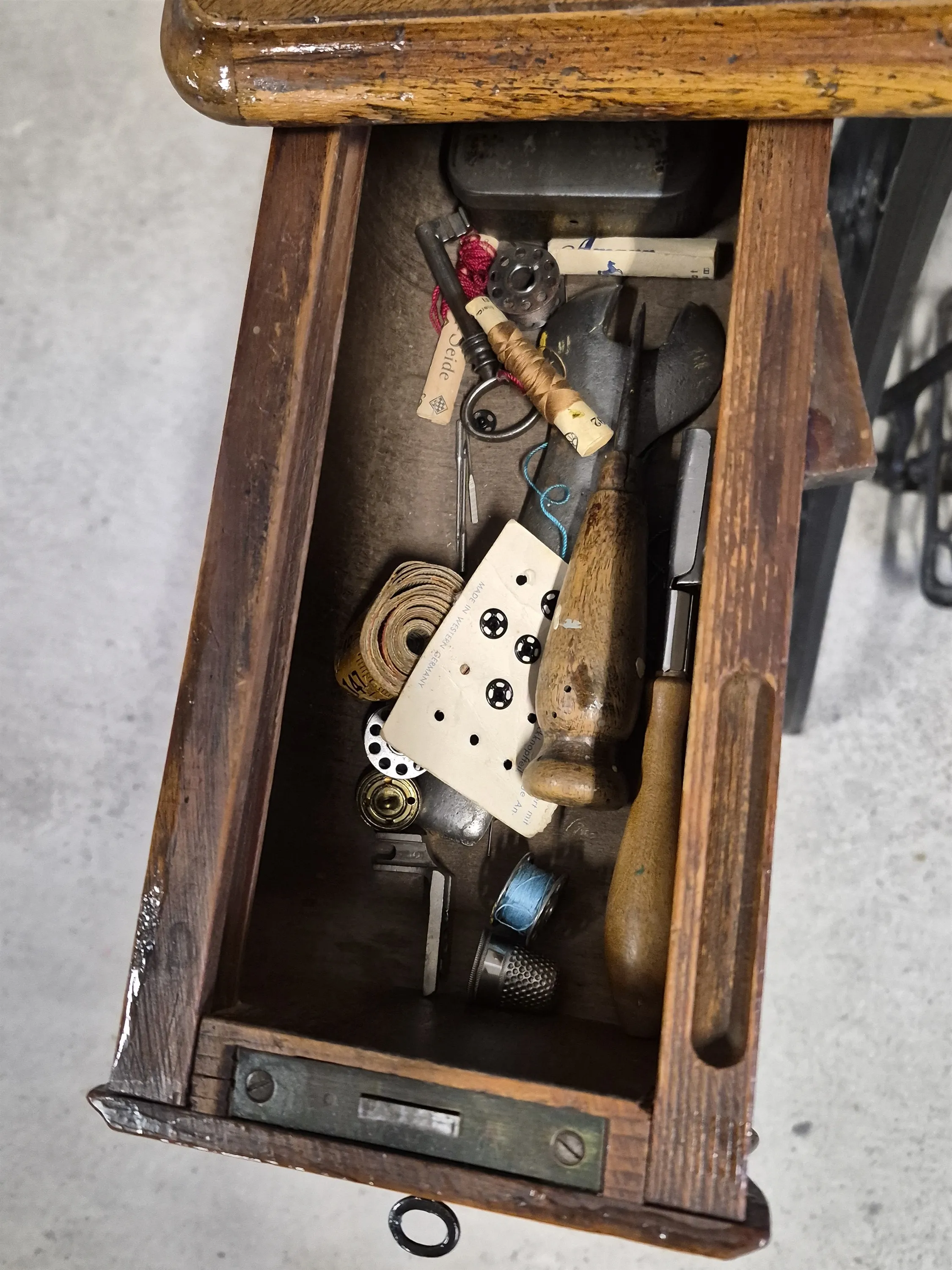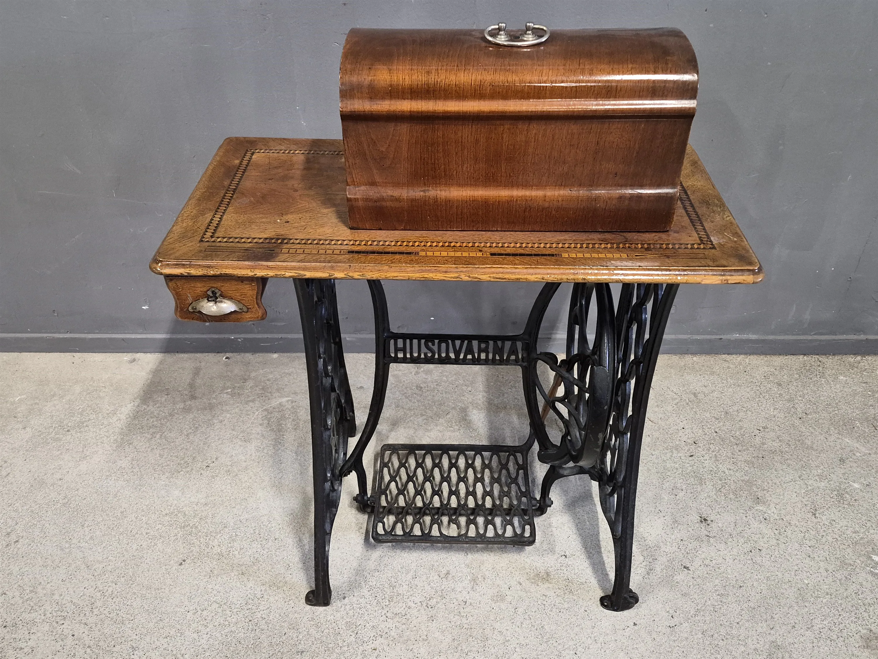20826. Symaskin på metallunderrede, Husqvarna, höjd 103 cm, mått 43 x 83 cm