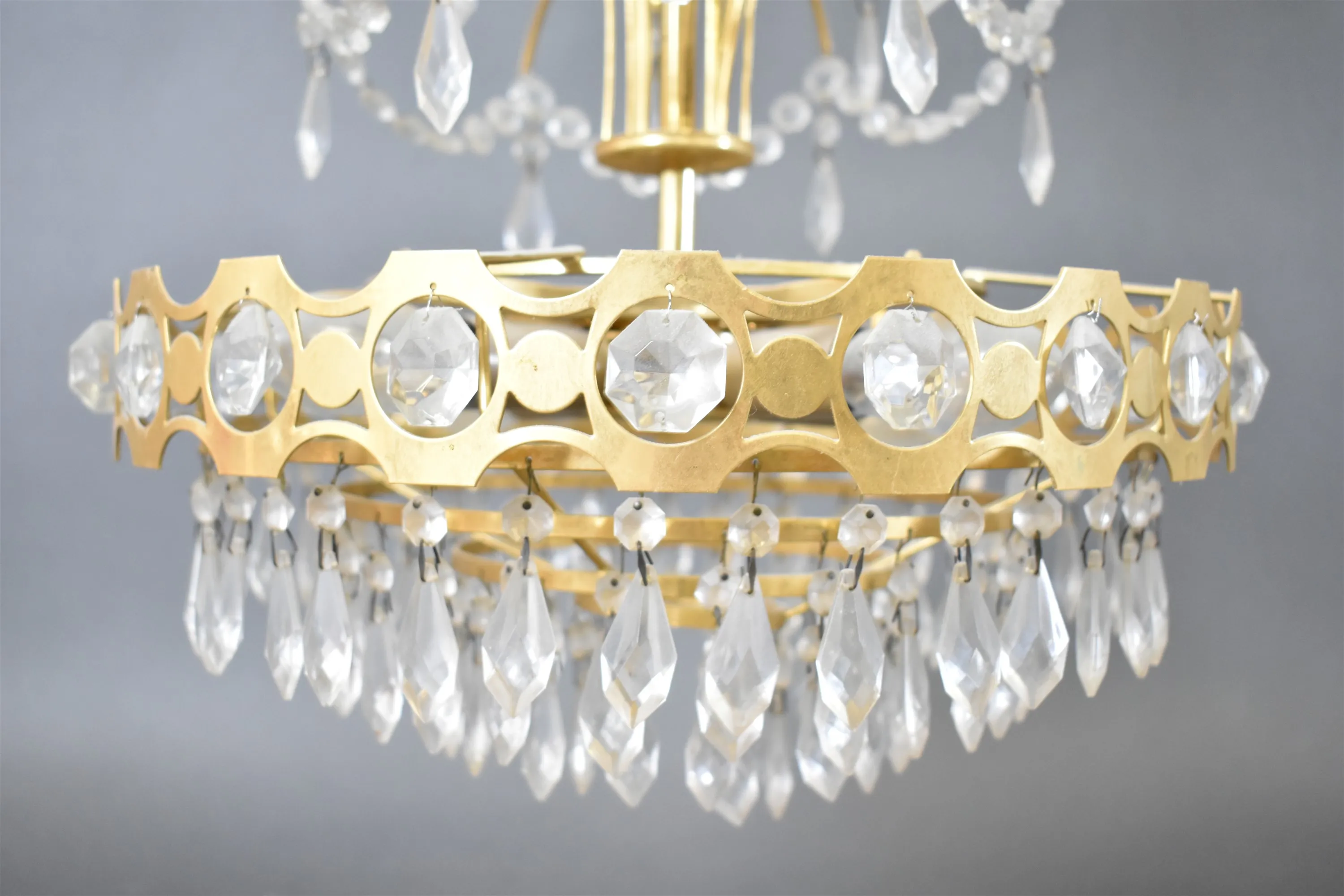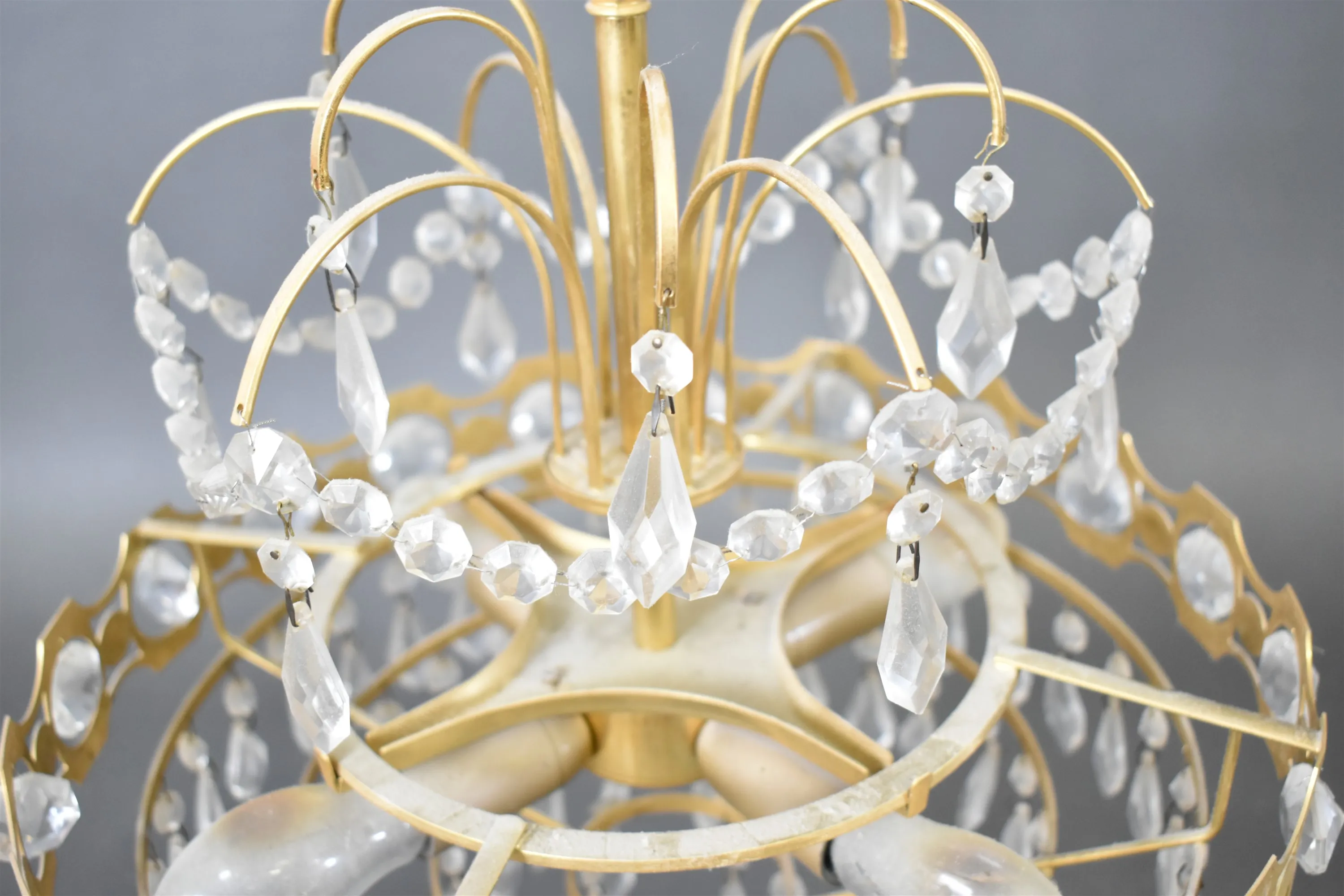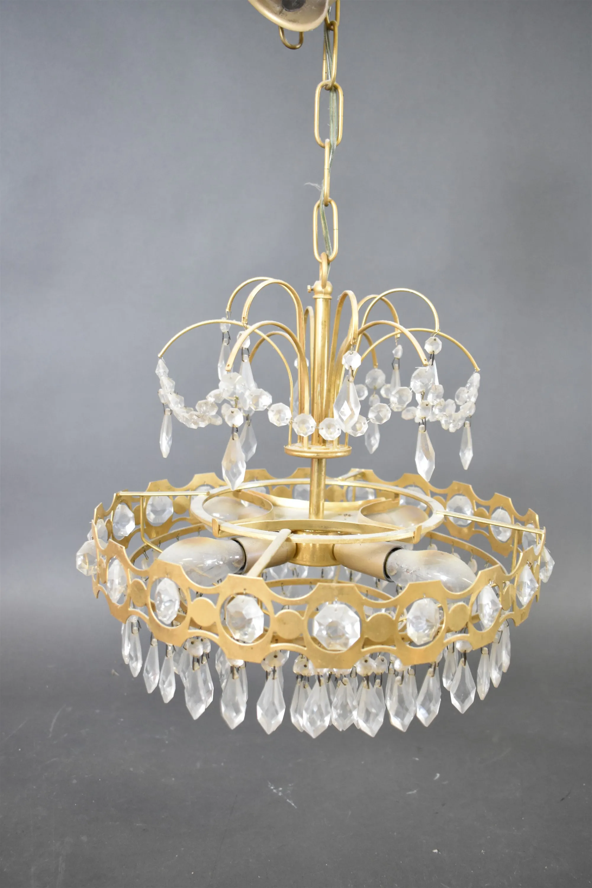 14408. Taklampa med prismor, någon prisma saknas, behöver rengöring, diameter 34 cm