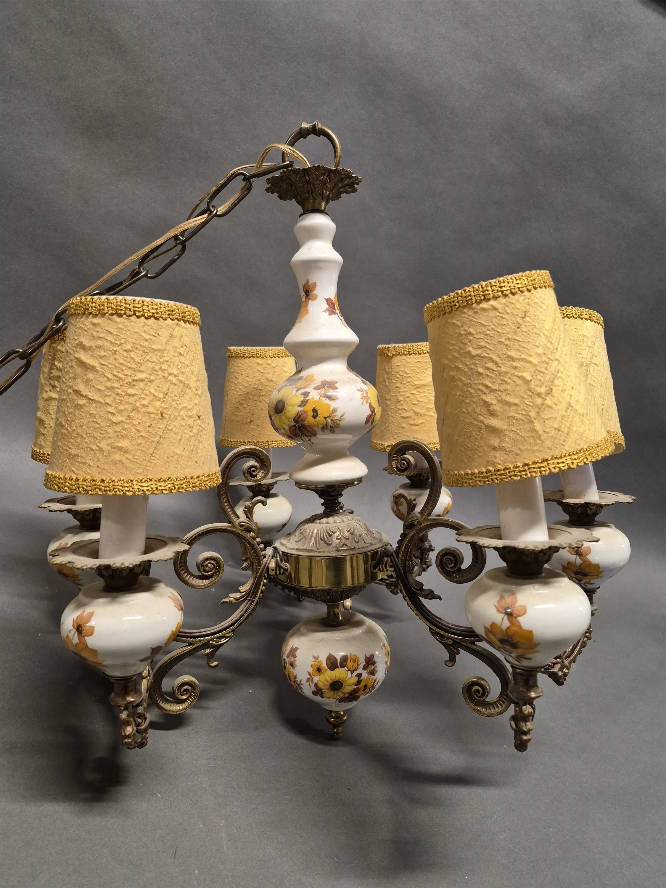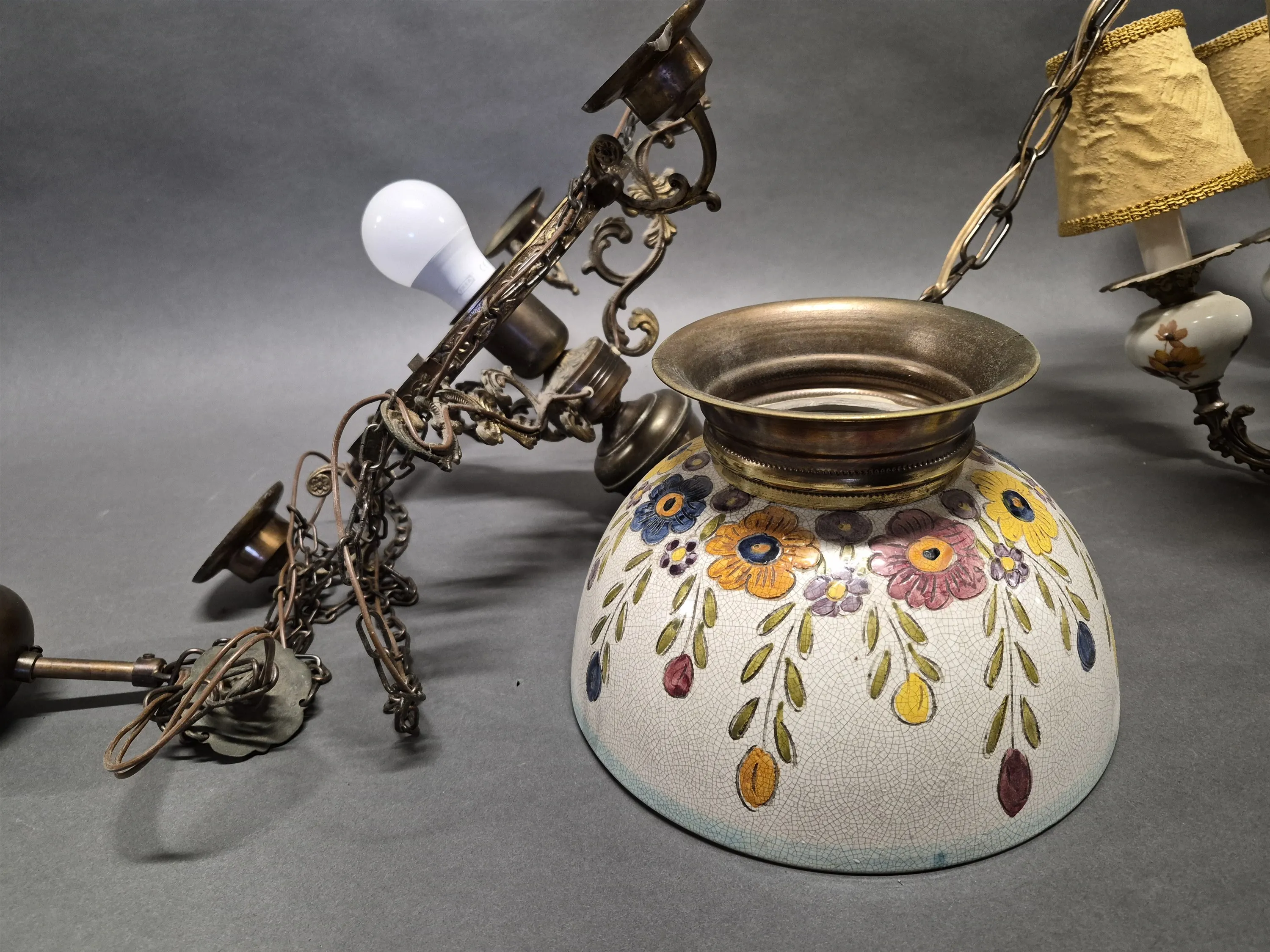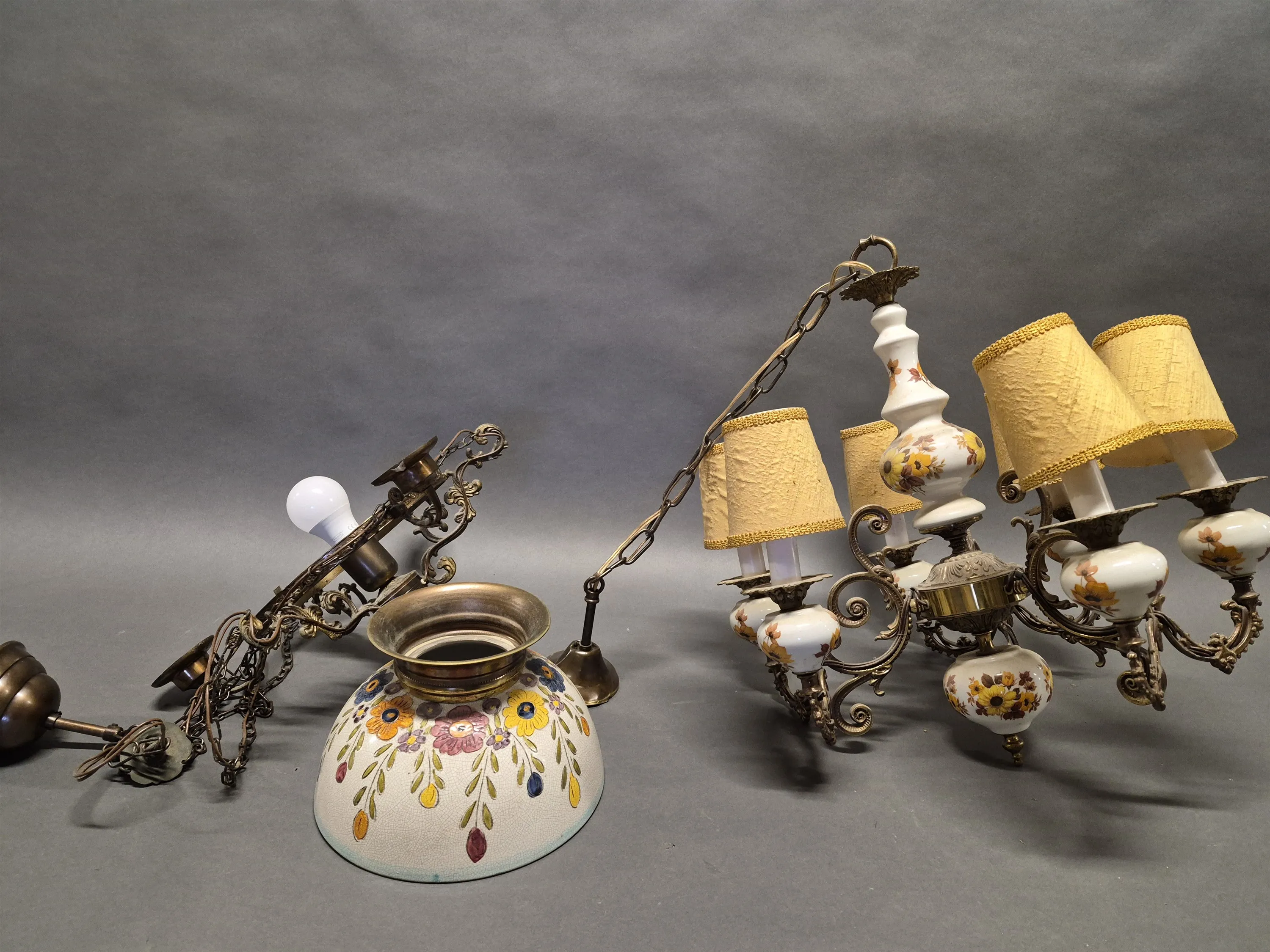17999. Taklampor 2 st bla 6-armad, porslin och metall, kupa ej original, högsta höjd utan kedja 54 cm