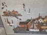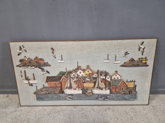 19314. Tavla blandteknik, hamnstad, trä/keramik/tyg, yttermått 121x62 cm