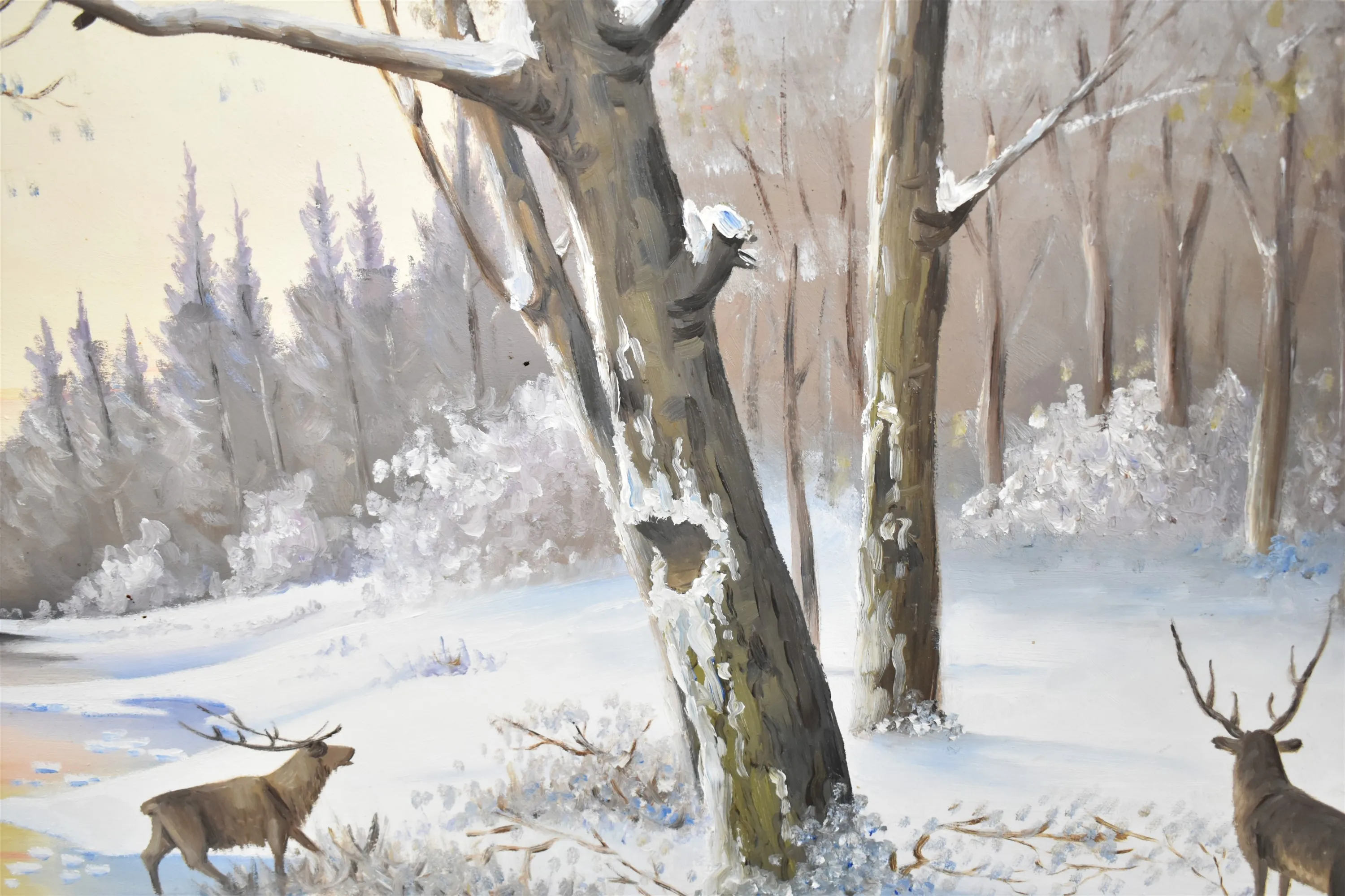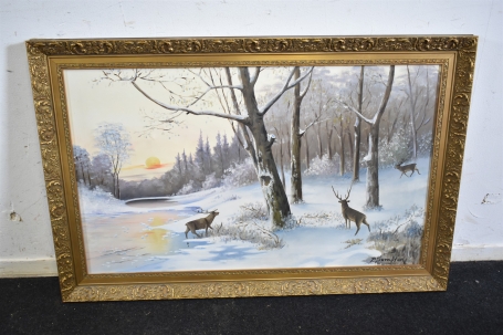 8418. Tavla, P.Svensson olja på duk, "Hjortar i snö", mått 74 x 113 cm