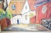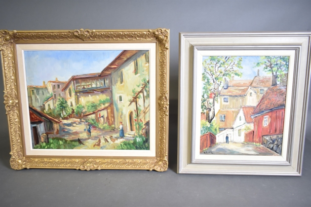 12540. Tavlor 2 st, olja på duk, "Husmotiv" mått 70 x 78 cm