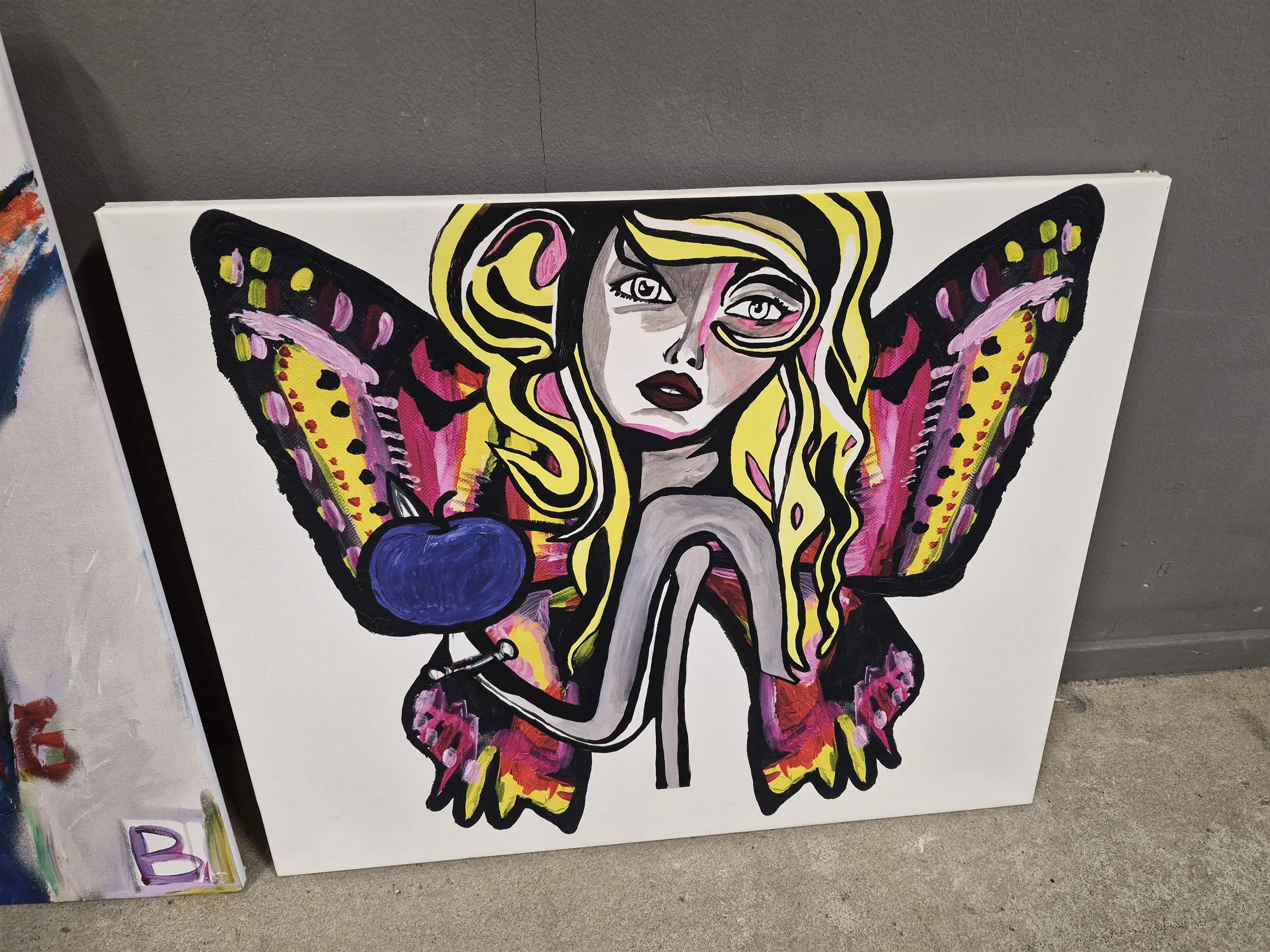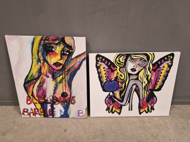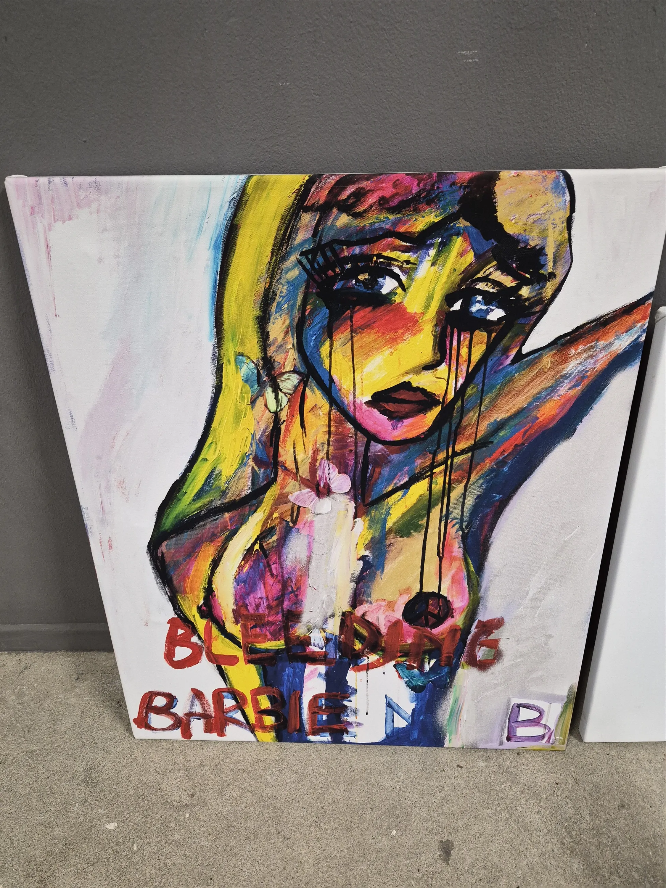 19252. Tavlor 2 st på Canvasduk, bl.a Bleeding Barbie, största mått 75 x 60 cm