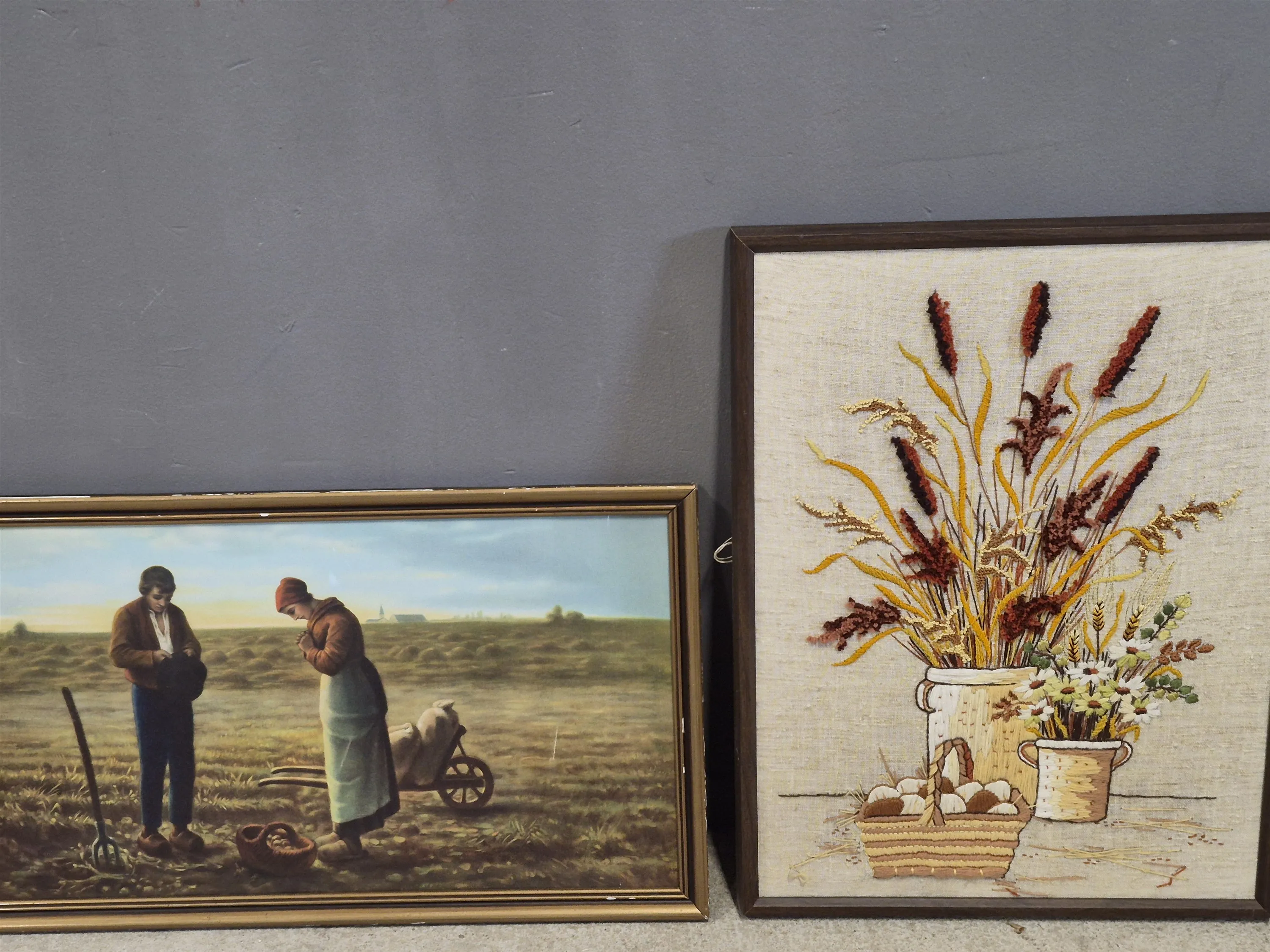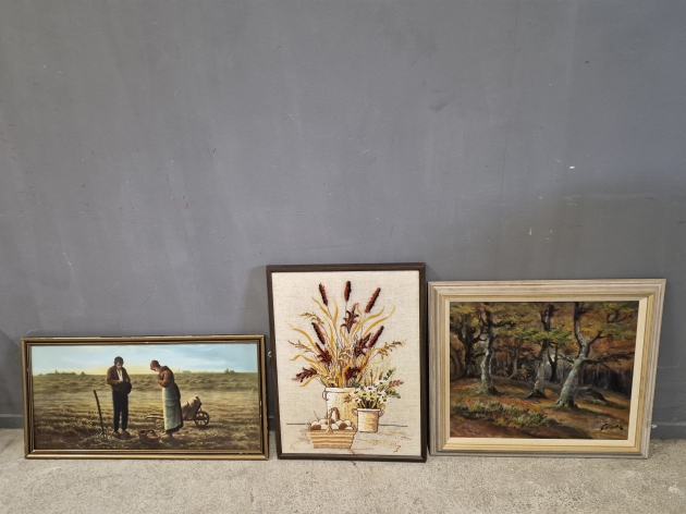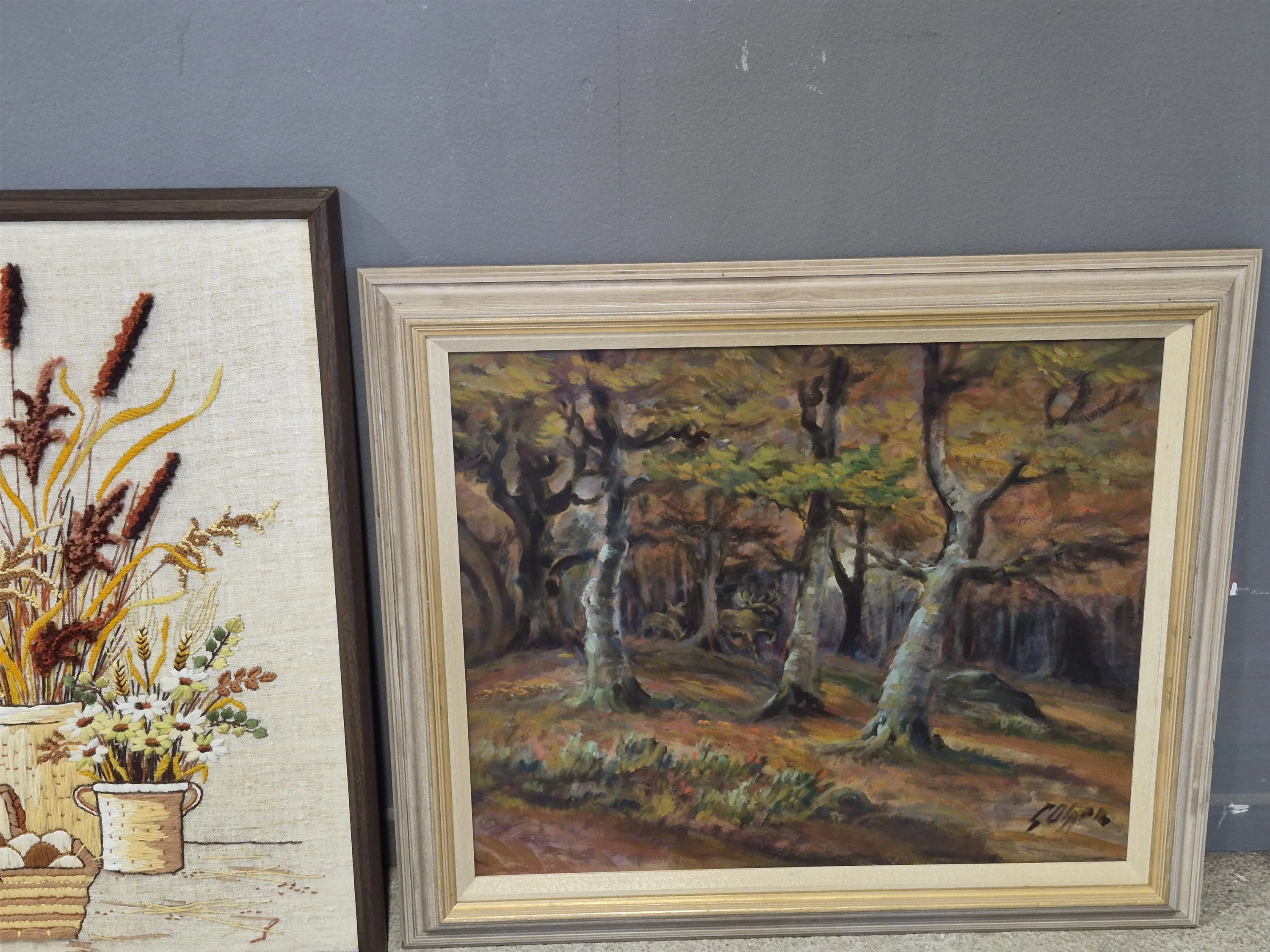 20873. Tavlor 3 st bla olja på pannå skogsmotiv, största mått 82x41 cm