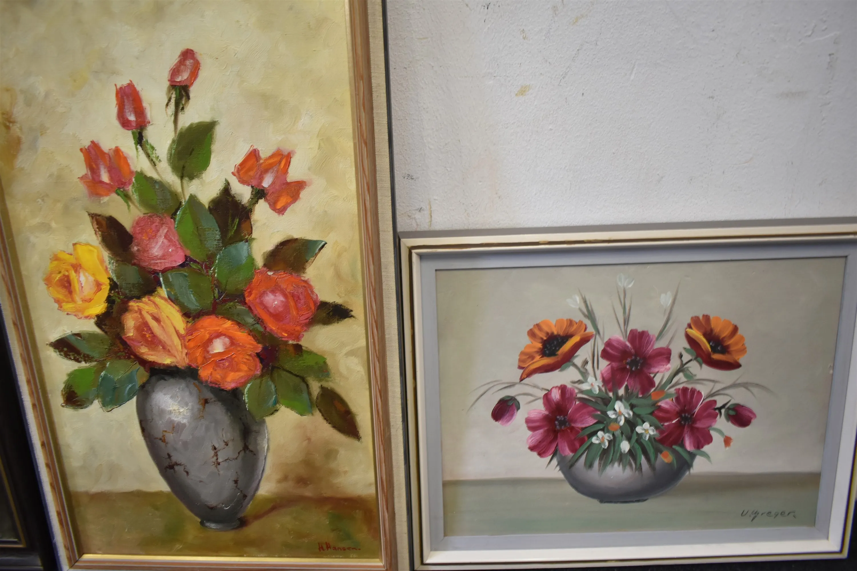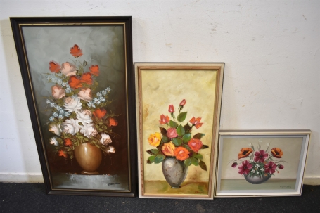4056. Tavlor 3 st, "Blomsterstilleben", olja på duk, största mått 90 x 48 cm
