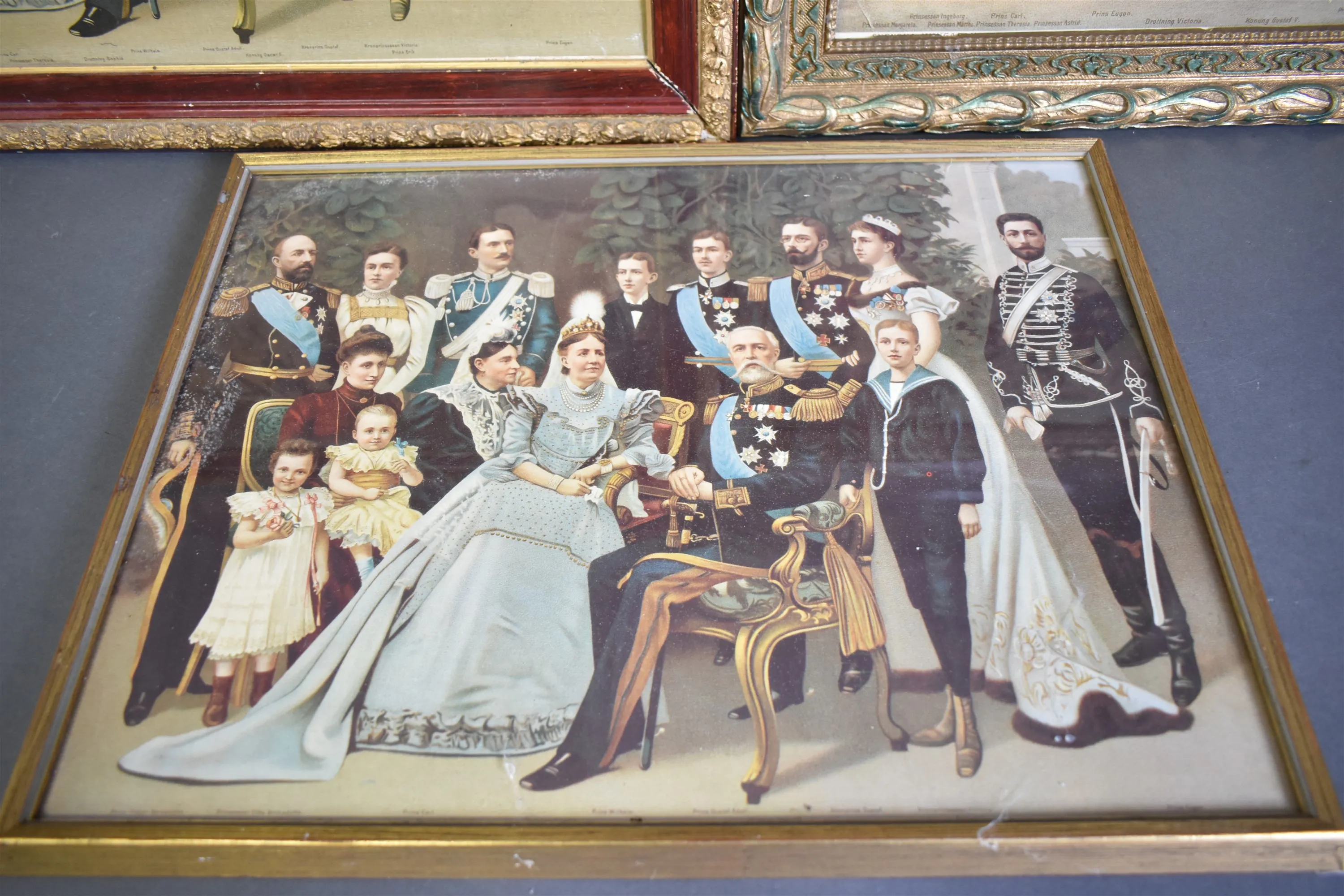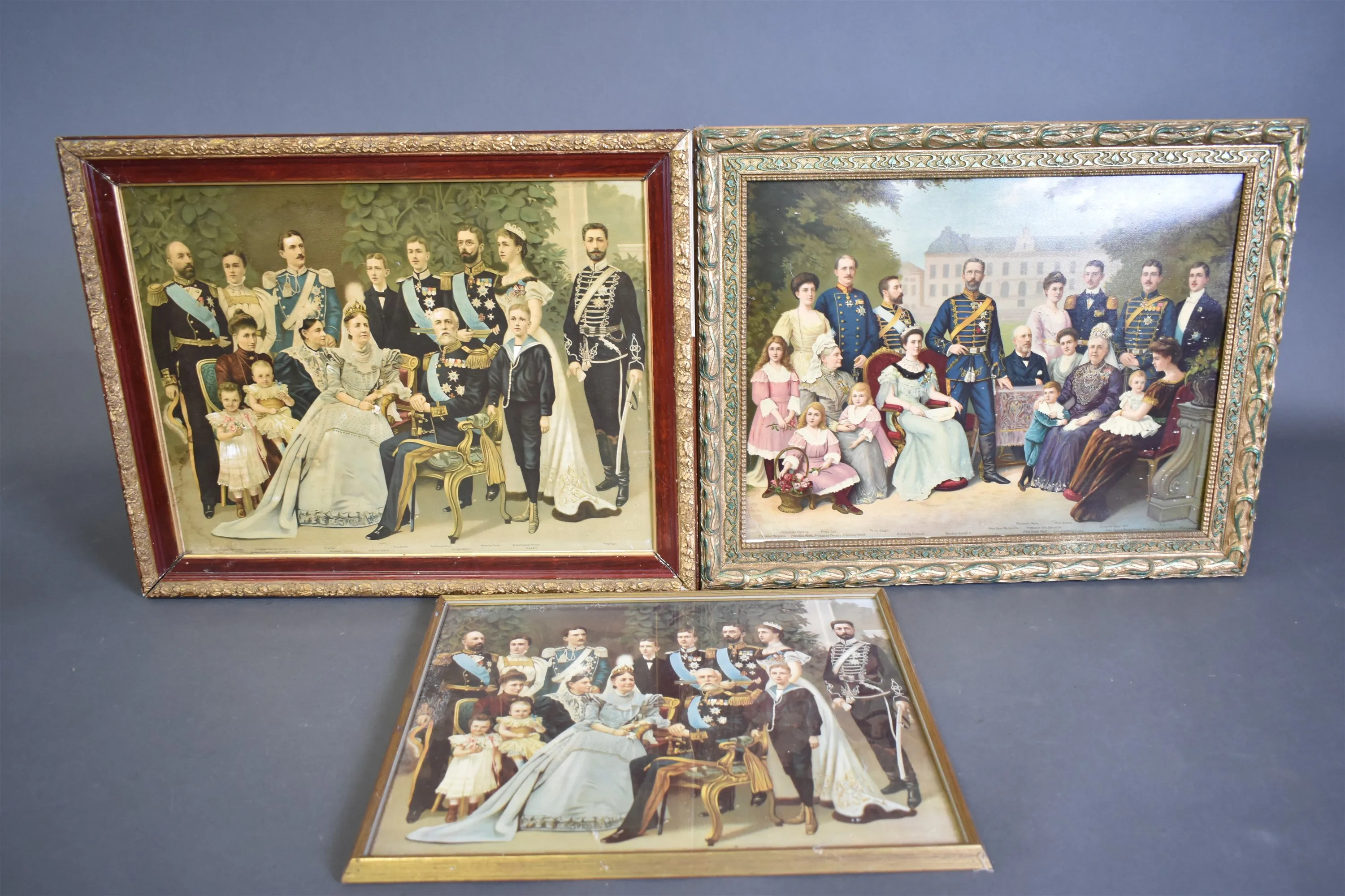 12017. Tavlor 3 st; kungaporträtt, tryck, största mått 59x48 cm