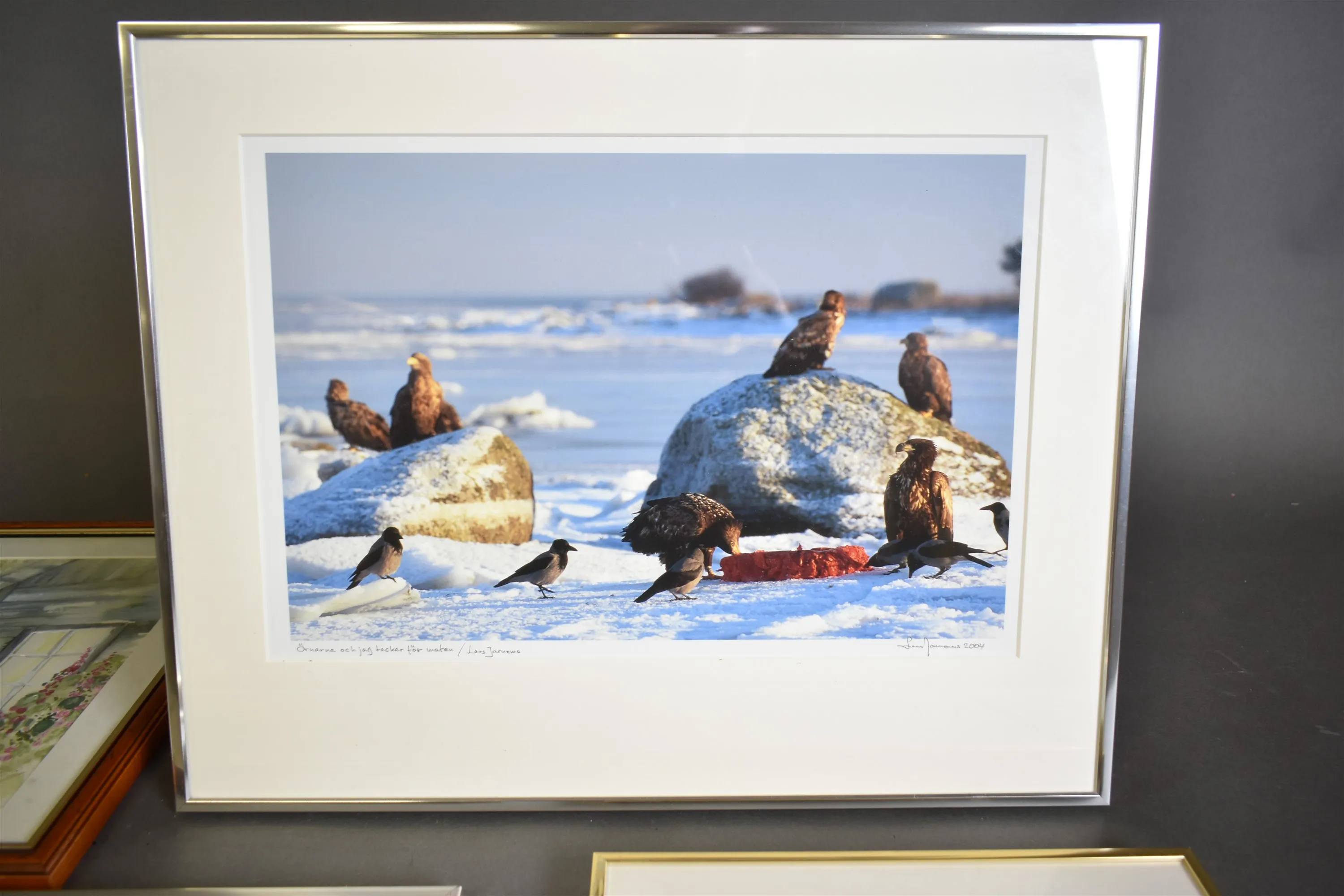 12187. Tavlor 4 st bl.a fotografi på örnar, största mått 40 x 38 cm