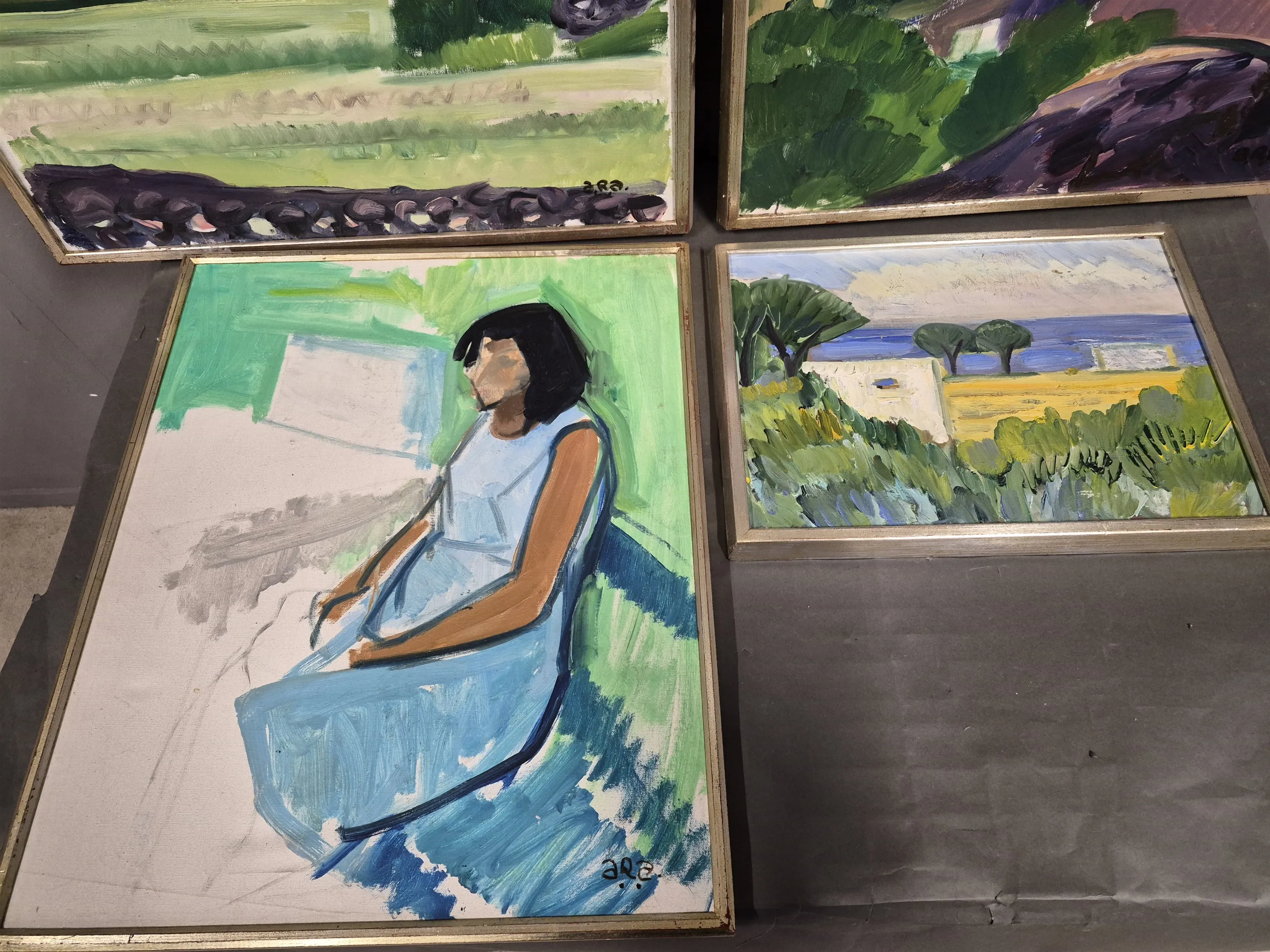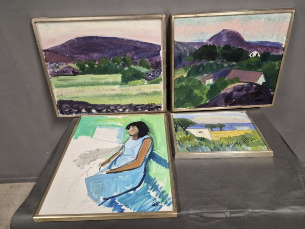 18563. Tavlor 4 st bl.a signerade ARA, olja på duk största mått 73 x 60 cm