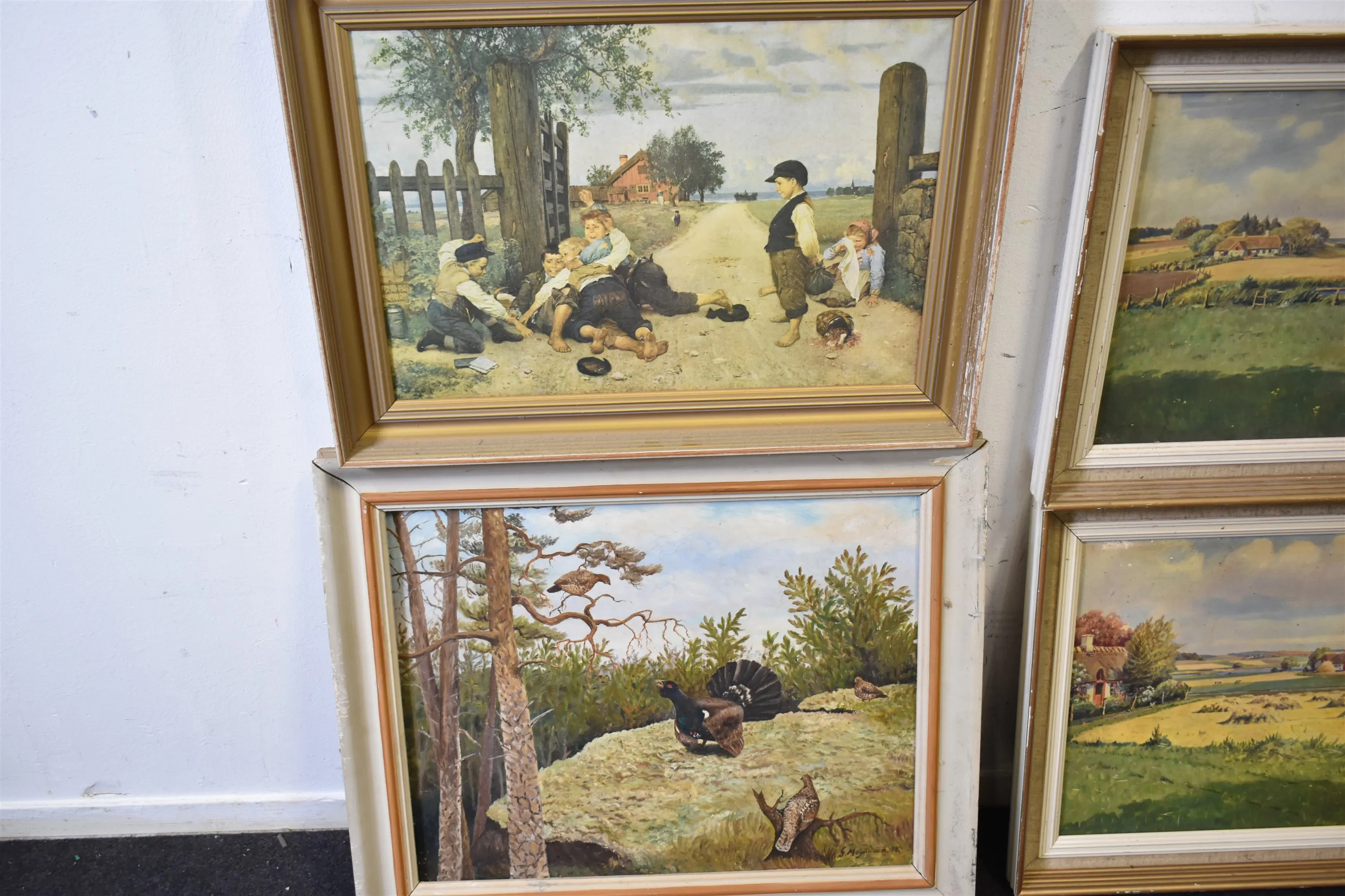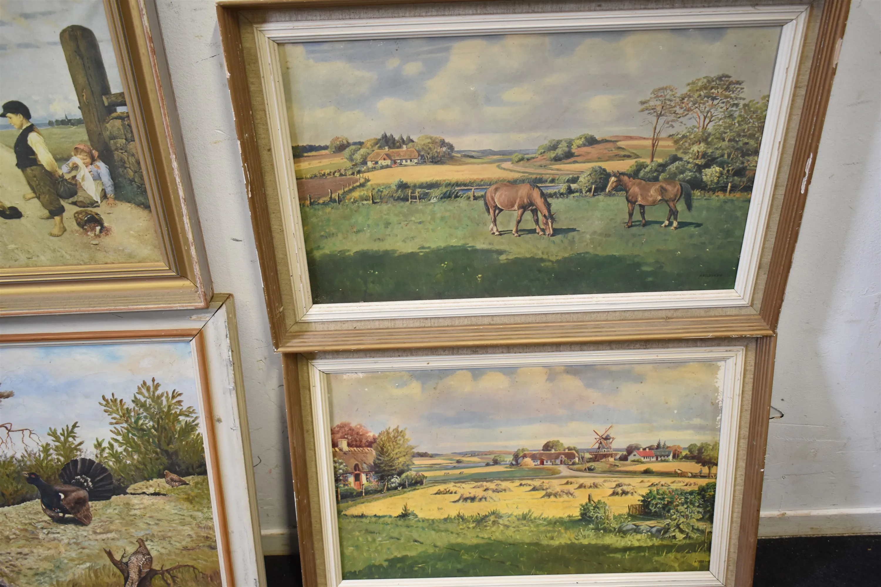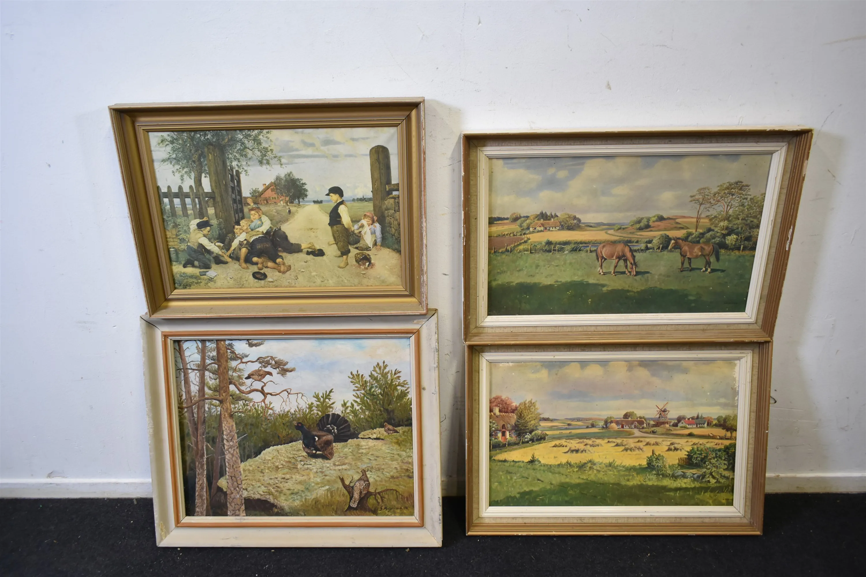 9882. Tavlor 4 st bla tryck på pannå och duk, bla hästmotiv och orre, största mått 71x60 cm