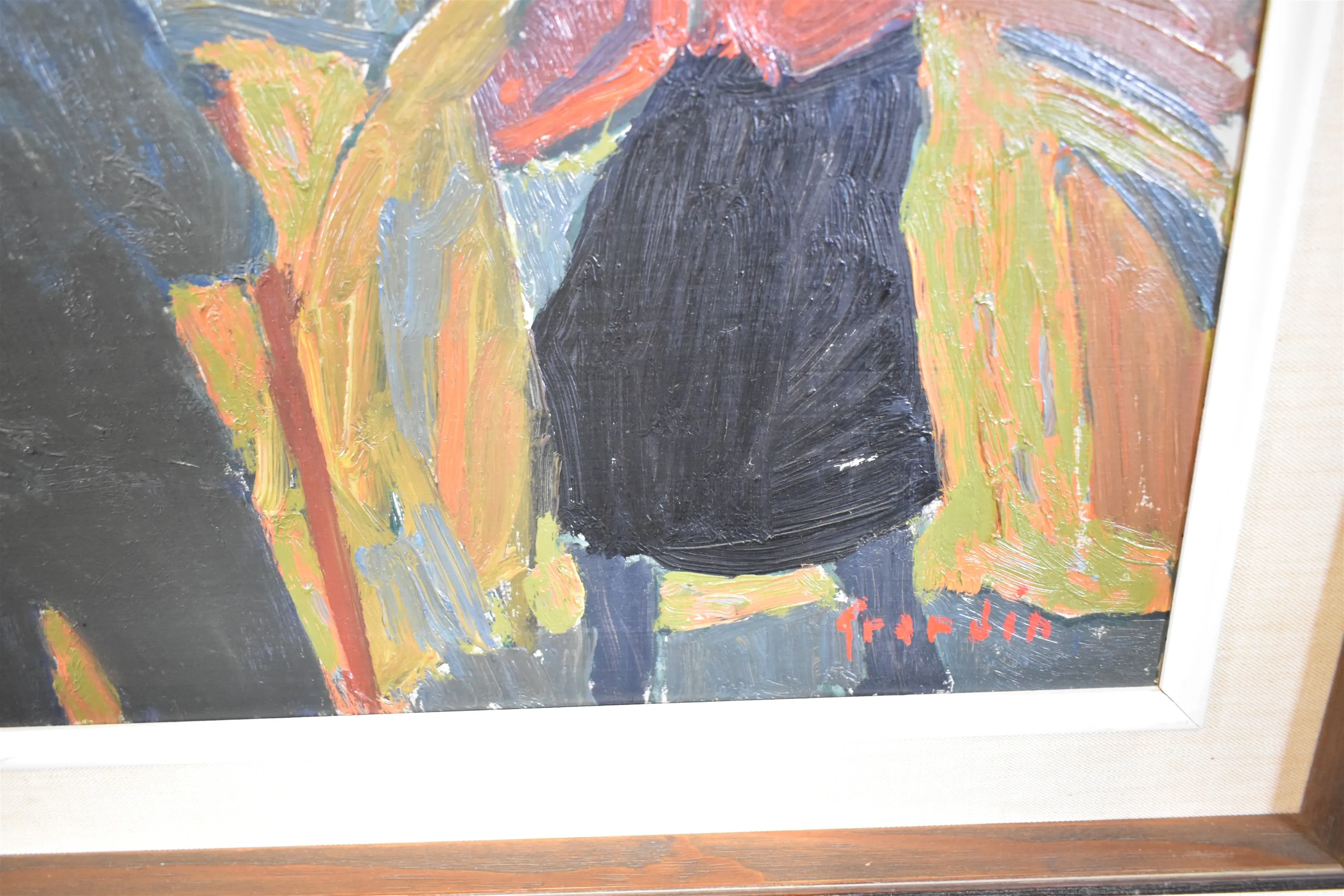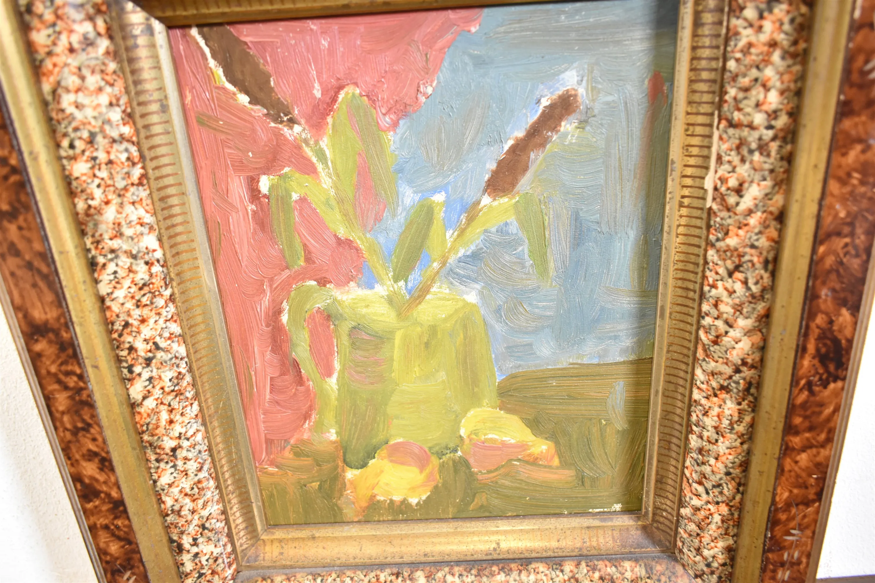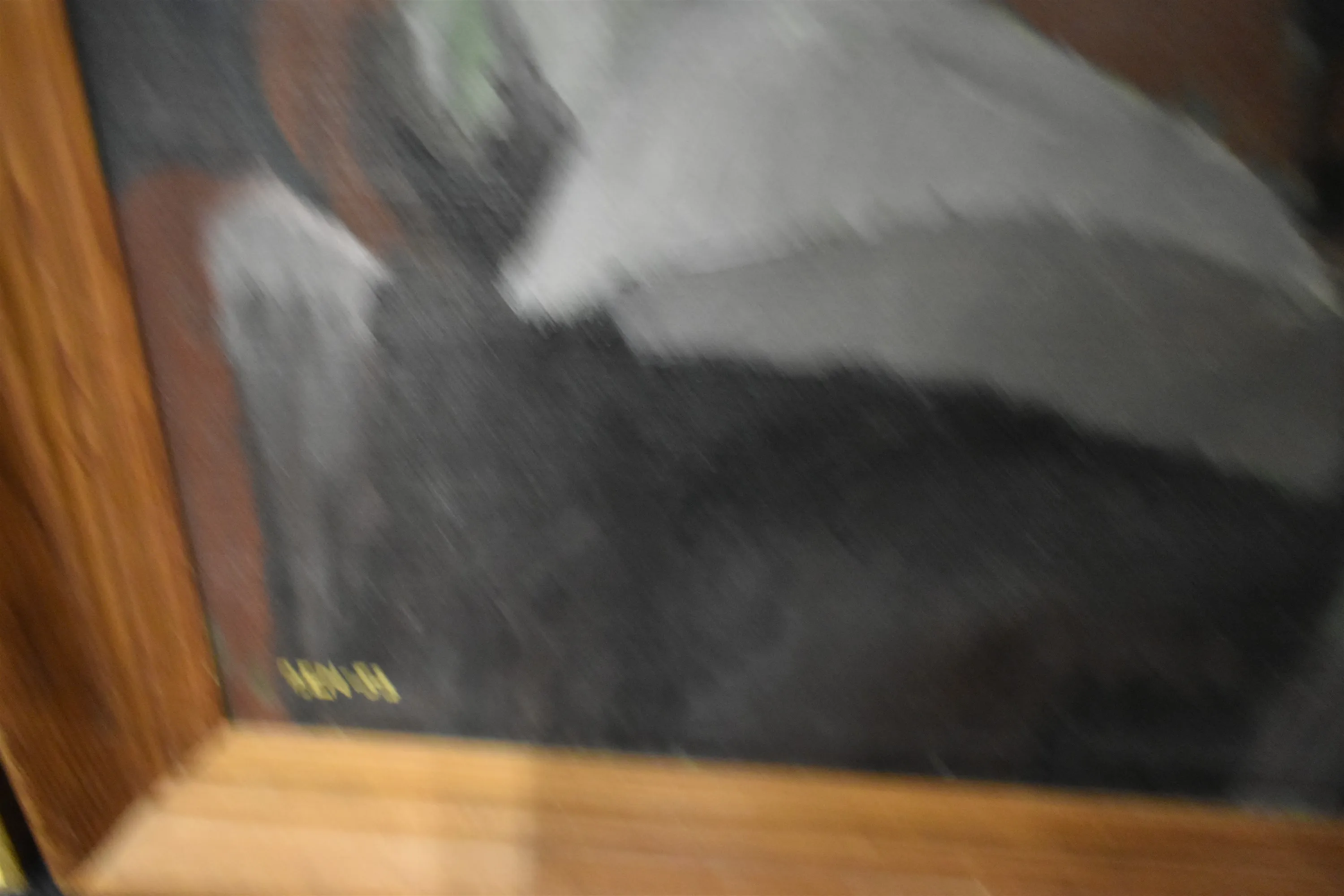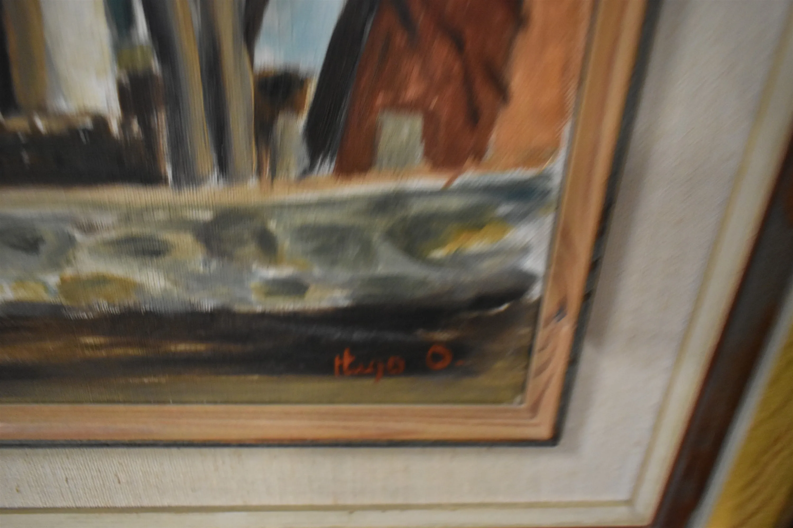 15599. Tavlor 4 st, oljor, en med lagning se bild, största mått 48 x 70 cm