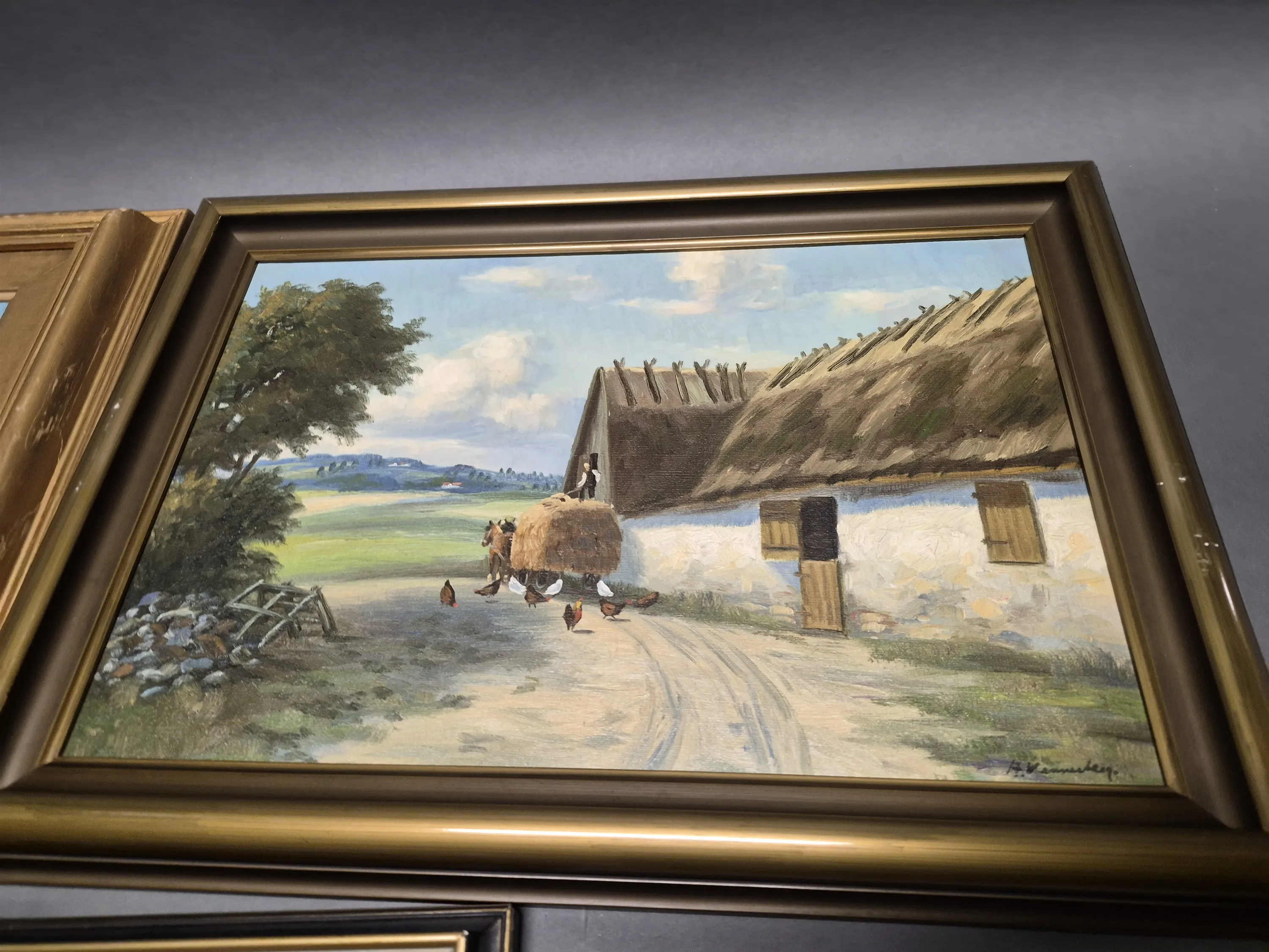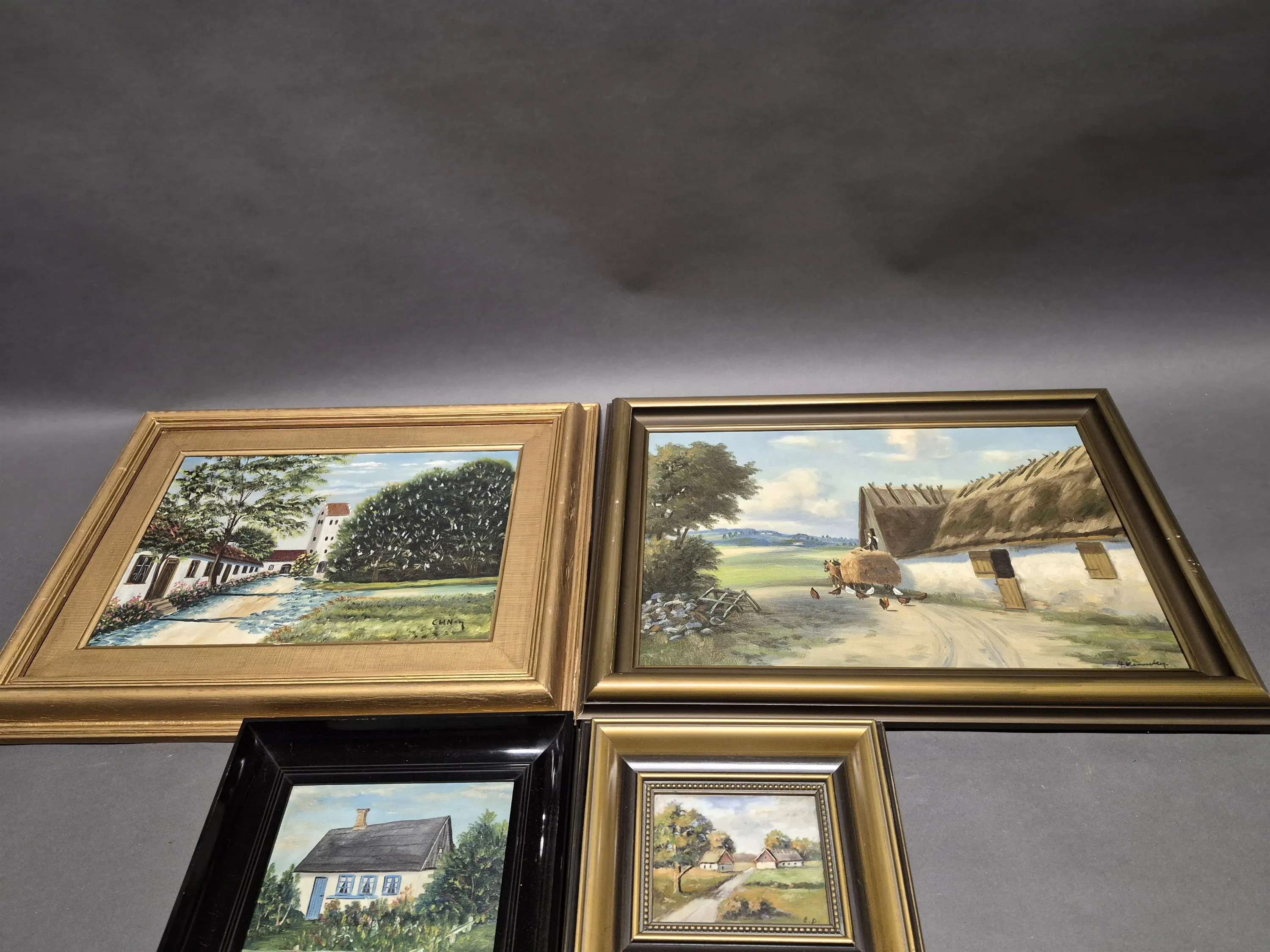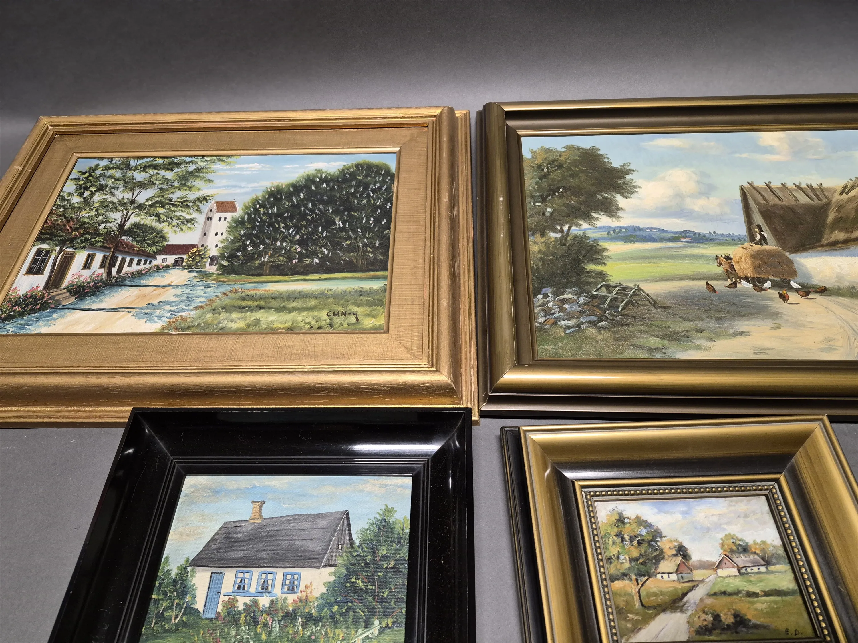 17530. Tavlor 4 st, oljor på duk bla gårdsmotiv, största mått 60x44 cm