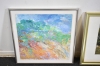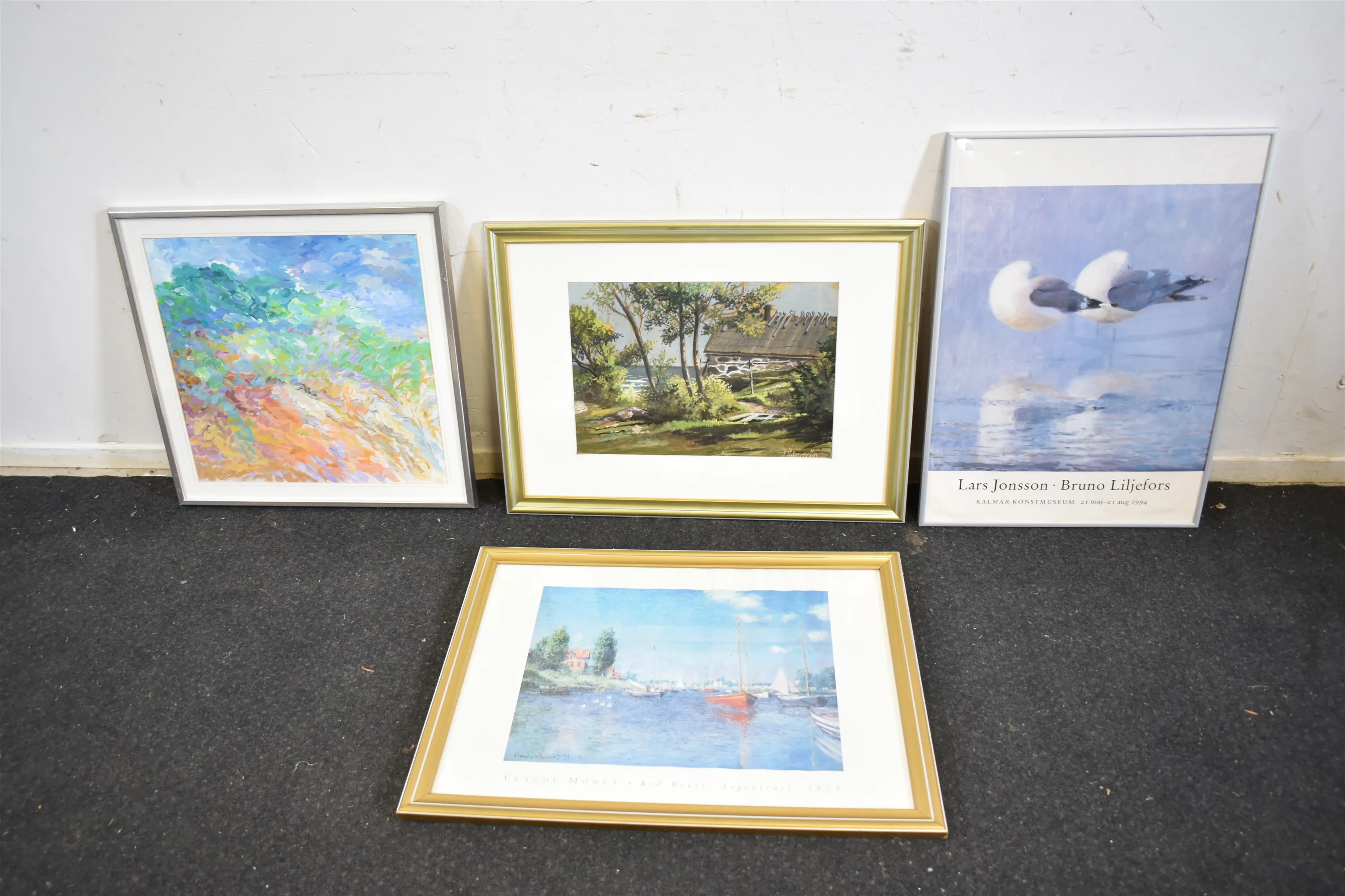 80. Tavlor 4 st tryck och akvarell bla Claude Monet, största mått 78x57 cm