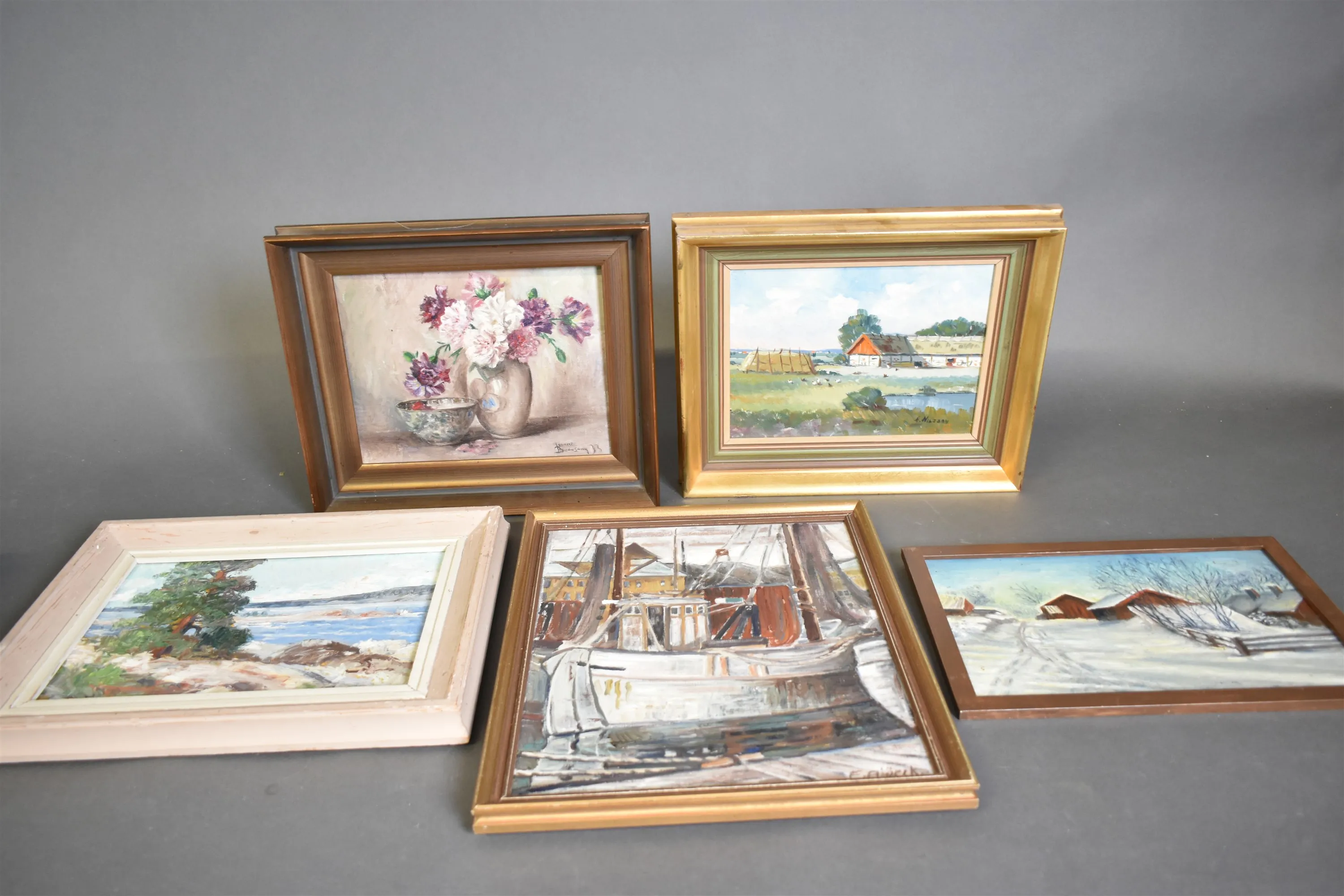 11752. Tavlor 5 st bla Jeanne Beausang, största mått 43x35 cm