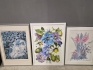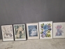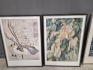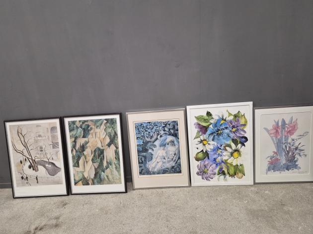 18032. Tavlor 5 st bla tryck blomstermotiv och litografi Ebbe Höglund "Skapelsens ägg", största mått 74x54 cm