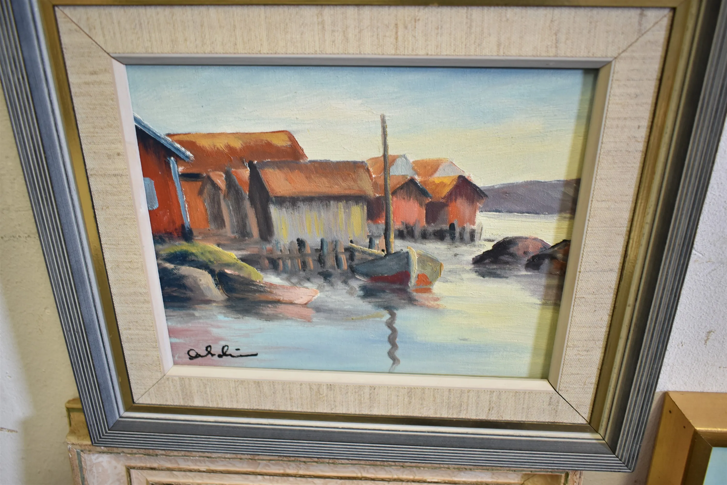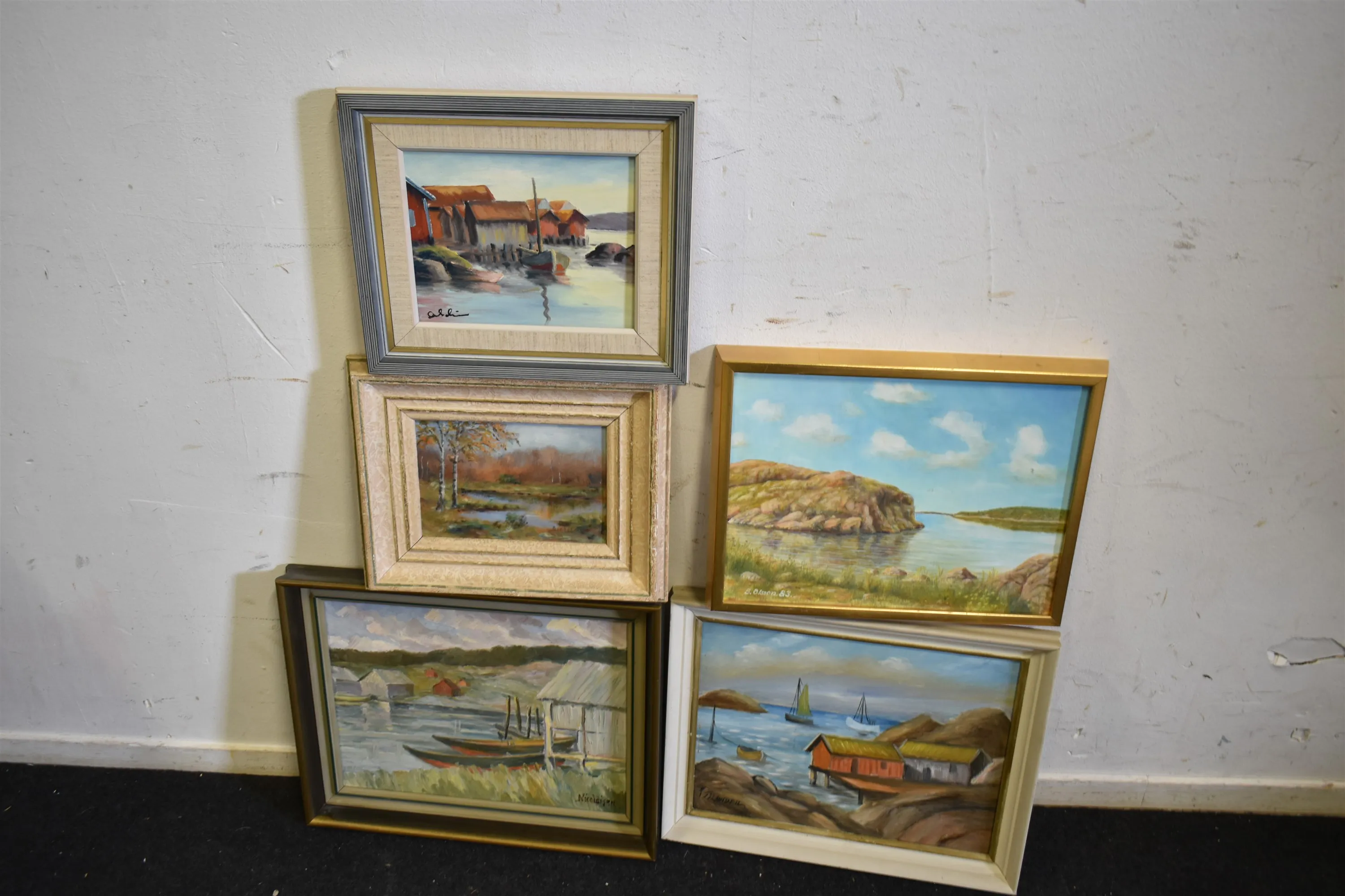 16608. Tavlor 5 st, oljor Fiskelägen", största mått 38 x 49 cm