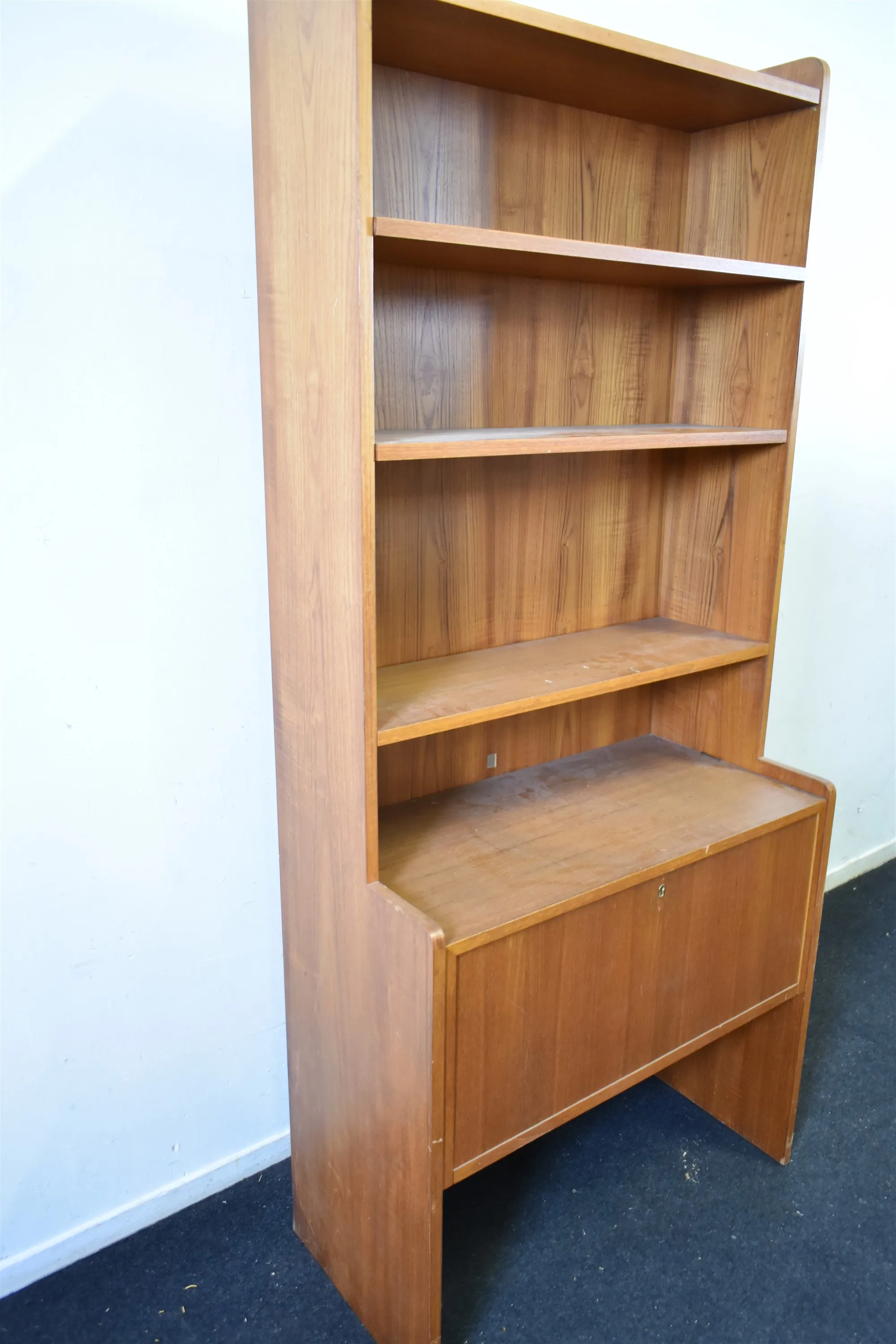 11395. Teakhylla med skåpsdel, höjd 190 cm, bredd 84 cm, djup 41 cm