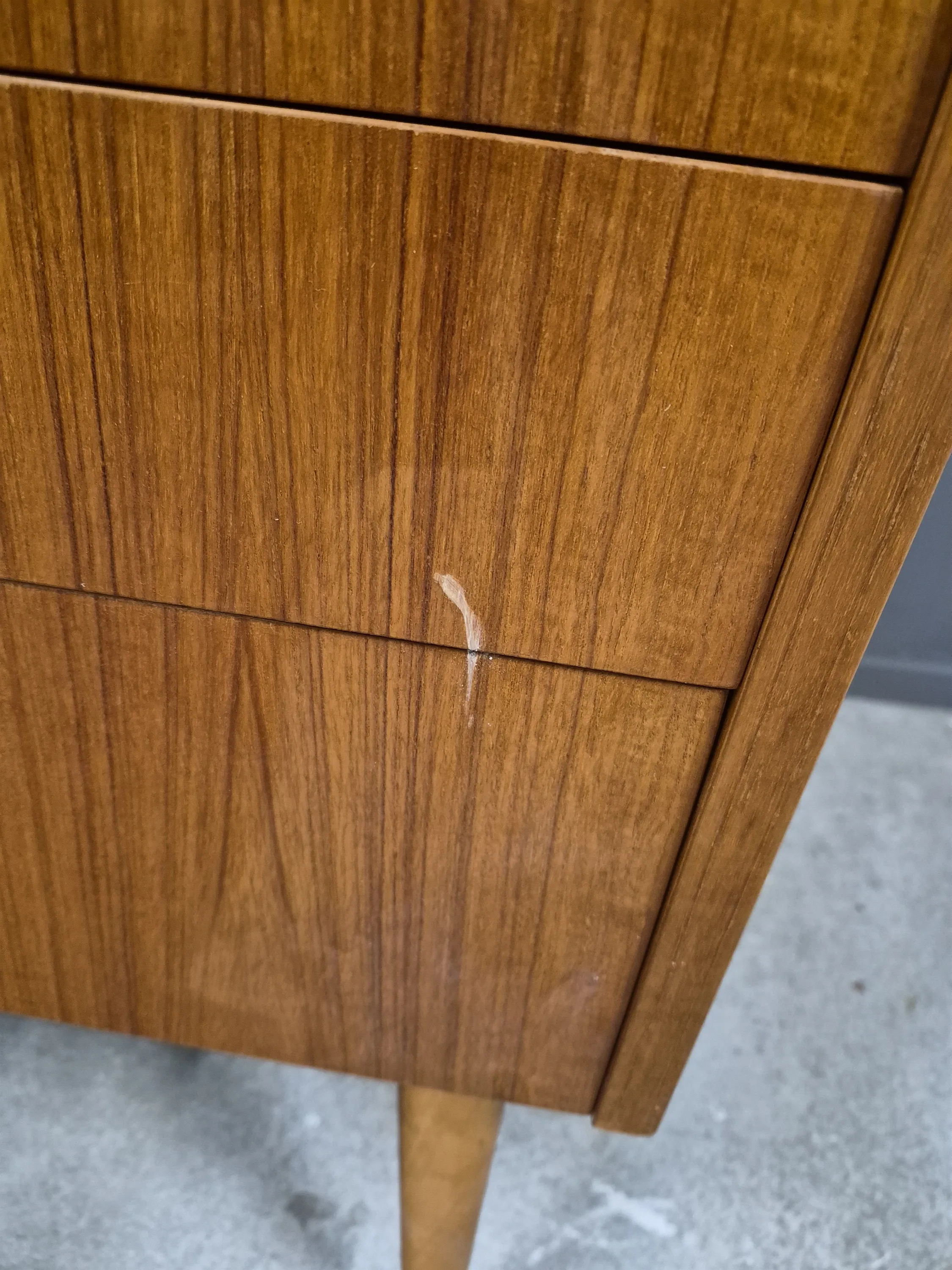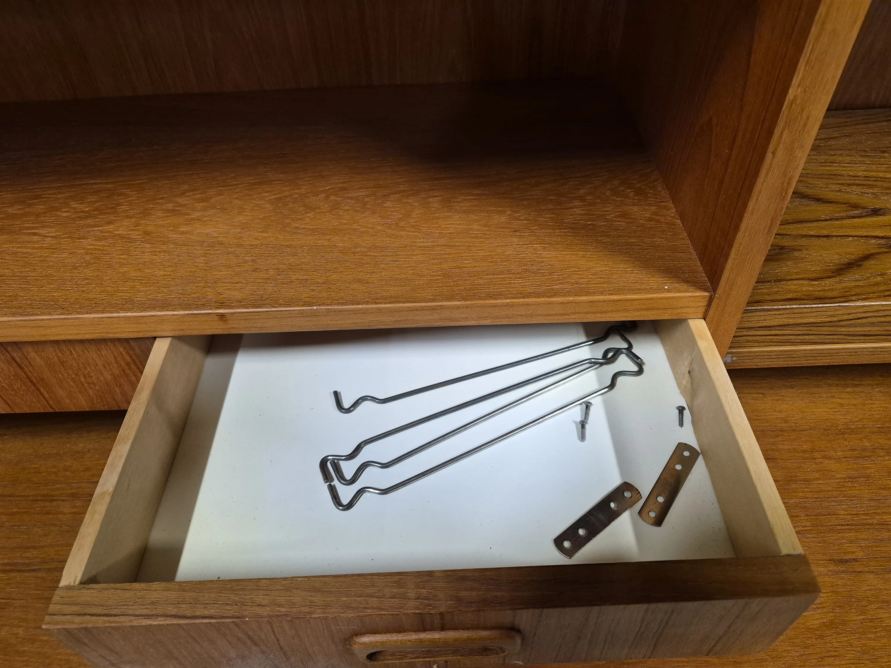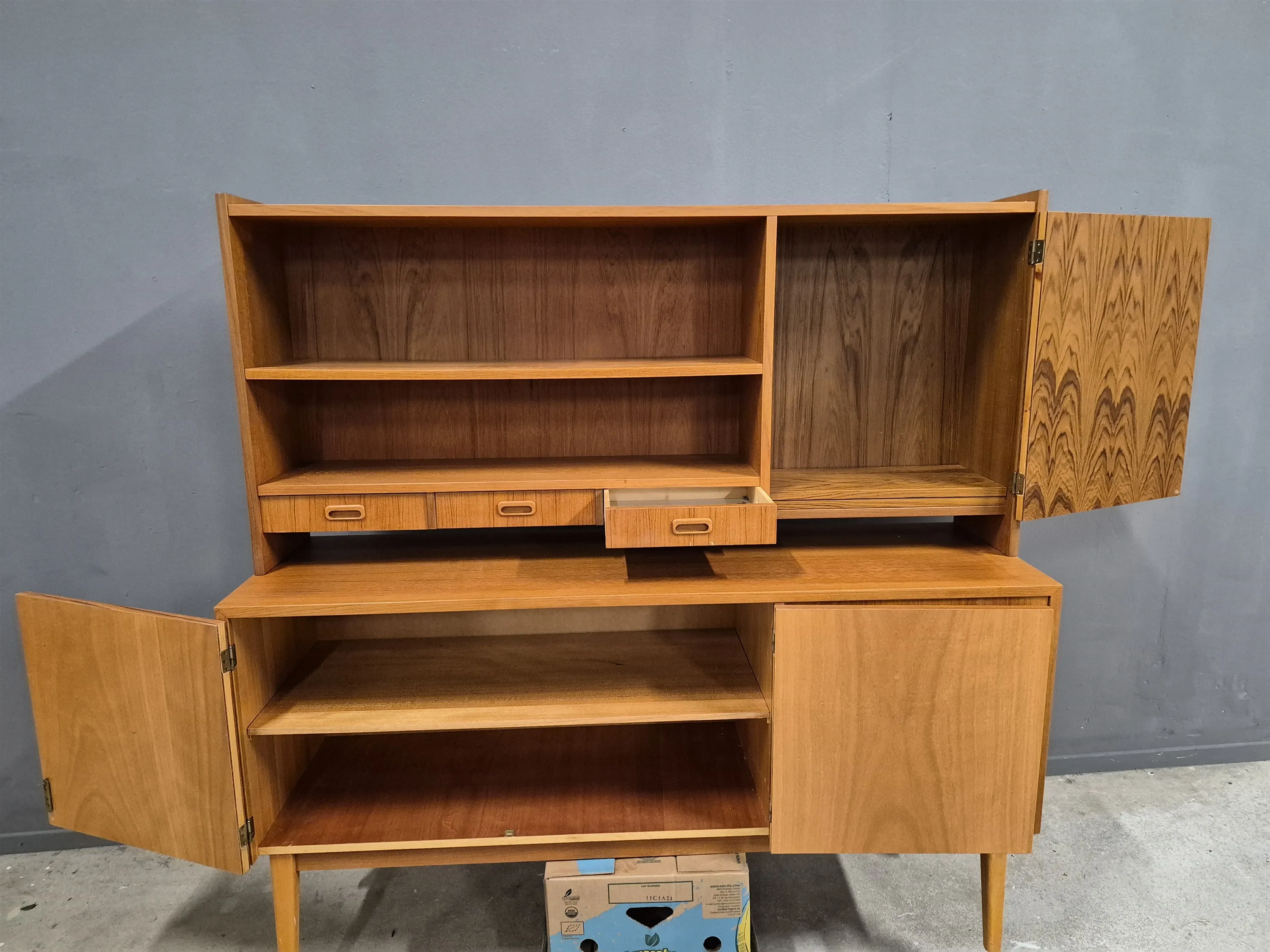 17413. Teakskåp med överdel, höjd 149 cm, längd 150 cm, bredd 45 cm