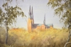 7682. Ted Stanley olja på duk, "Kyrkvy", mått 41 x 50 cm