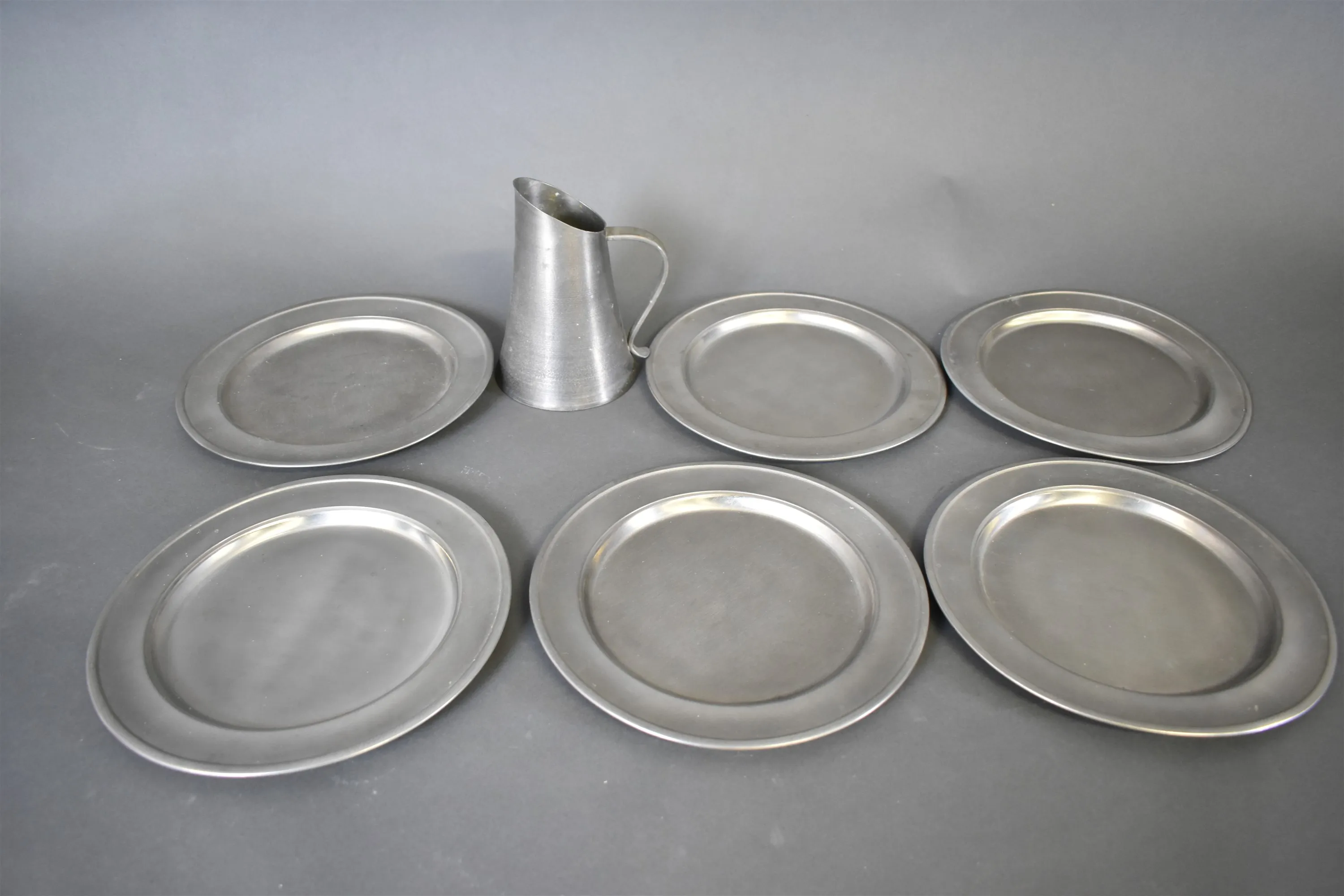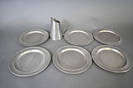 6634. Tenntallrikar & kanna, högsta 20 cm