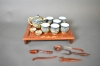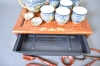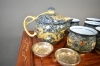 997. Teservis med bricka med utragbar låda, drakdekor, asiatisk stil, porslin och trä, längsta mått 38 cm