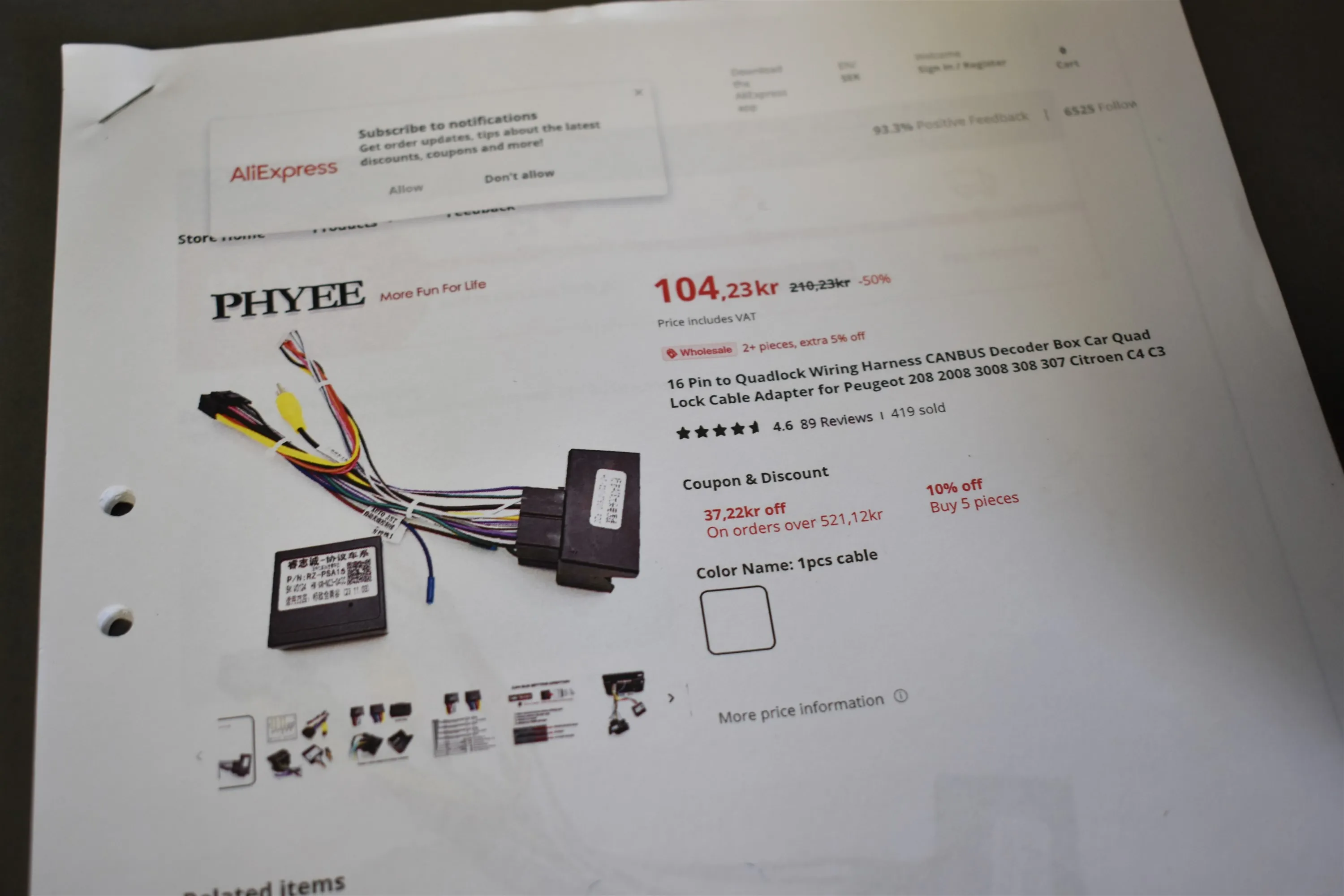 16721. Tillbehör till Peugeot och android radio, tillsynes oanvänt
