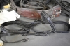 9505. Tillbehör till häst bla tömmar, sadelgjord och träns uppskattad storlek ponny