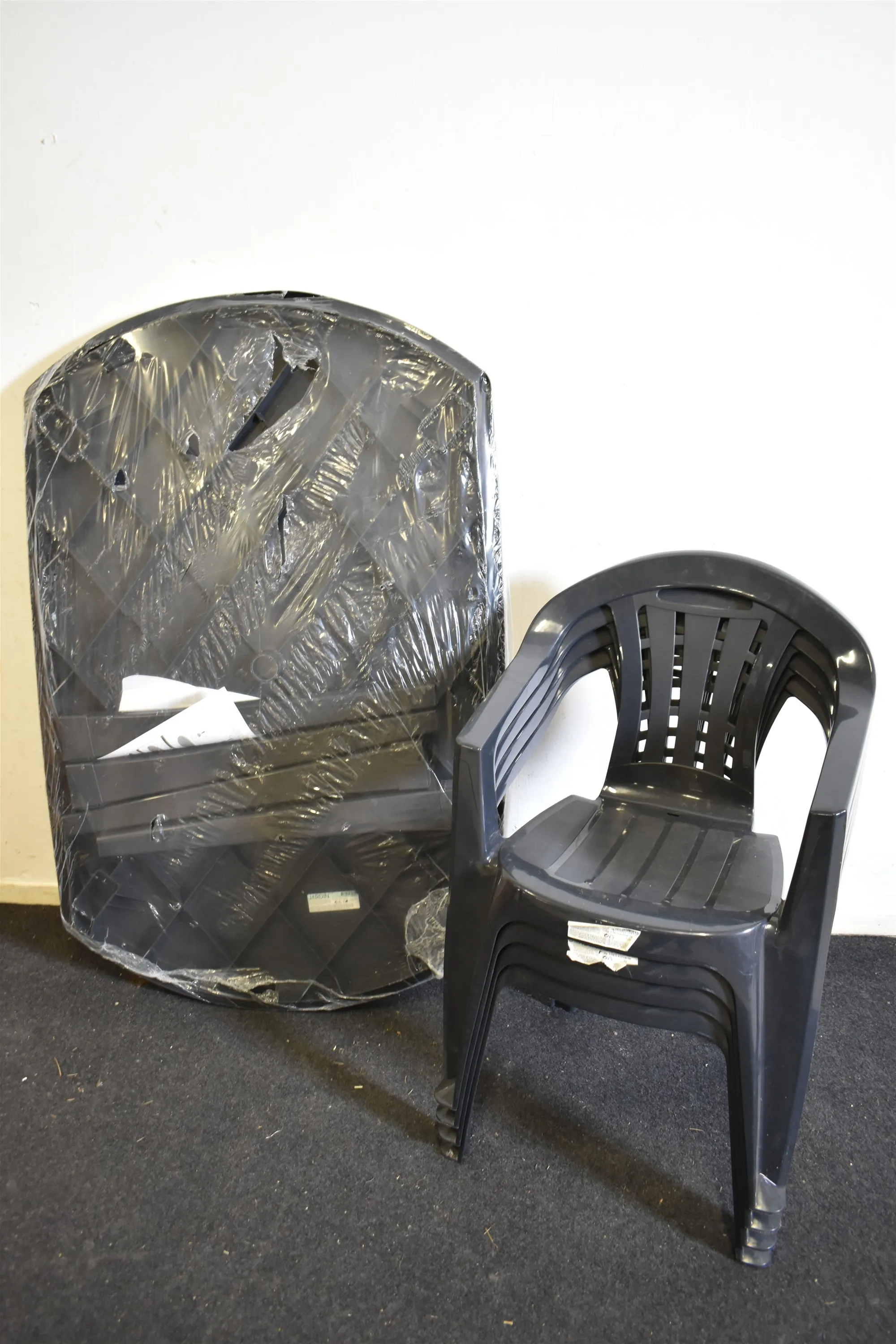 16024. Trädgårdsbord i plast nytt i förpackning och 4 st stolar, höjd på stolar 80 cm