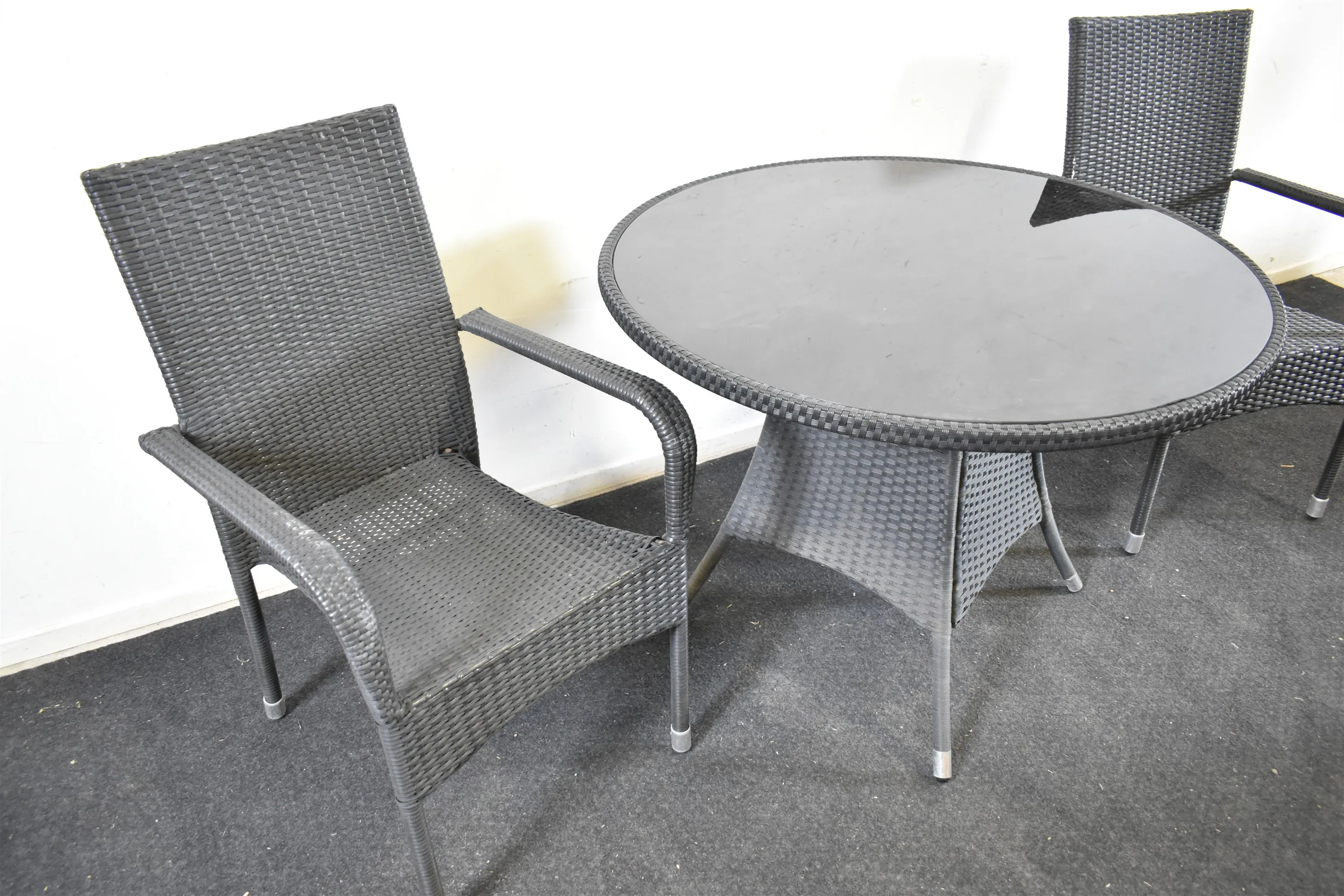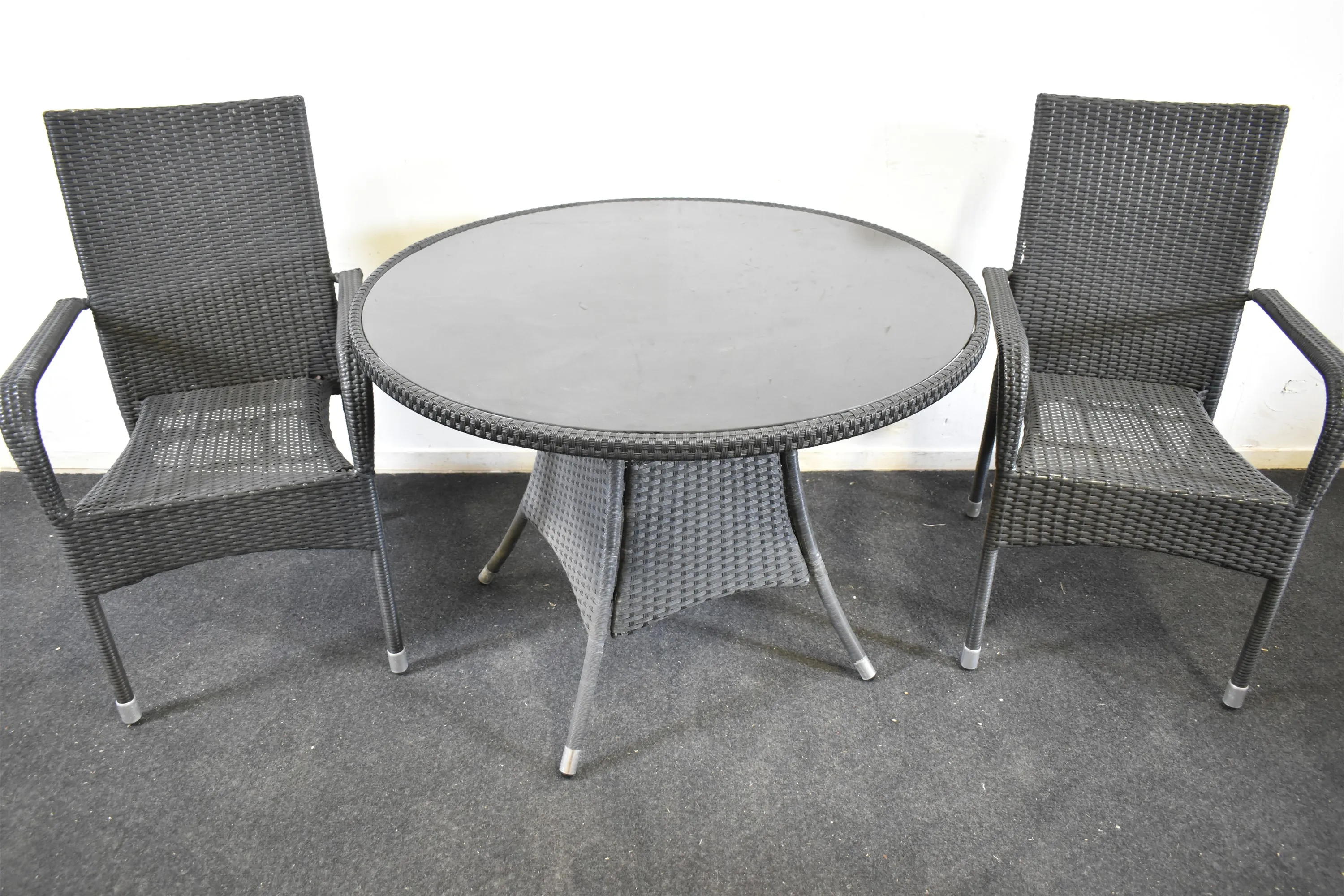 8861. Trädgårdsbord och stolar 2 st, konstrotting, höjd på bord 73 cm, diameter 102 cm