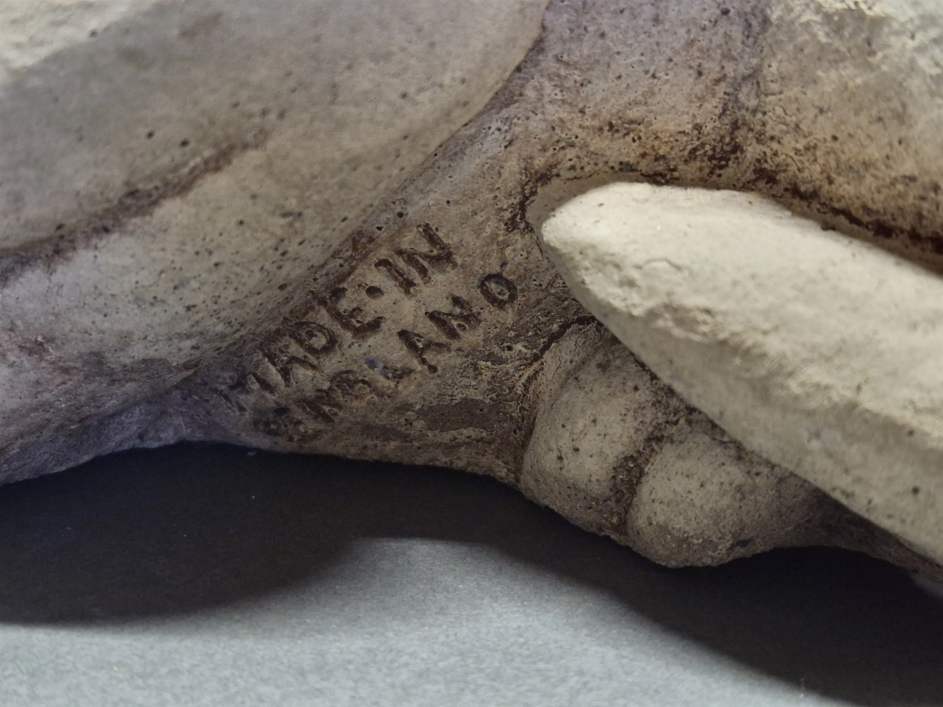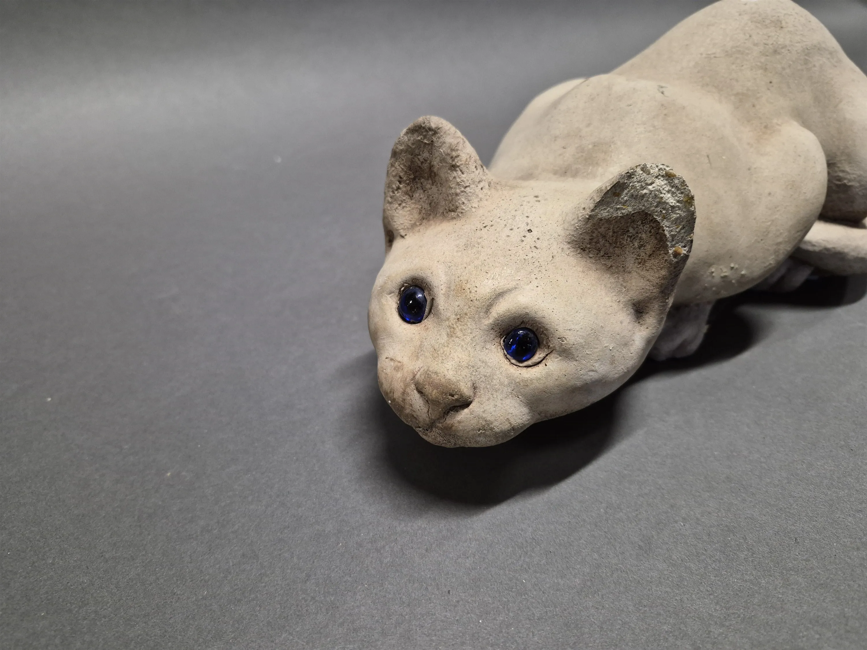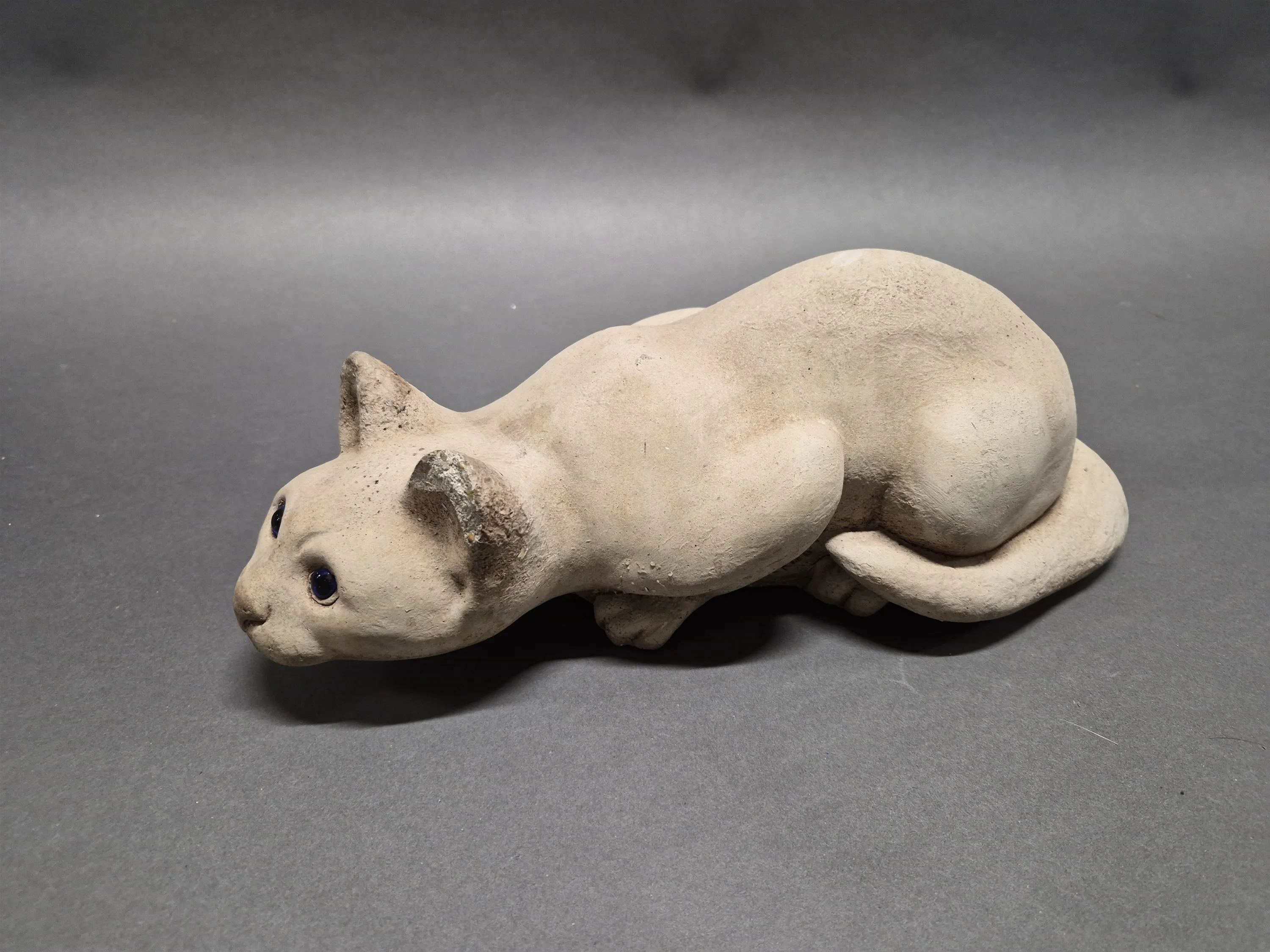 18989. Trädgårdsdekoration katt, cement, skada på öra, längd 39 cm