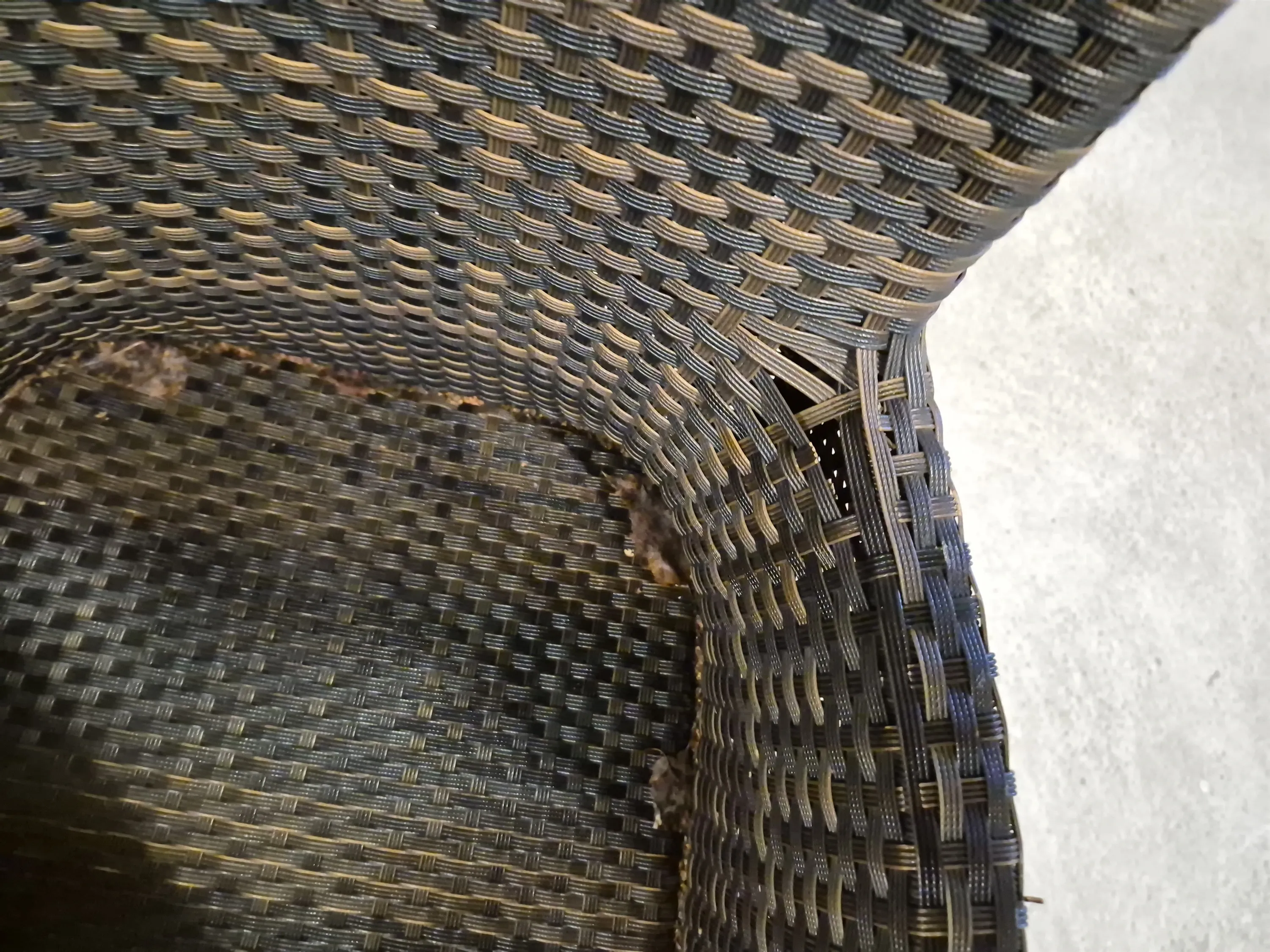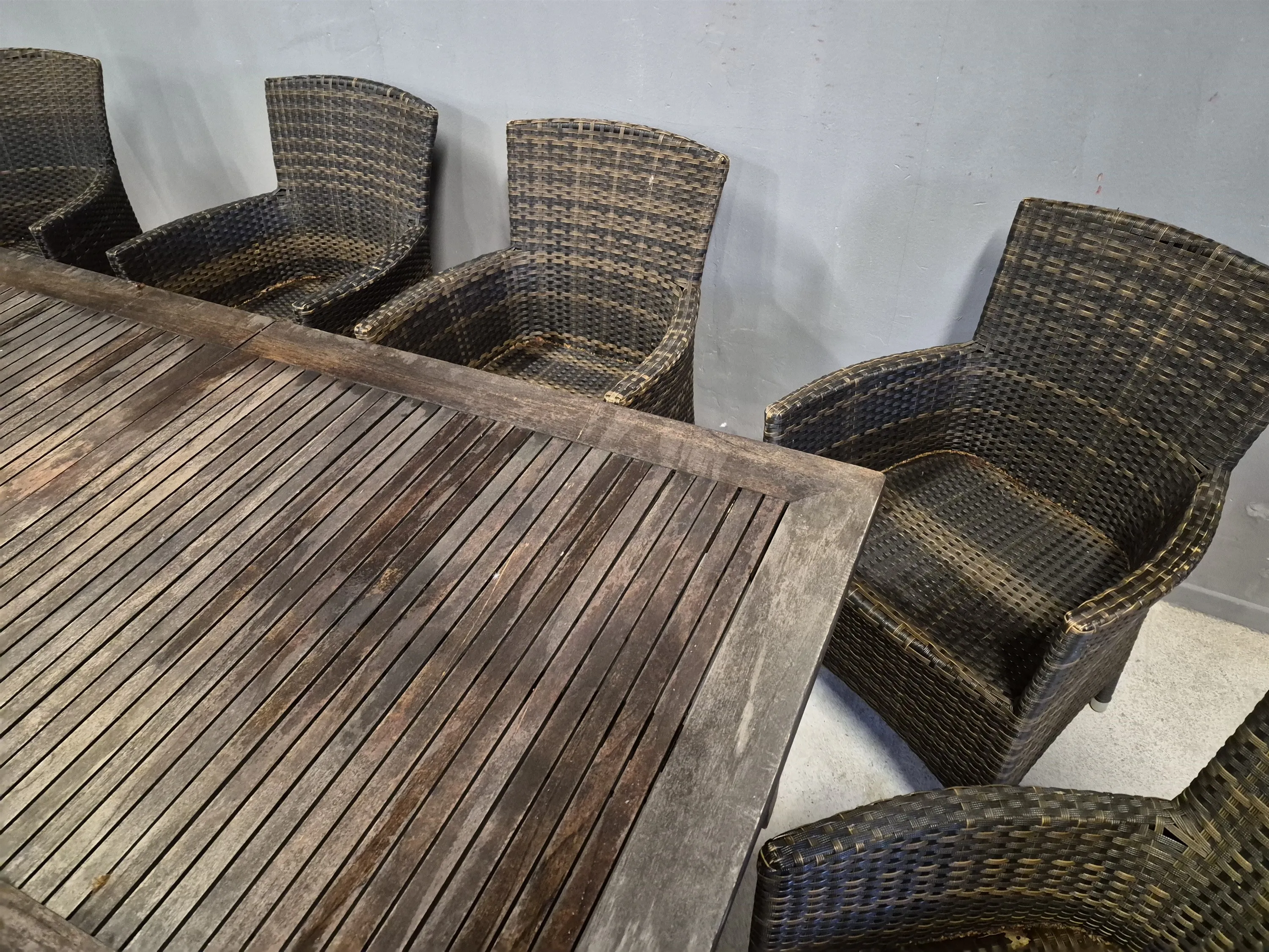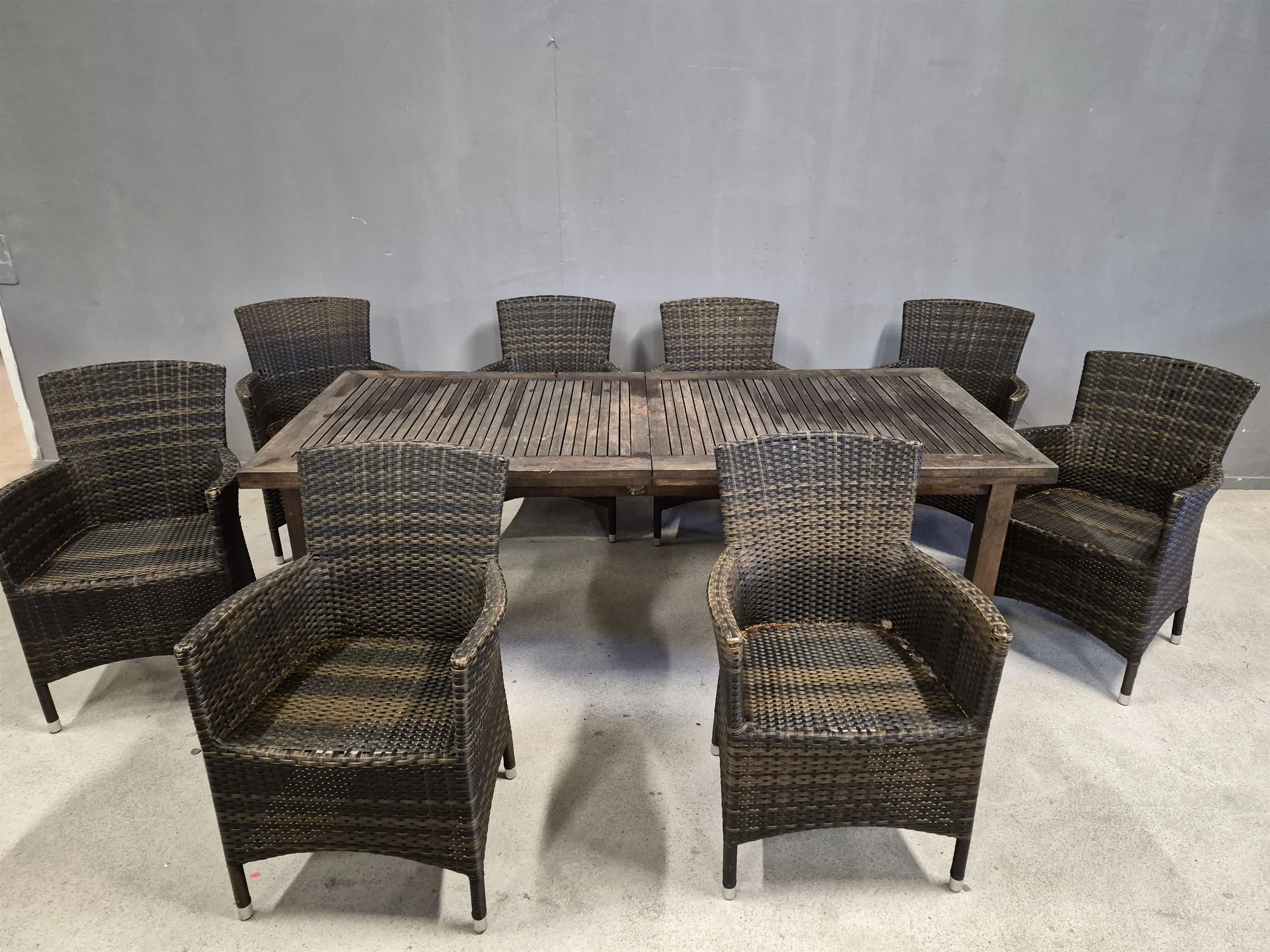 19256. Trädgårdsgrupp 9 del, konstrotting, höjd stol 85 cm, bord 73 cm, mått 200 x 90 cm