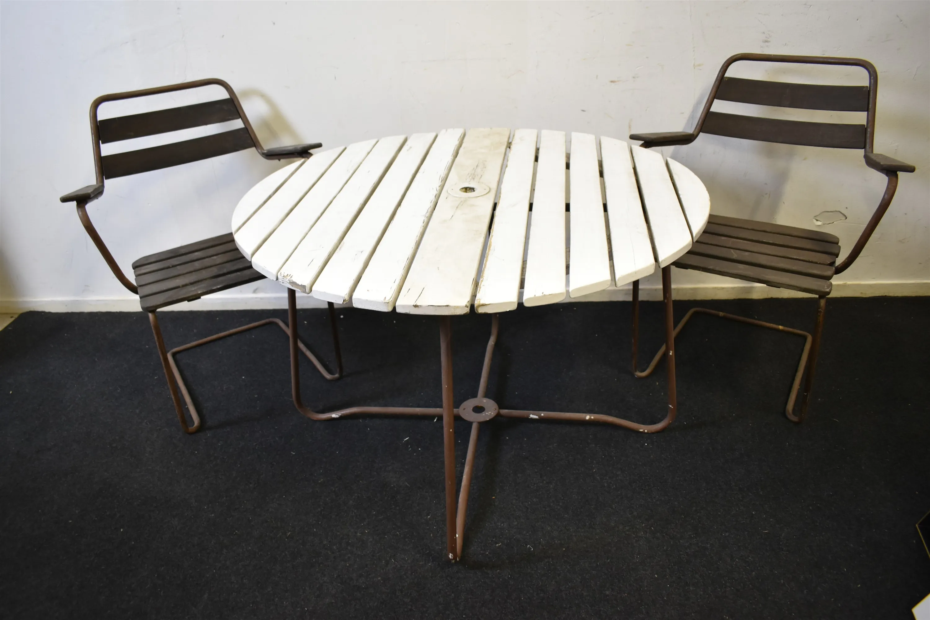 7767. Trädgårdsgrupp bord höjd 66 cm, diameter 102 cm, höjd stolar 80 cm