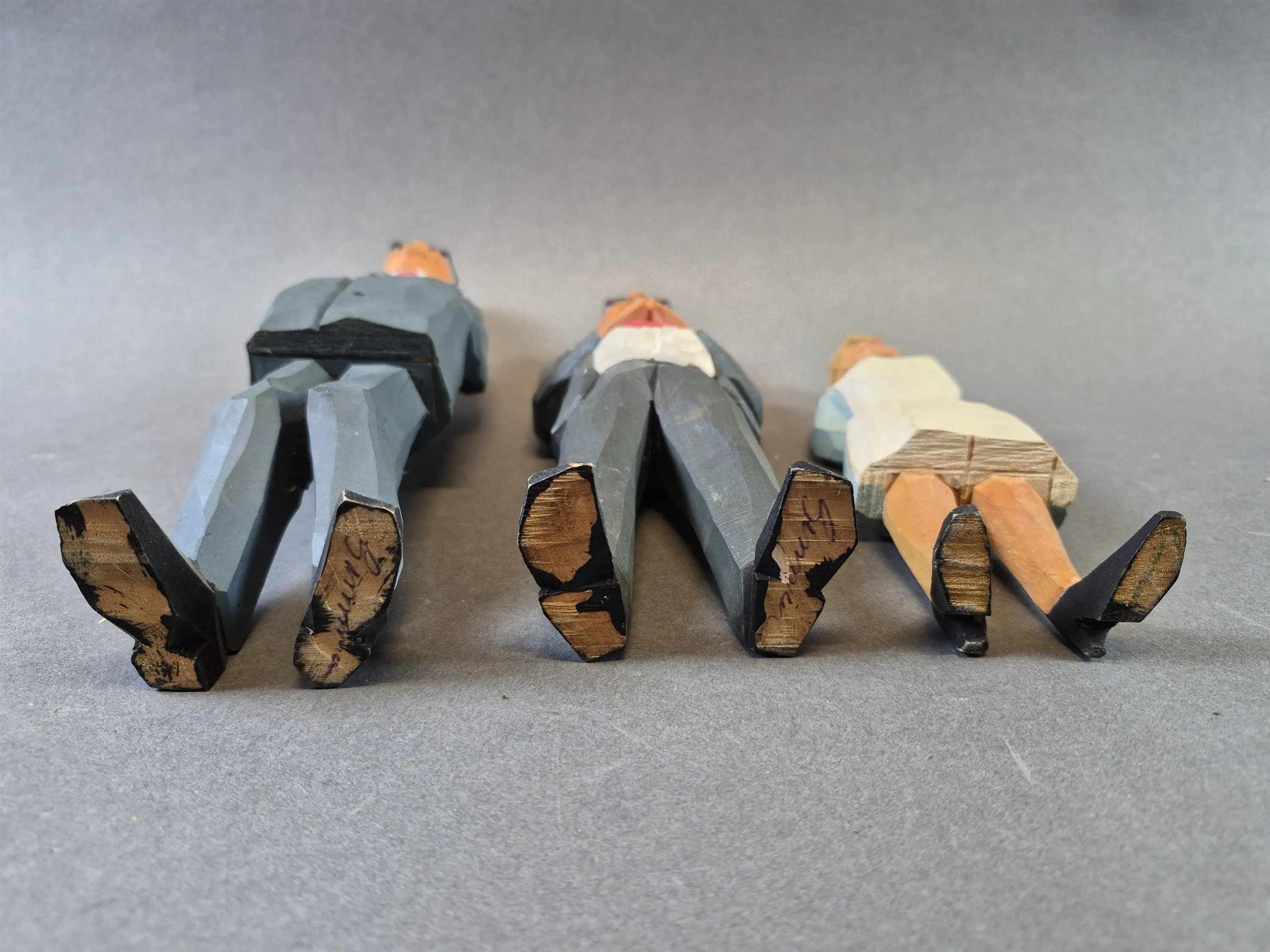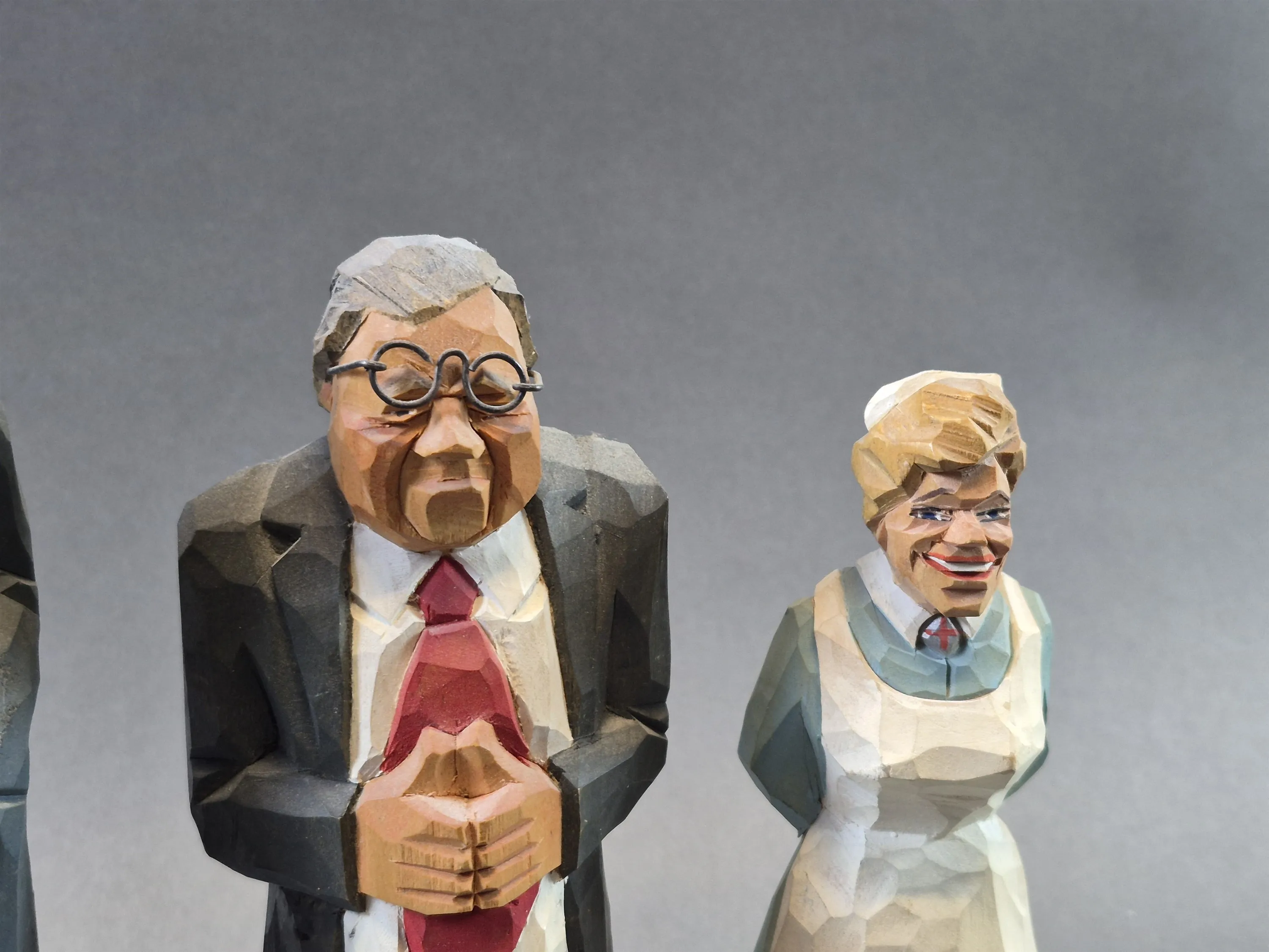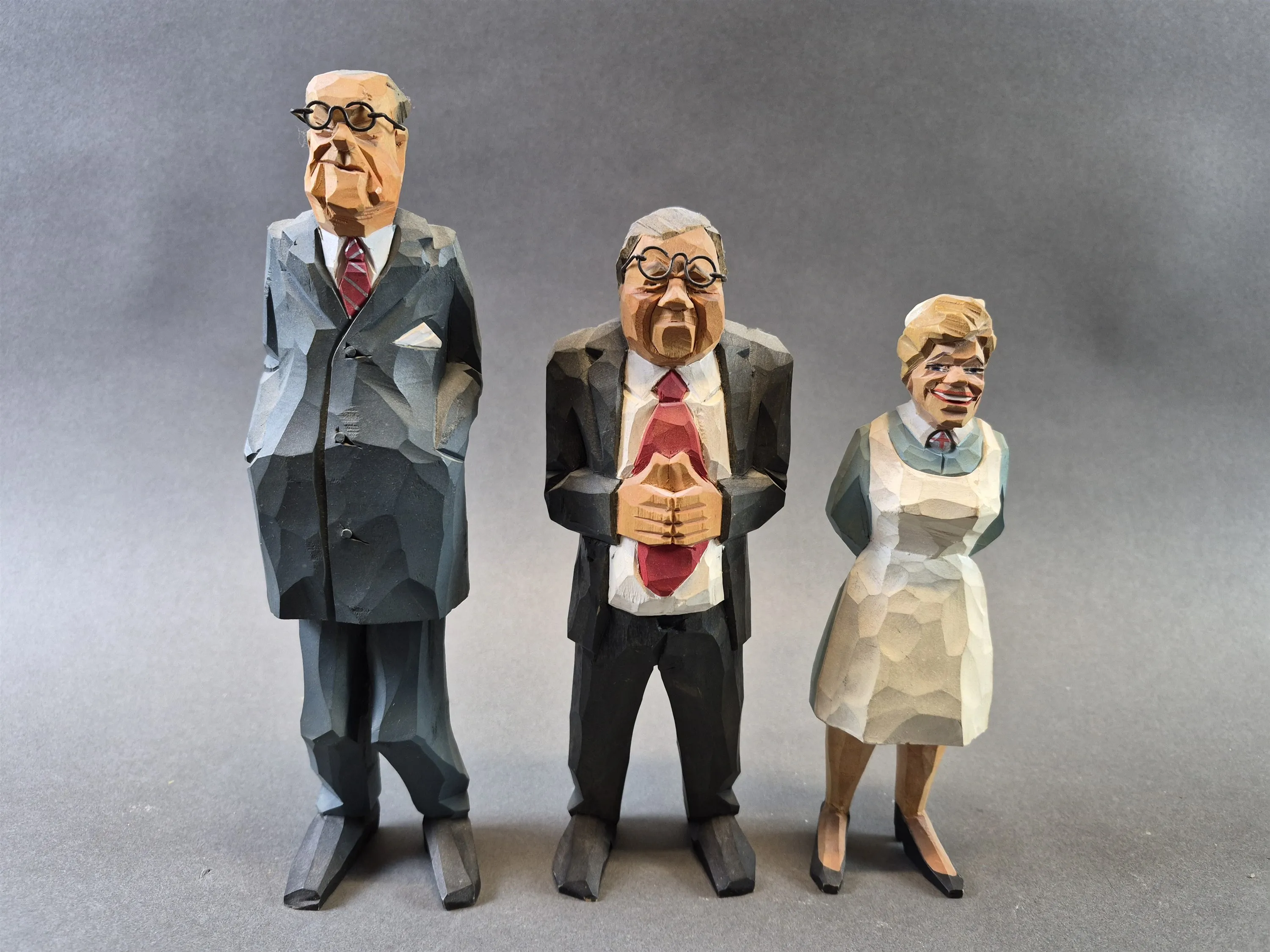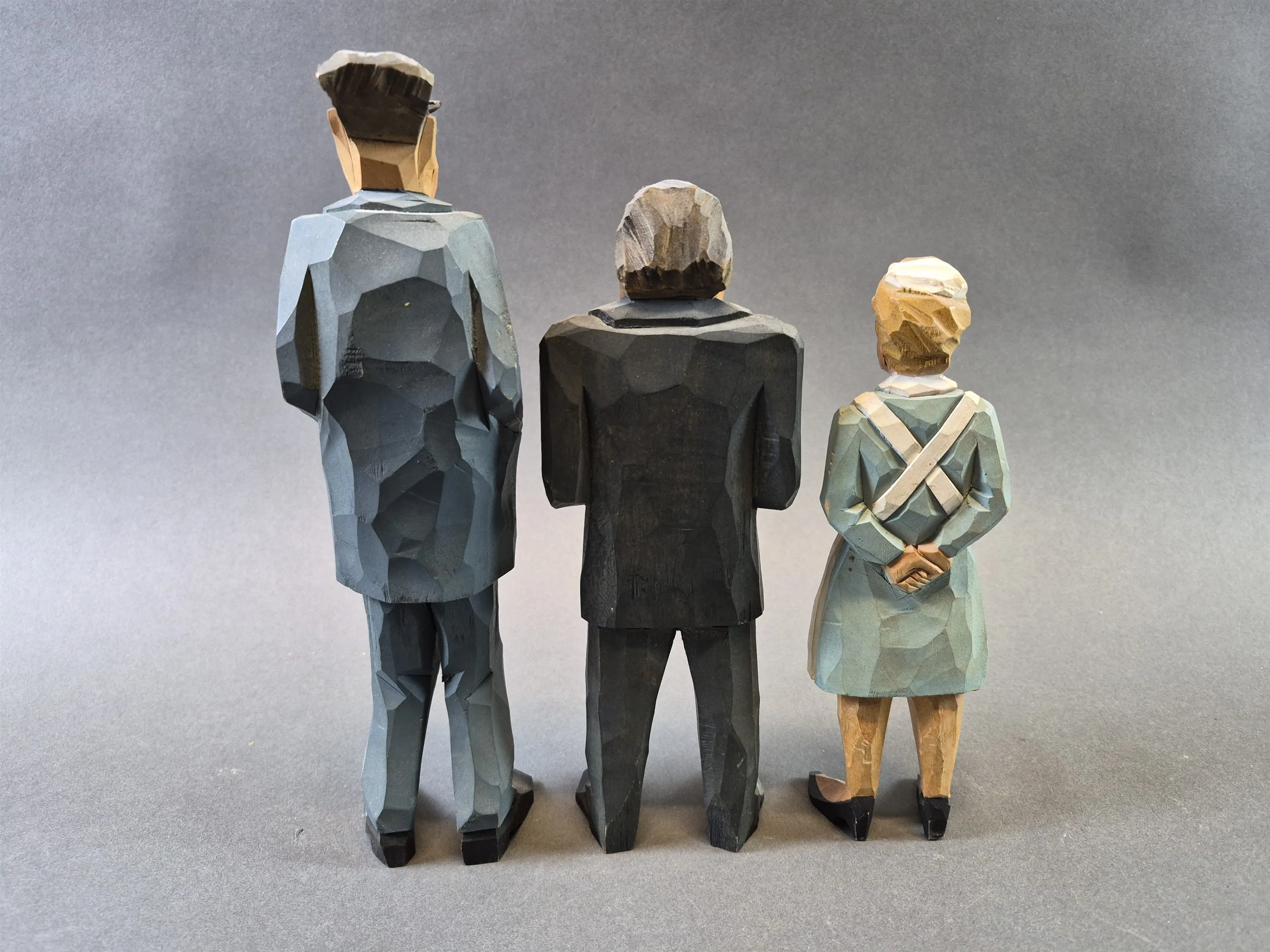 20432. Trägubbar och trägumma 3 delar; sjuksköterska och kostymgubbar, högsta höjd 24 cm