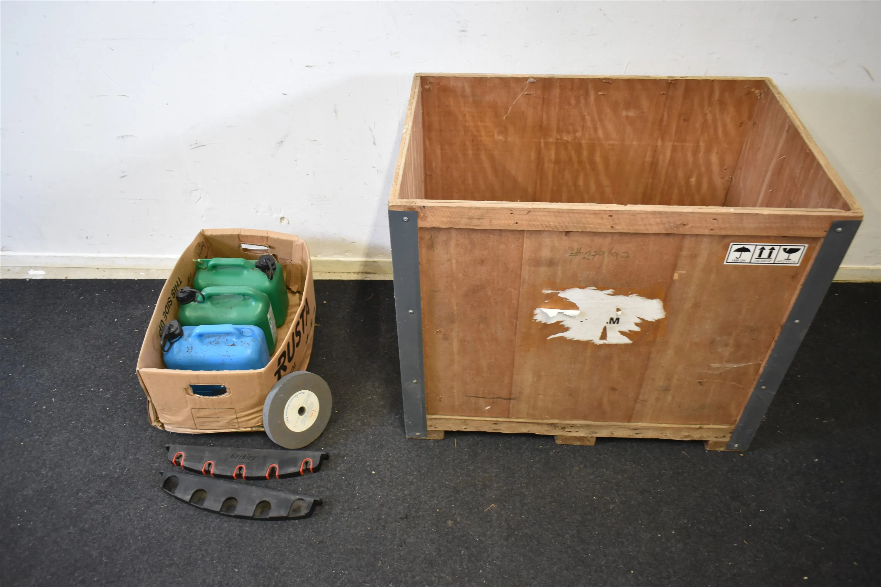 14224. Trälåda med bl.a dunkar & slipskiva mått låda höjd 77 cm mått 90 x 58 cm