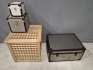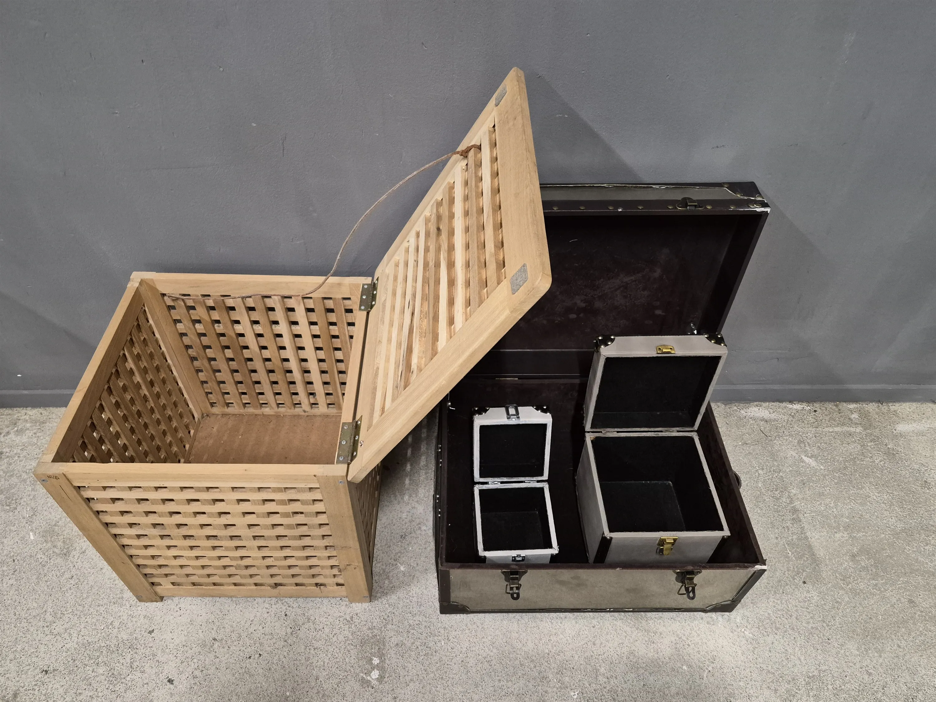 17586. Trälåda med lock & boxar 3 st högsta 50 cm