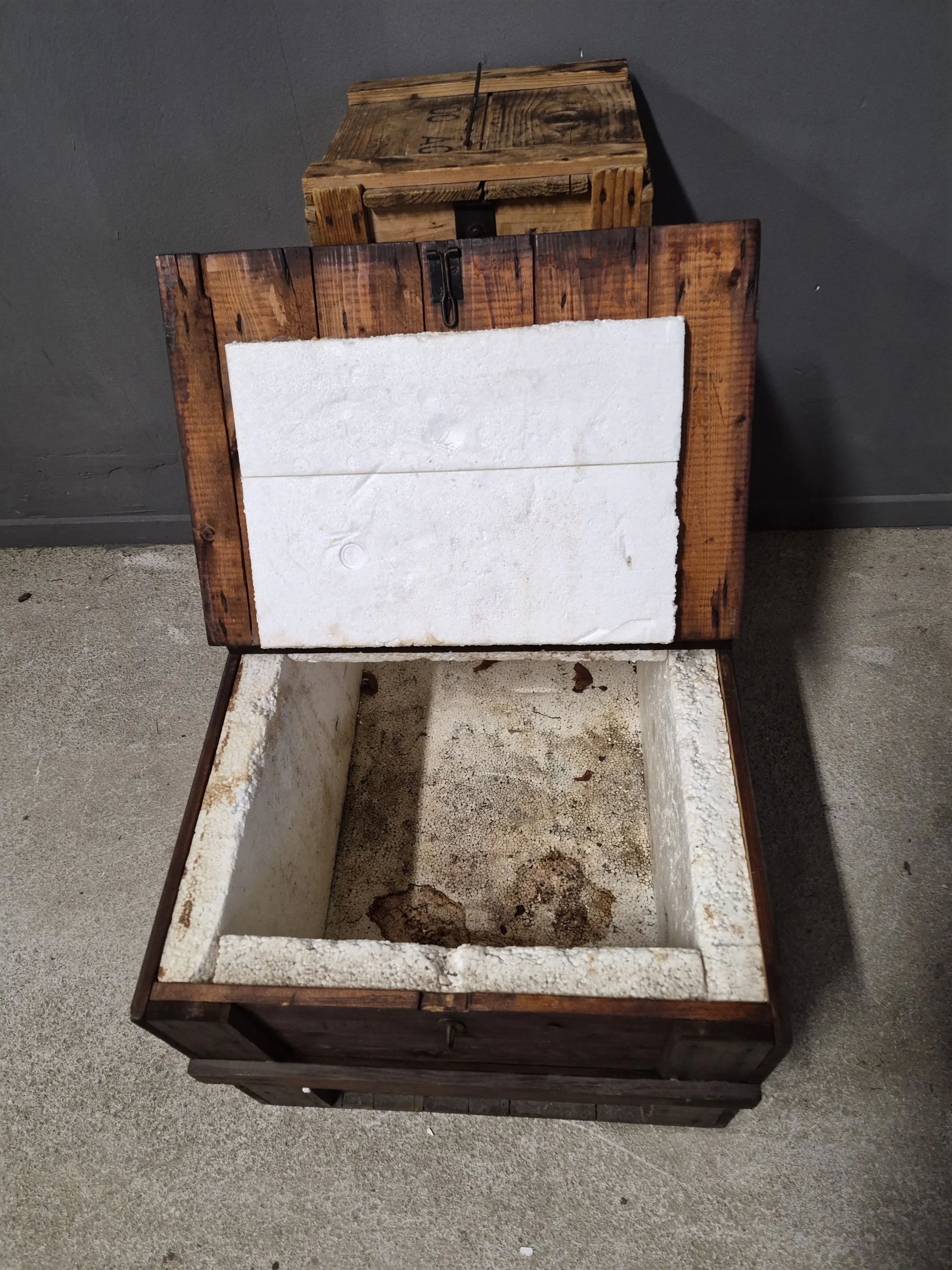 17376. Trälådor 2 st bl.a med frigolit, största mått 66 x 48 cm, höjd 39 cm