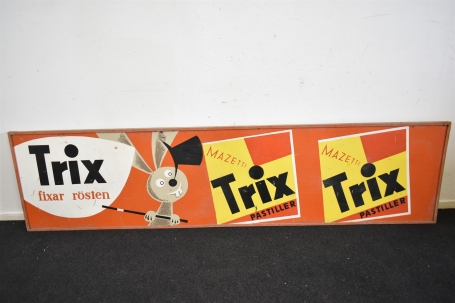 6265. Träskylt, Mazetti Trix Pastiller, längd 244 cm, höjd 62 cm