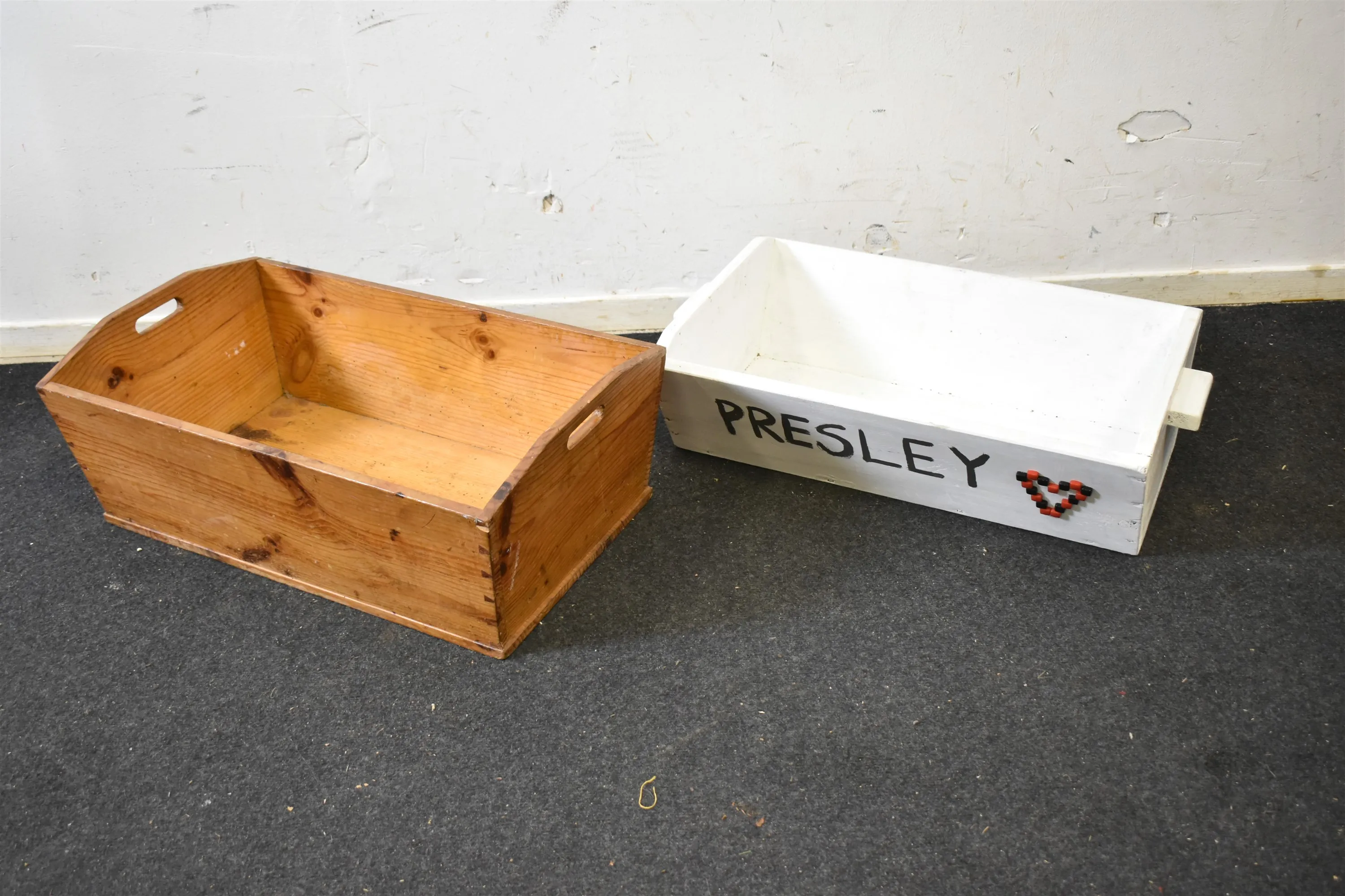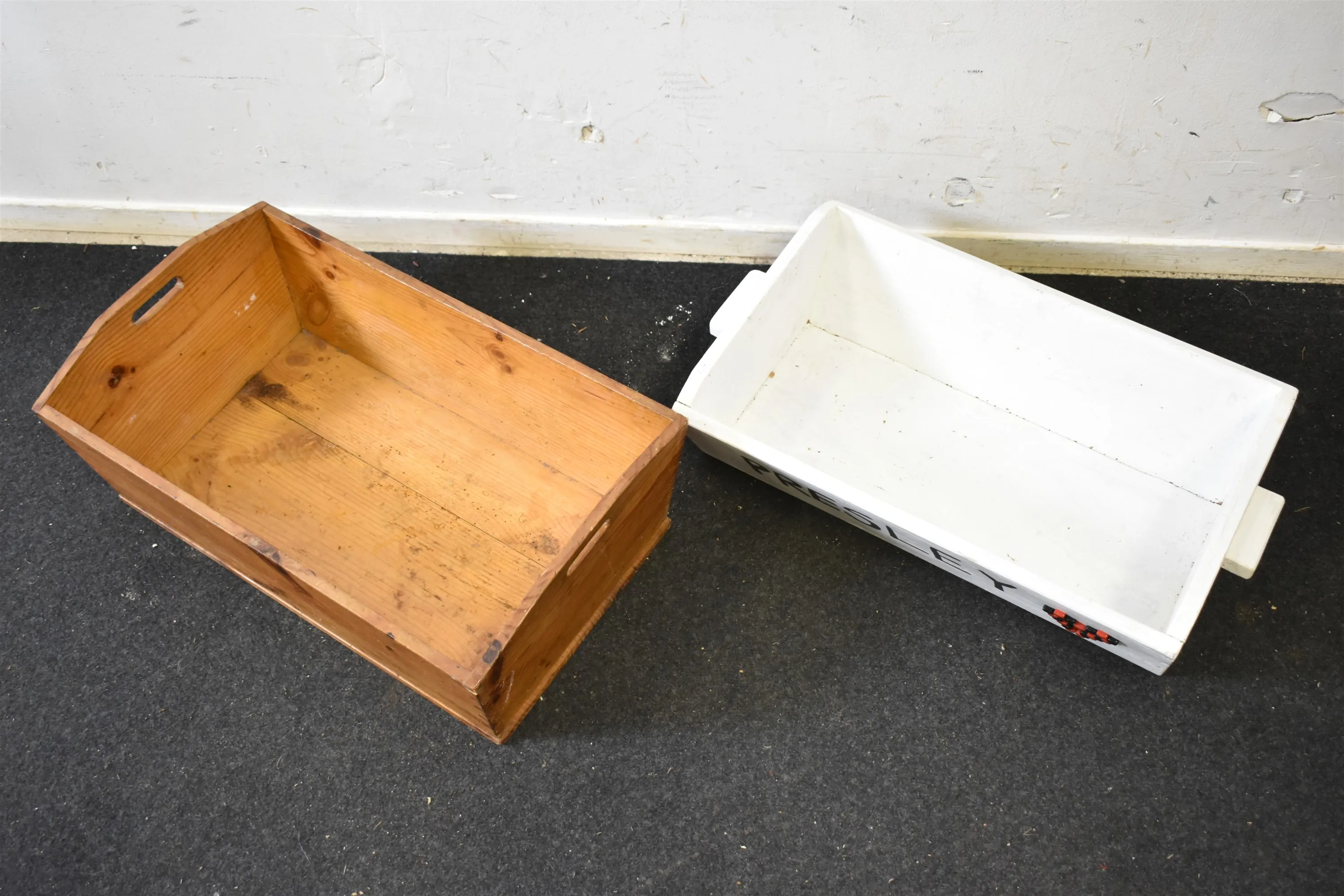 13718. Trätråg 2 st, furu och målad "Presley", längsta mått 65 cm