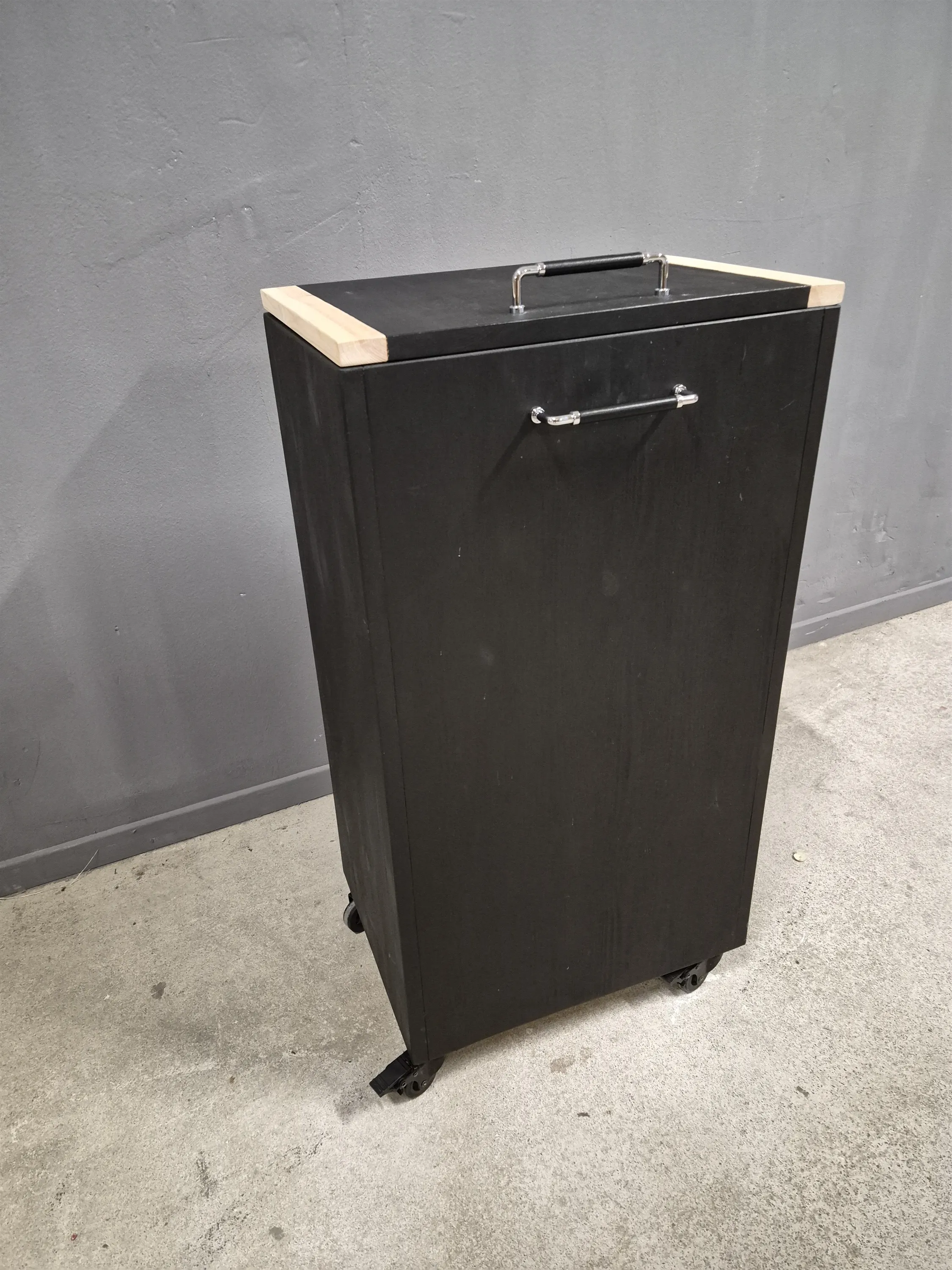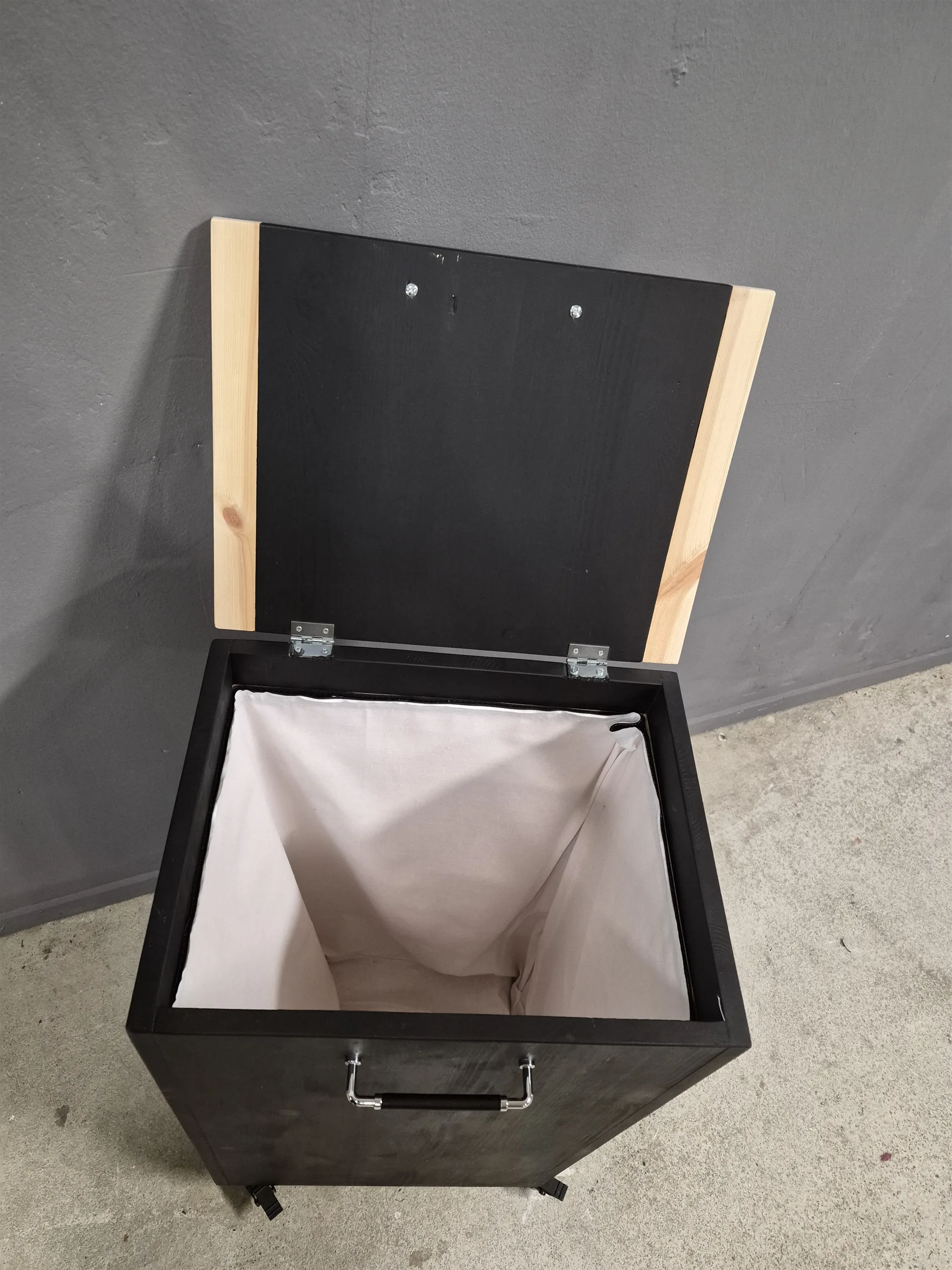 17478. Tvättkorg på hjul, trä, höjd 85 cm