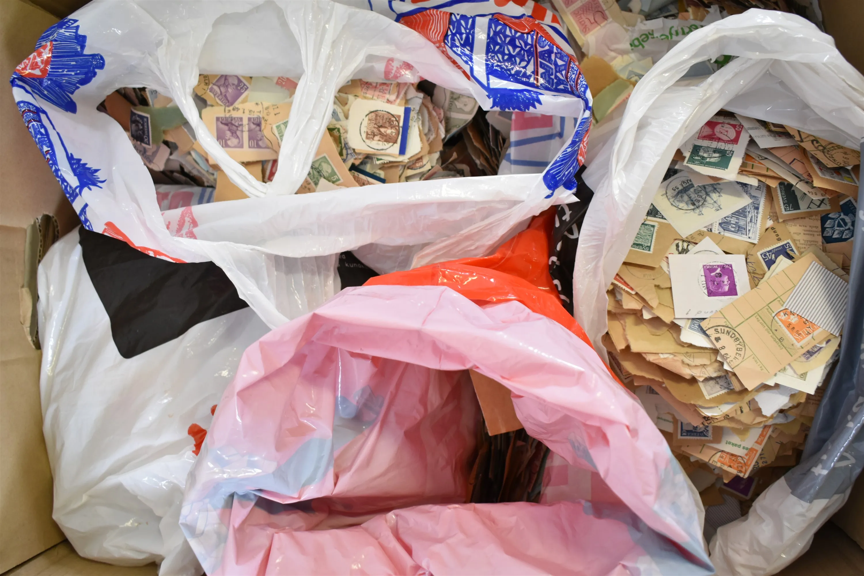 14168. Två flyttlådor frimärksklipp, Sverige, hela världen