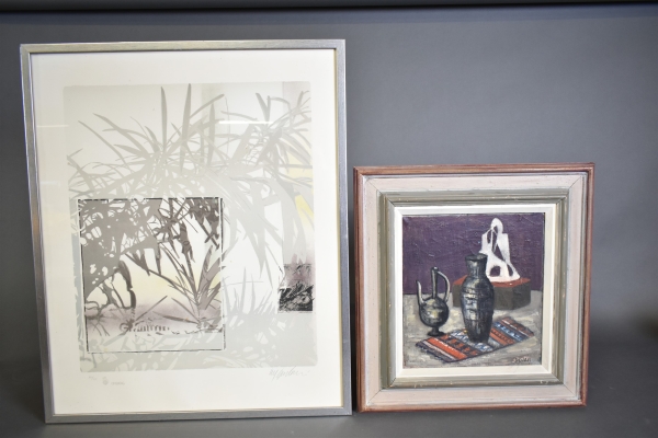 11463. Ulf Onsberg litografi och Olle Idewall olja på duk, stilleben, största mått 79x64 cm