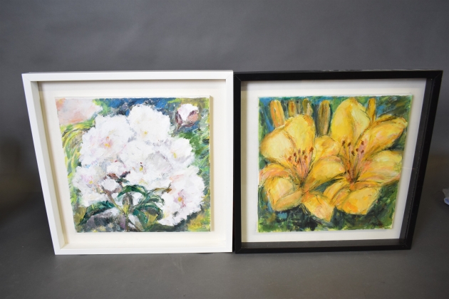 13935. Ulla-Britt Bejhav, oljor 2 st, Blomsterstilleben, mått 52 x 52 cm